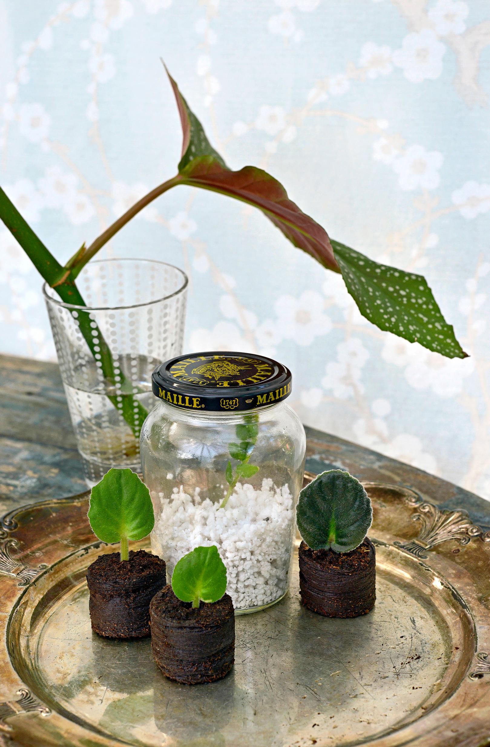 Pistokkaita voi juurruttaa lasipurkissa, jonka pohjalla on kosteaa perliittiä. Laita pistokkaat rouheeseen, sulje kansi tiiviisti ja nosta astia valoisaan paikkaan. Purkissa uusi tulokas pärjää ilman hoitoa ja välttyy muista kasveista leviäviltä tuholaisilta.
