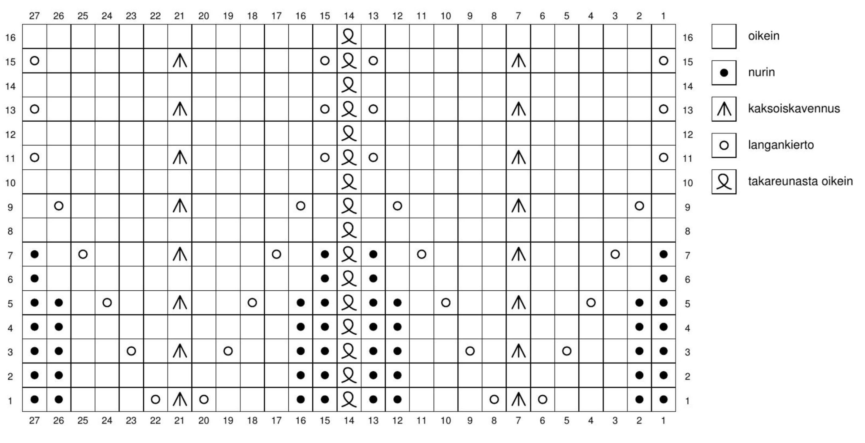- 2. puikko: 2 n, 2 o, 2 n, 1 tr o, 2 n, 2 o, 2 n, 1 tr o (14 s).