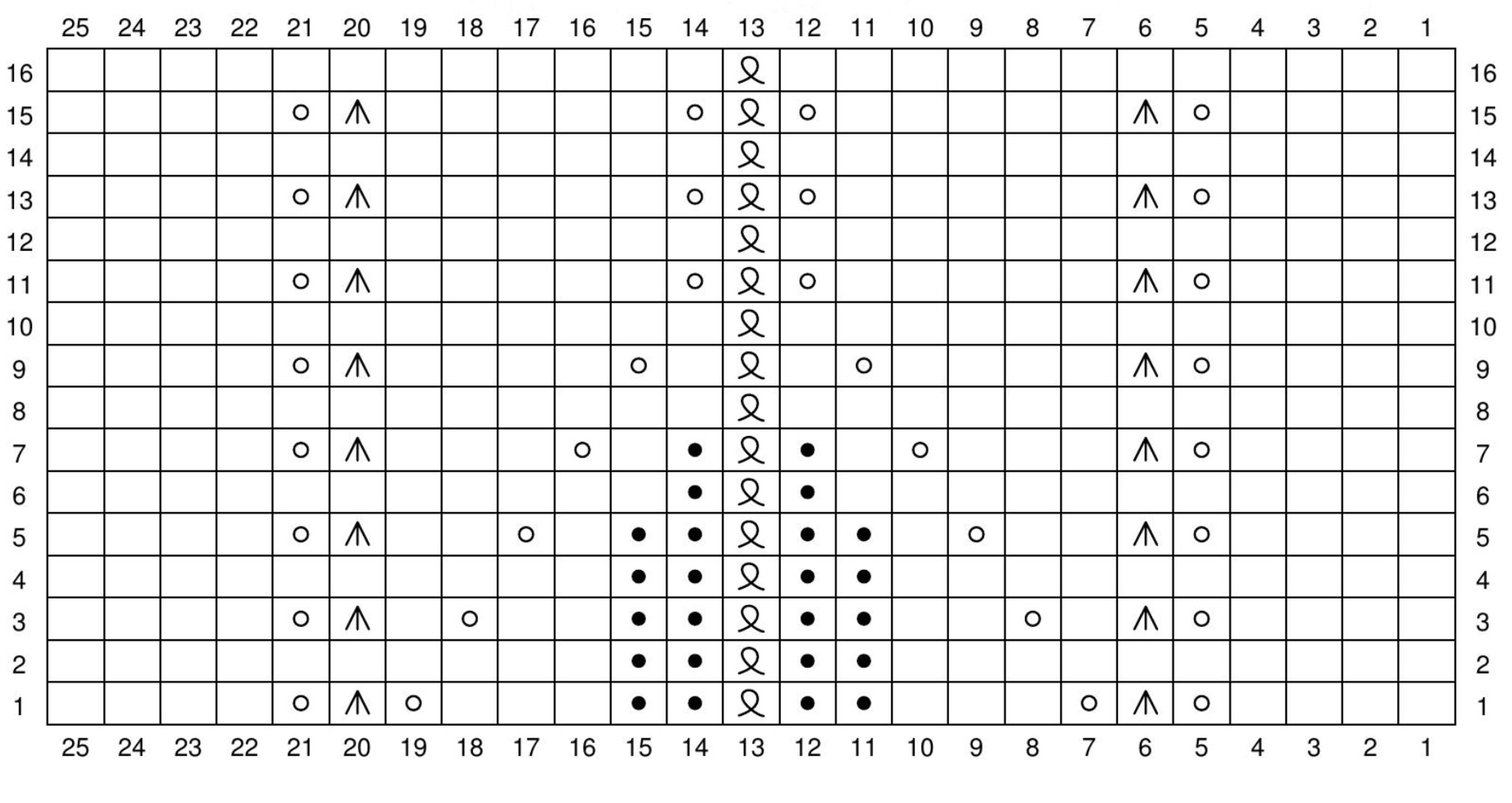 7. Kiilakavennukset: 1. krs: Neulo o, kunnes 1. puikon lopussa on 2 s jäljellä, neulo ne o yhteen. Jatka 2. ja 3. puikolla kaavion B mallikerran mukaan, sekä 4. puikon alussa ssk, loput s:t oikein. 2. krs: 1. ja 4. puikolla oikein, 2. ja 3. puikolla kaavion B mukaan. Toista kaavion B krs:ia 1–16 ja kiilakavennuksia joka toisella krs:lla, kunnes työssä on 12-13-12-12 s.
