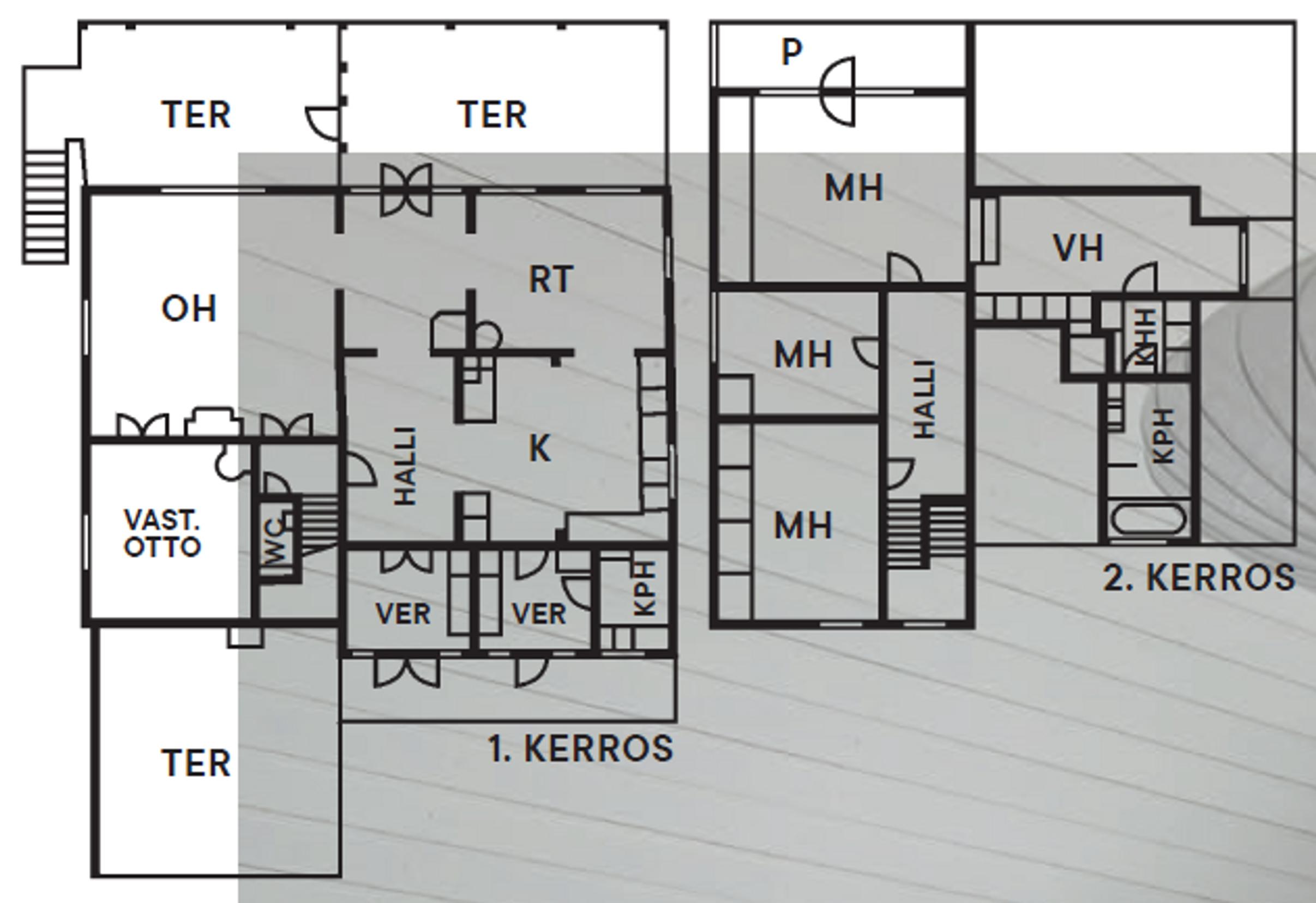 huonejako. Arkkitehti Eero Lundénilla oli hyvinkin selkeät sävelet pohjaratkaisuun ja laajennusosaan. Seiniä ei kaadettu mistään, mutta ovien aukotuksia ja tilojen toiminnallisuuksia muutettiin. Nykyisen keittiön tilalla olivat aiemmin kylpyhuone ja sauna. Kapeahkoon laajennusosaan saatiin mahdutettua kylpyhuone sekä arki- ja vieraseteinen.