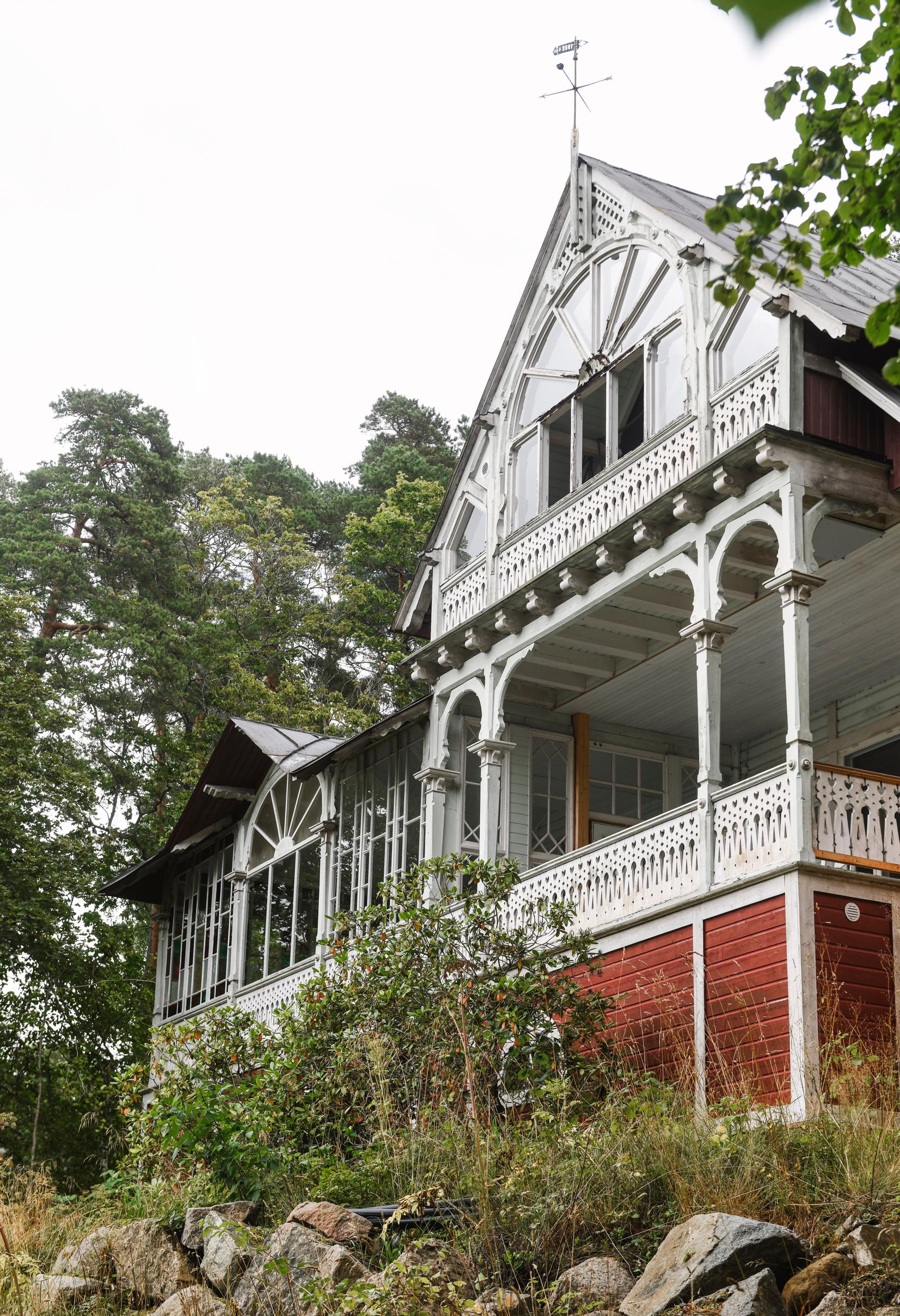 Koti Kirjekuoritehtailija Evert Nylundin 1894 rakennuttama pitsihuvila Villa Tallbo Turun Hirvensalossa. Neliöitä on 250.