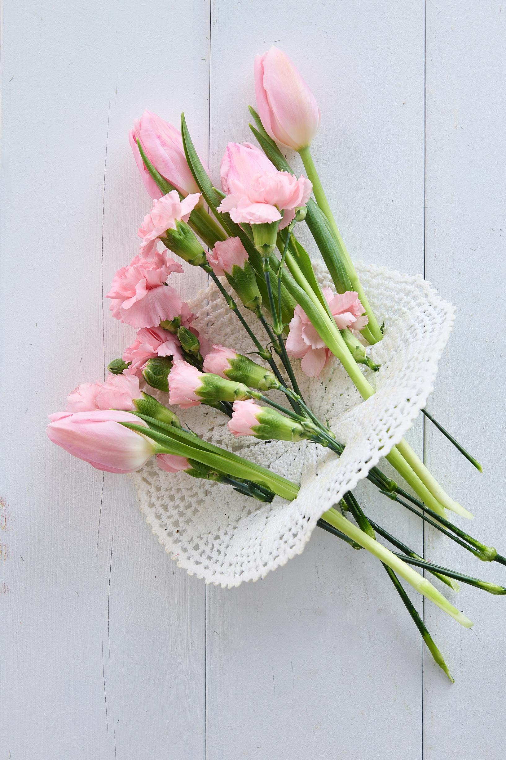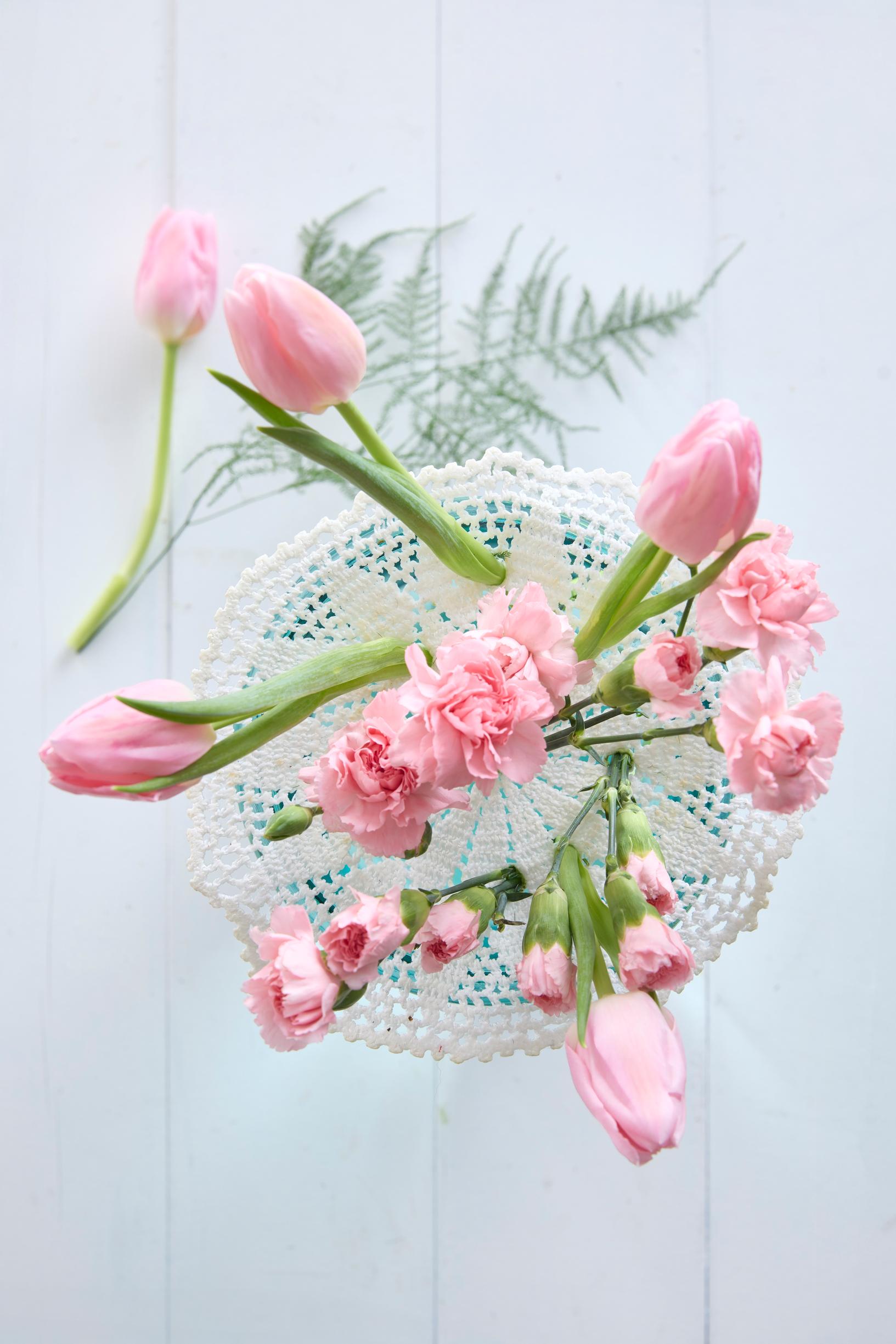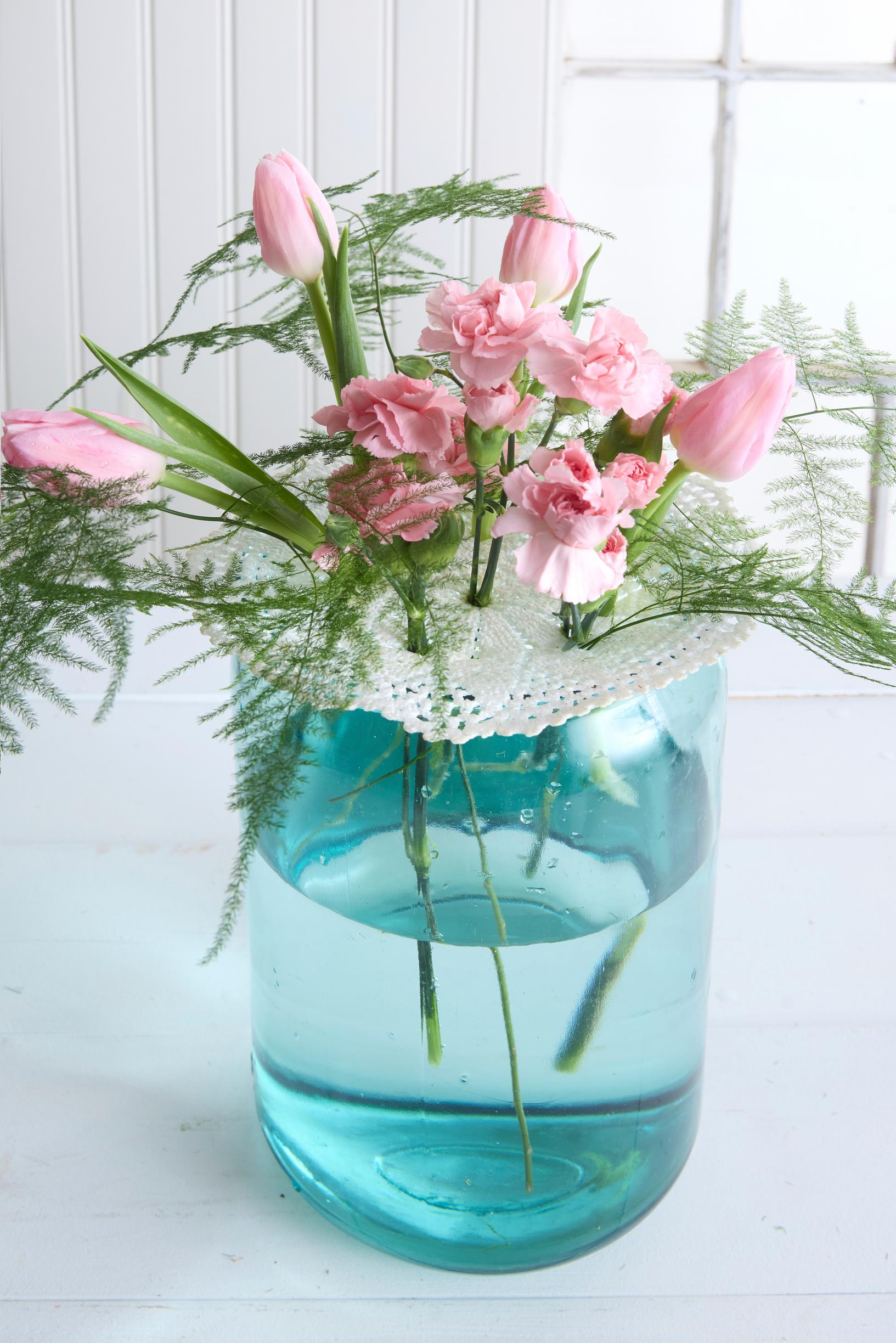 - Aseta liina maljakon päälle ja pistele kukat liinan läpi.