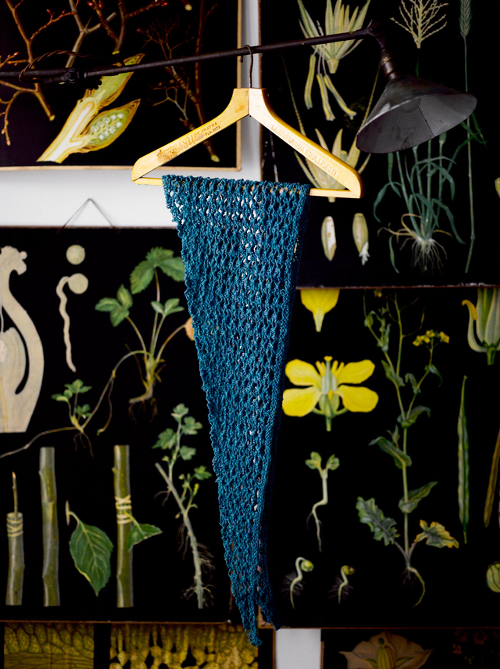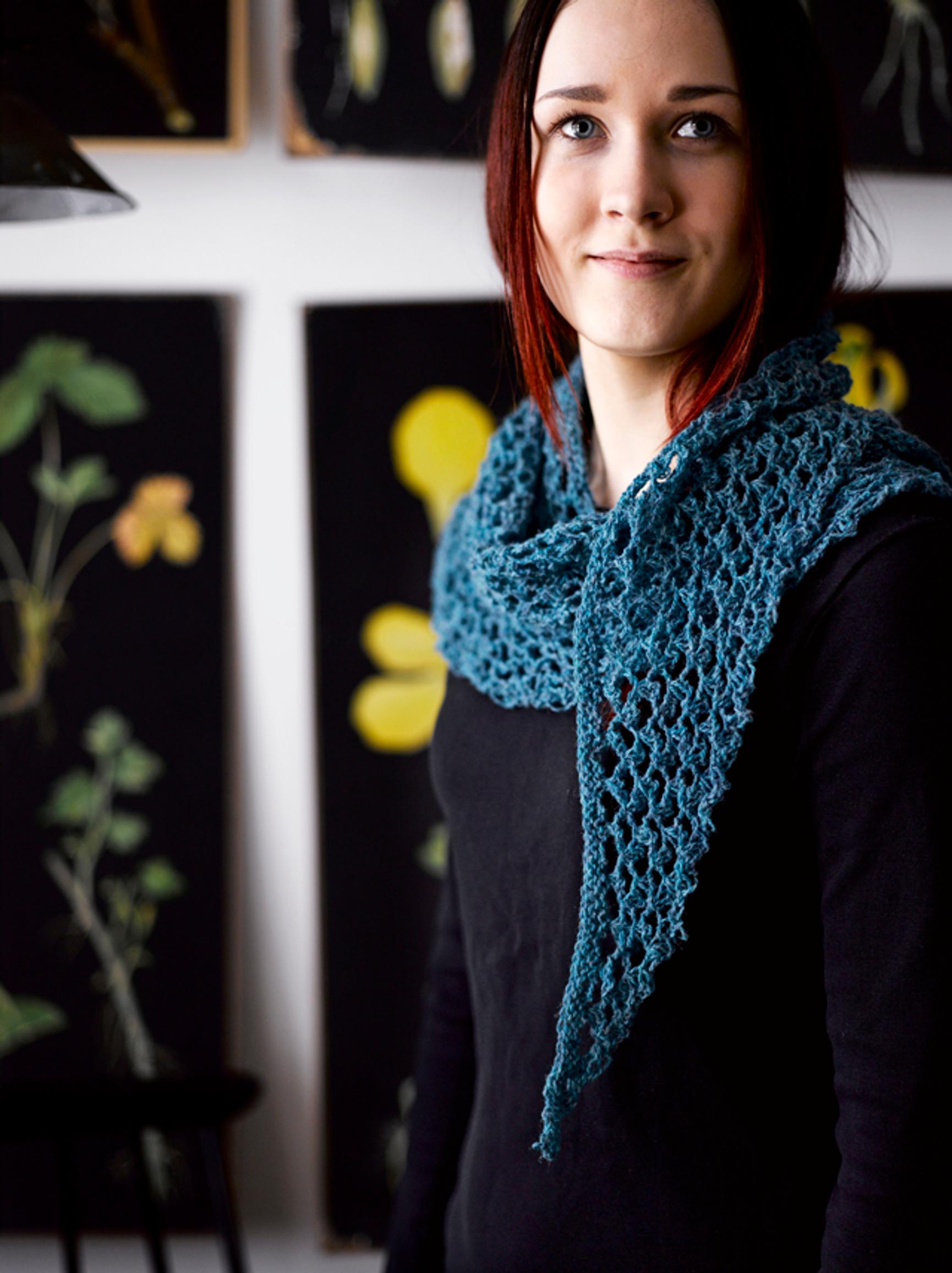 Pitsineuleen neulominen ja kolmiohuivin silmukkalisäykset vaativat tarkkaavaisuutta, mutta vain kolme kerrosta käsittävään mallineuleeseen pääsee nopeasti sisälle.