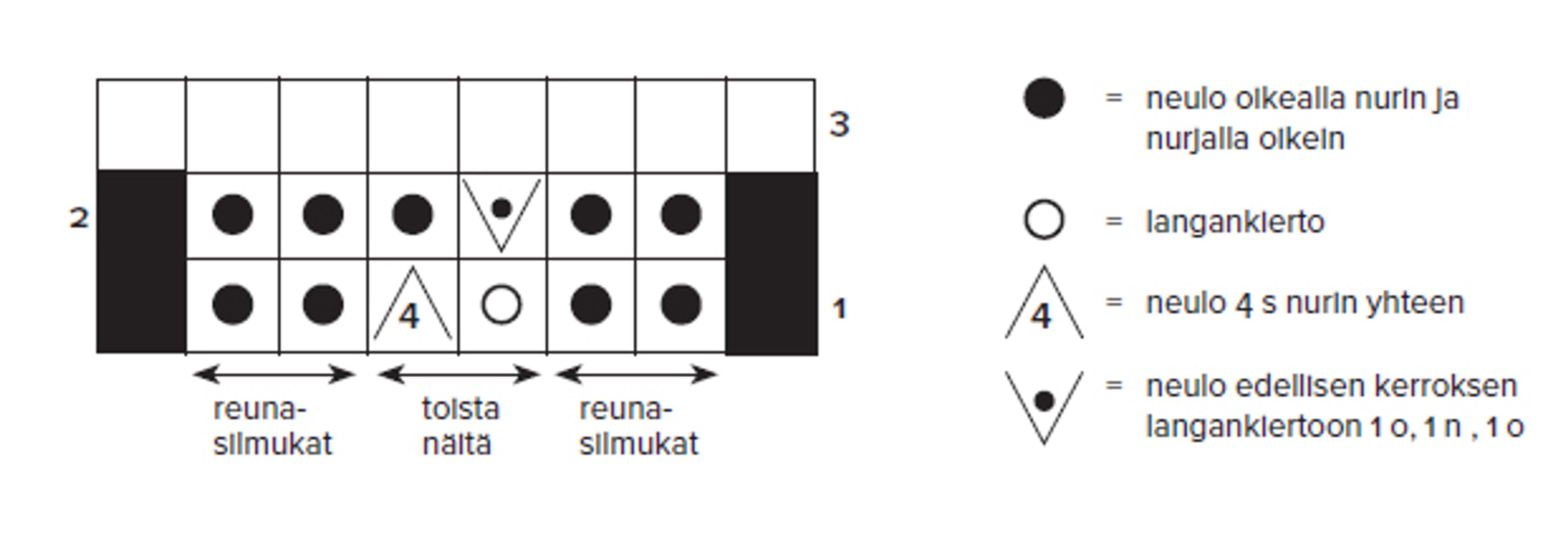 3. Neulo 6. krs: vaihda työhön suurempi puikkokoko ja neulo mallineuleen 3. krs:n mukaan kaikki s:t oikein = työssä on 16 s. Neulo 7. krs: lisää työhön puikon alussa 4 s. Neulo mallineuleen 1. krs:n mukaan 4 s nurin, 2 s nurin, *tee lk, neulo 4 s nurin yhteen*, toista *–* vielä 2 krt, neulo 2 s nurin. Neulo 8. krs: lisää työhön puikon alussa 4 s. Neulo mallineuleen 2. krs:n mukaan 4 s oikein, 2 s oikein, *neulo 1 s oikein, tee edellisen krs:n langankiertoon 1 o, 1 n, 1 o*, toista *–* vielä 2 krt, neulo 2 s oikein, neulo 4 s oikein. 9. krs: vaihda työhön suurempi puikkokoko ja neulo mallineuleen 3.krs:n mukaan kaikki s:t oikein = työssä on 24 s. 10. krs: lisää työhön puikon alussa 4 s. Neulo mallineuleen 1. krs:n mukaan 4 s nurin, 2 s nurin, *tee lk, neulo 4 s nurin yhteen*, toista *–* vielä 4 krt, neulo 2 s nurin. 11. krs: lisää työhön puikon alussa 4 s. Neulo mallineuleen 2. krs:n mukaan 4 s oikein, 2 s oikein, *neulo 1 s oikein, tee edellisen krs:n langankiertoon 1 o, 1 n, 1 o*, toista *–* vielä 4 krt, neulo 2 s oikein, neulo 4 s oikein. 12. krs: vaihda työhön suurempi puikko koko ja neulo mallineuleen 3. krs:n mukaan kaikki s:t oikein = työssä on 32 s.