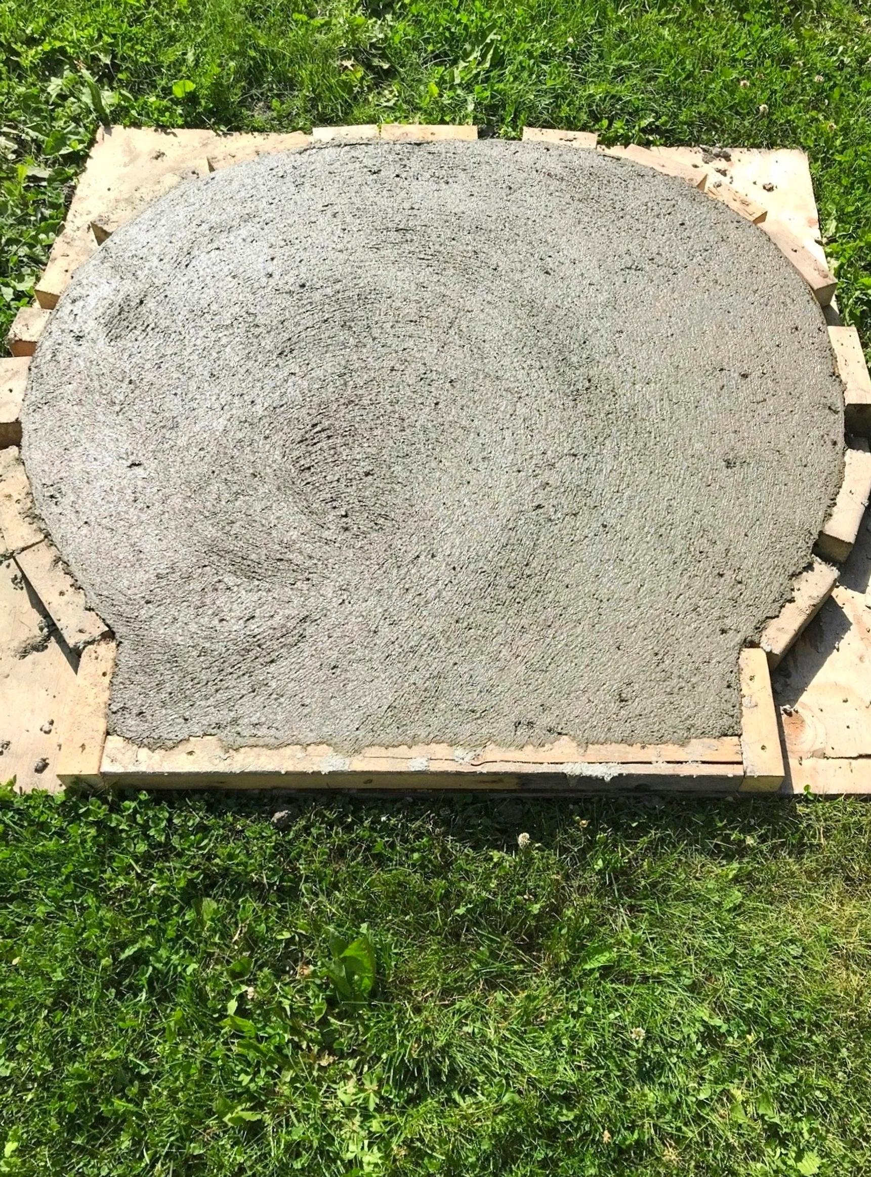 3. Vala betonivalu alustalle. Tarvitset betonia noin 50 litraa pussin ohjeiden mukaan sekoitettuna. Täytä muotti ja suuosa. Hierrä pinta betonihiertimellä, jätä pinta karheaksi. Anna kuivua noin 3 päivää, kunnes taso on pintakuiva ja vaalea.