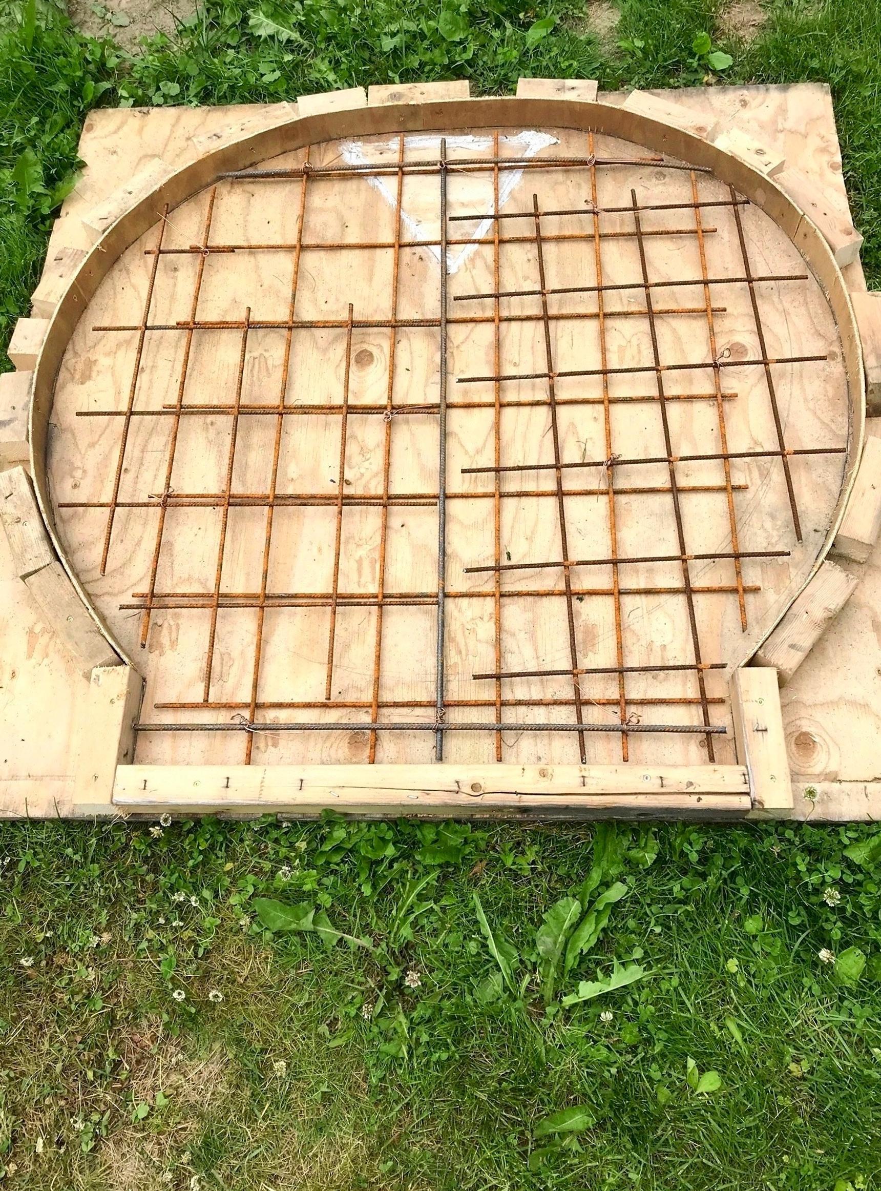 2. Valmista betonialusta tasaisella pohjalla, josta se lähtee helposti irti. Jännitä vaneripaloilla kovalevysuikaleesta uunin kokoinen kaari muotiksi. Heitä keskelle pieniä kiviä ja asettele päälle teräsverkkoa niin, että se ei ota alustaan kiinni.