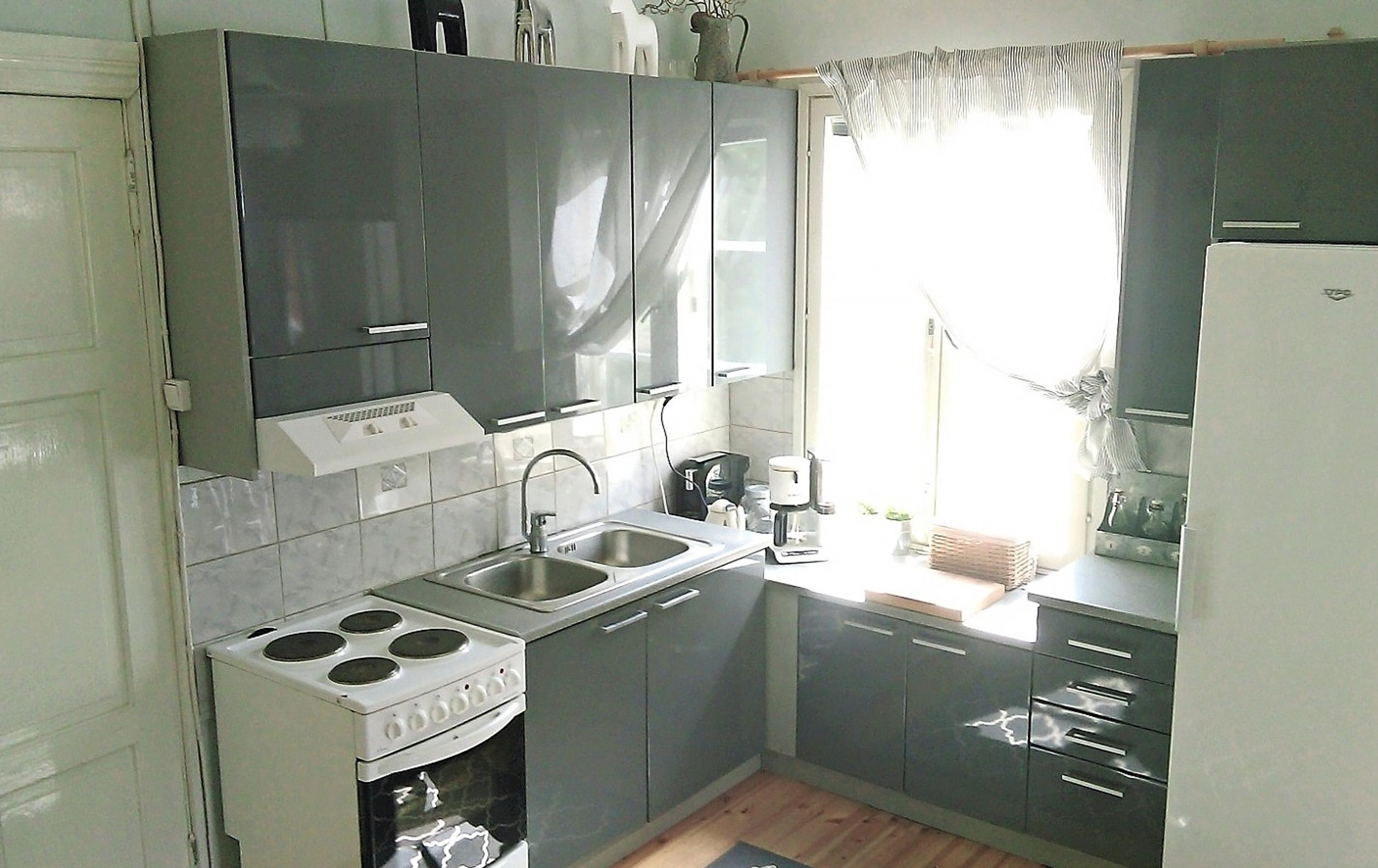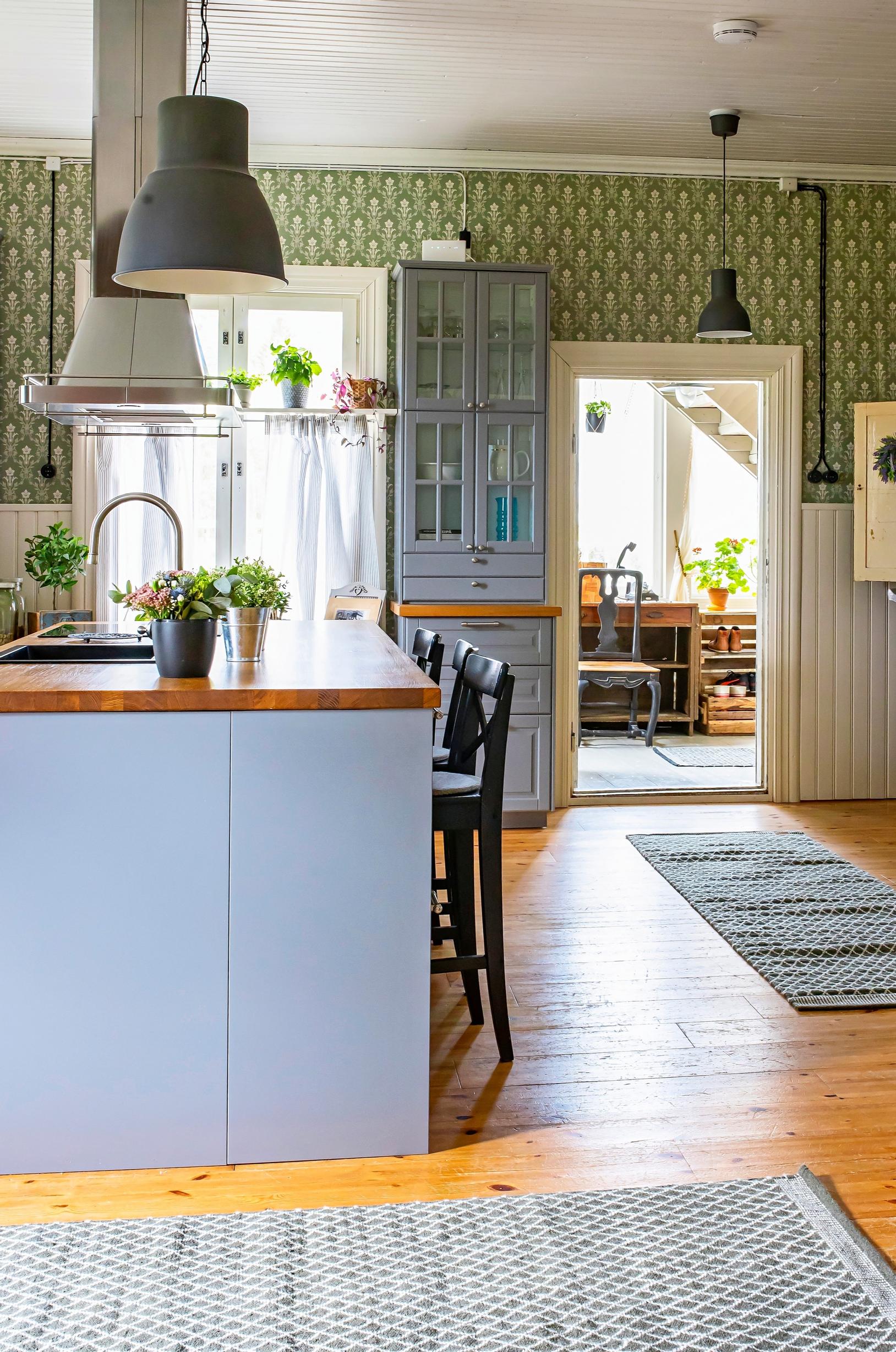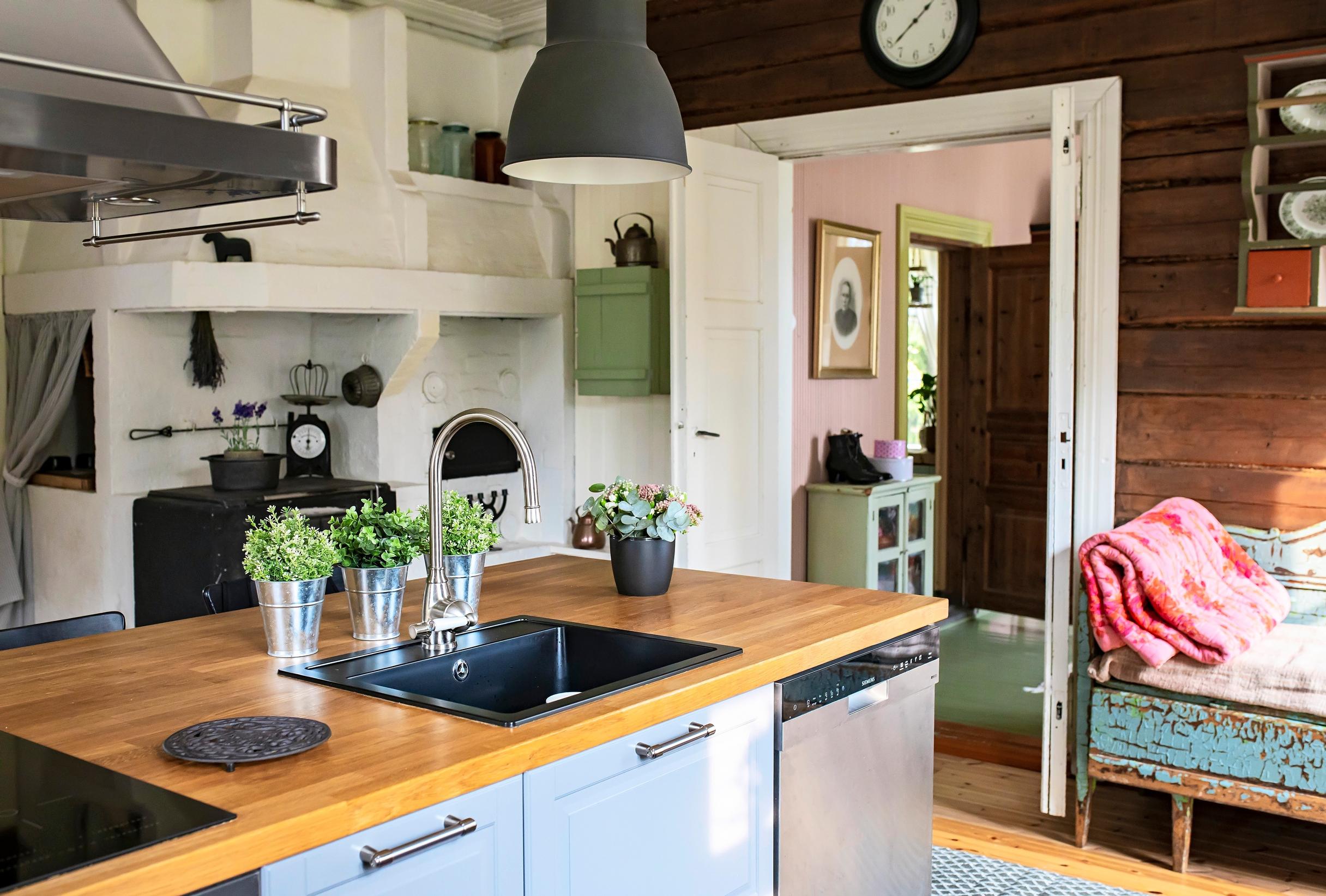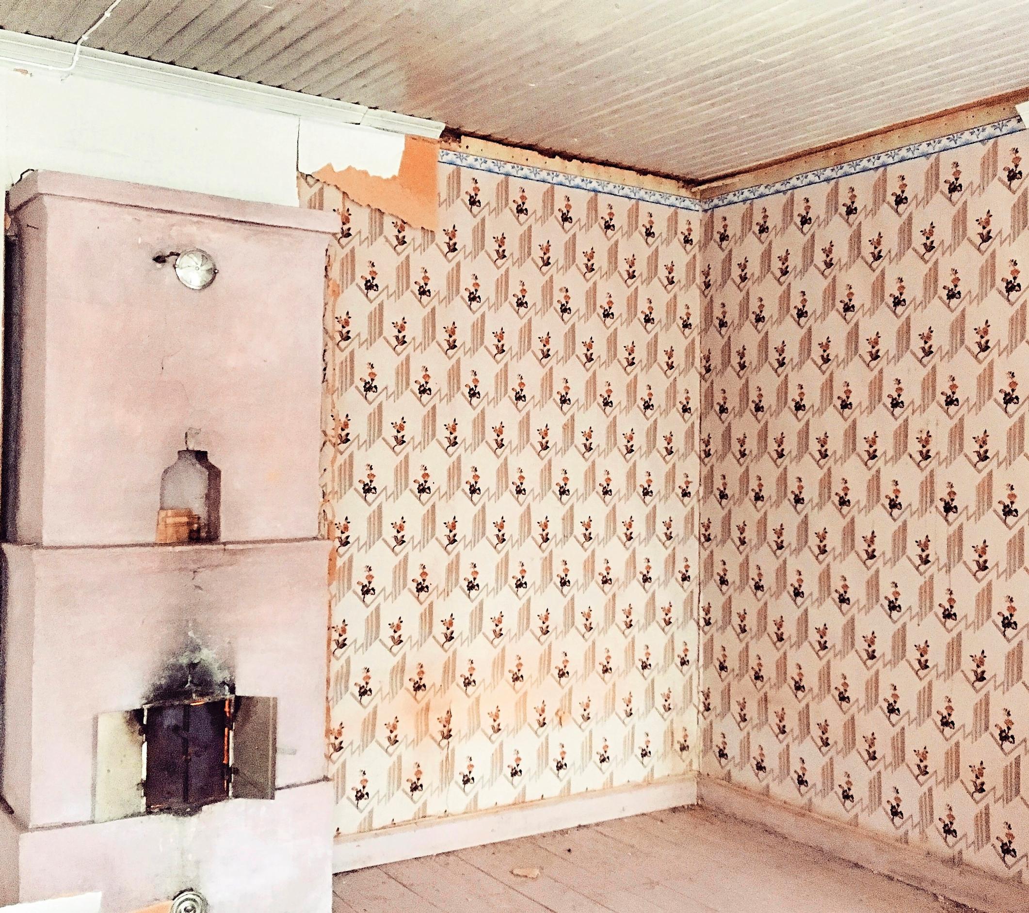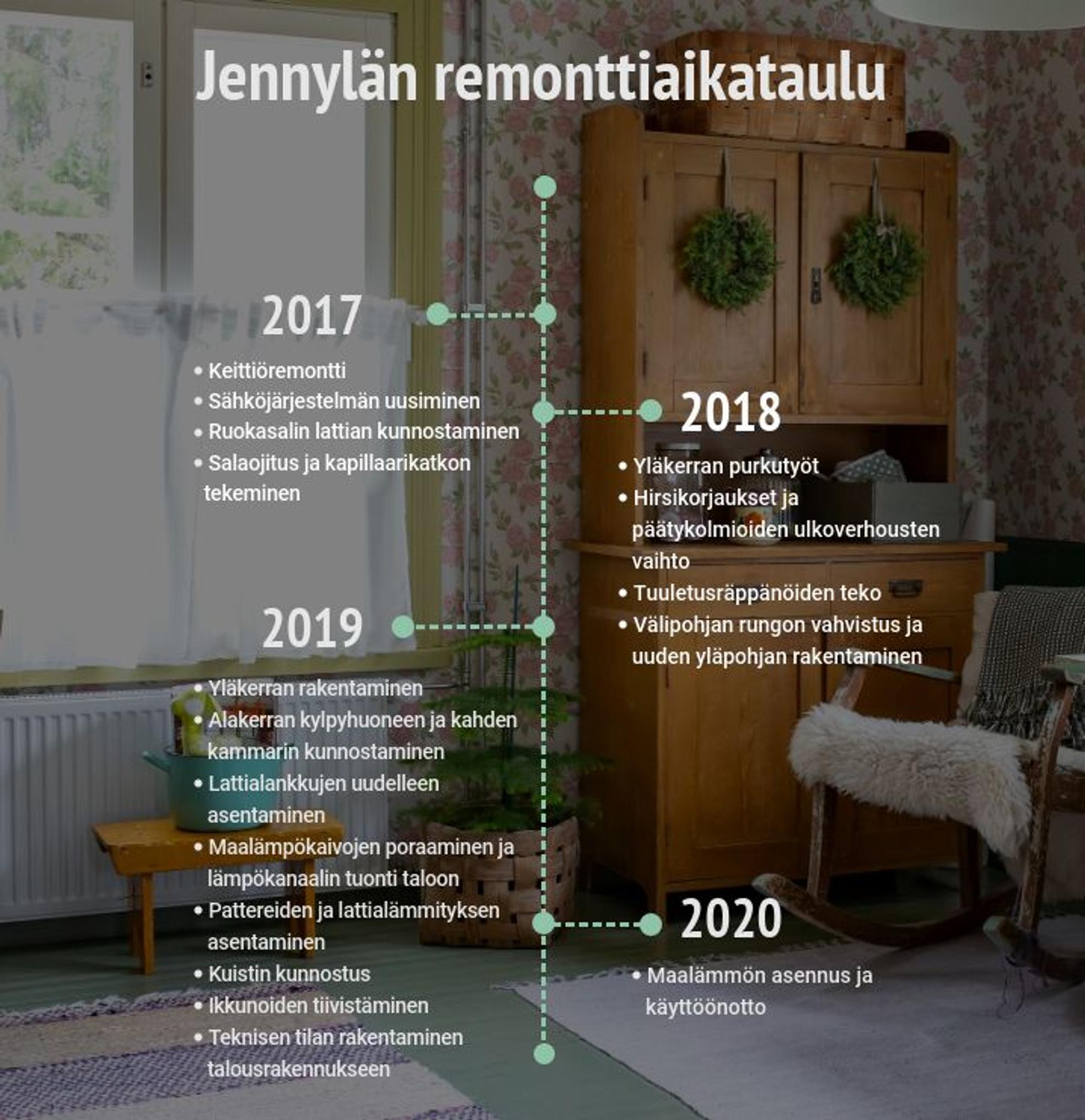 Kolme vuotta kestänyt projekti aloitettiin heinäkuussa 2017 keittiöremontilla. Vanhat kaapistot ja kodinkoneet olivat jo aikansa eläneet ja säilytystilaakin kaivattiin lisää. Lattiat avattiin, eristeet vaihdettiin, seinät levytettiin ja hirret tilkittiin.