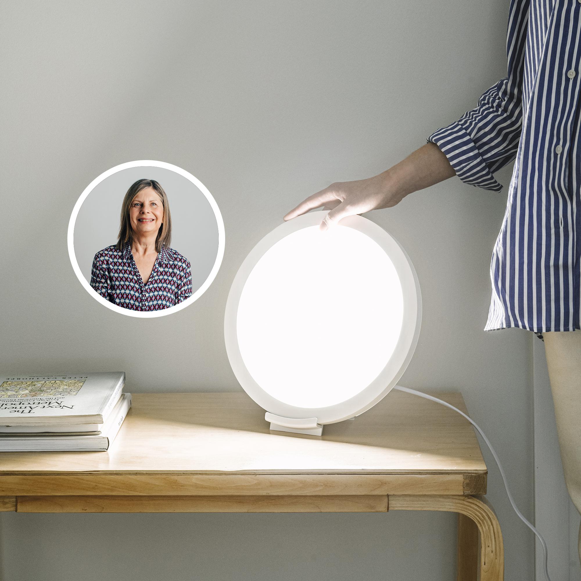 Minulla on kotona kotimaisen Innoluxin Rondo Air -kirkasvalolamppu (halk.30 cm), jonka voi sijoittaa keveytensä takia hyvin myös siroon seinähyllyyn. Kirkasvalolampun käytössä on oleellista oikea hoitoetäisyys. Rondo Airia suositellaan pidettäväksi 55 cm:n päässä kasvoista.