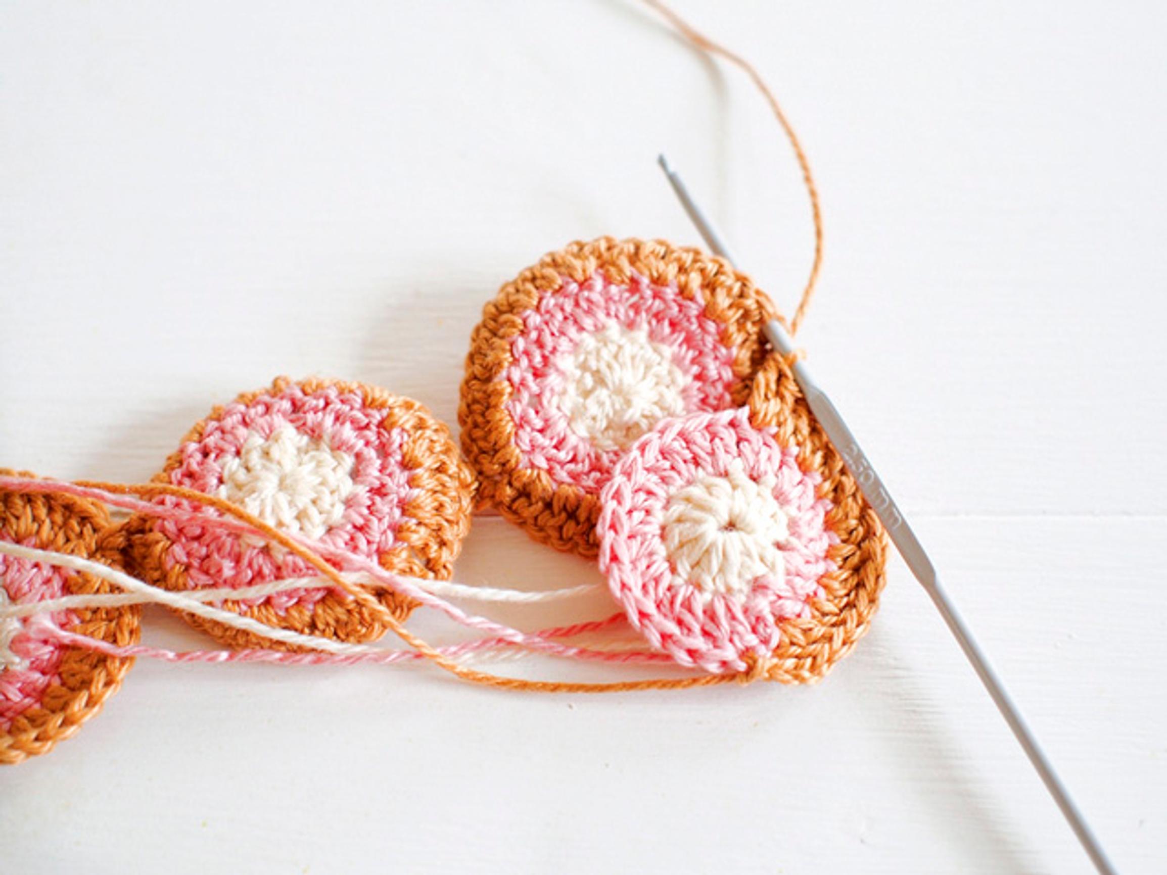 Tiheys ei tässä työssä ole tärkeää, mutta virkkaa silmukat niin napakasti, että saat kauniin tasaisen tuloksen. Tässä esimerkiksi isoäidinneliön koko on 5,5 cm ja pyörylän halkaisija on 4,5 cm.
