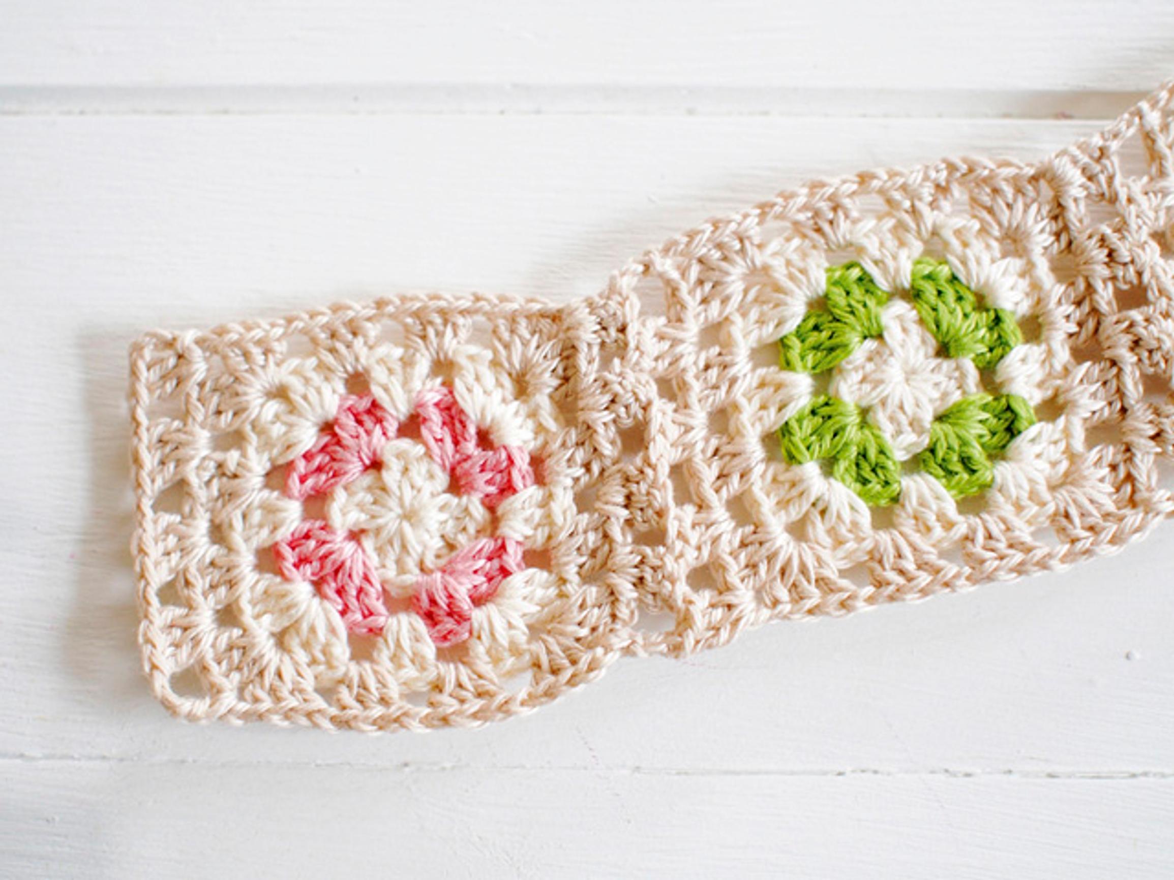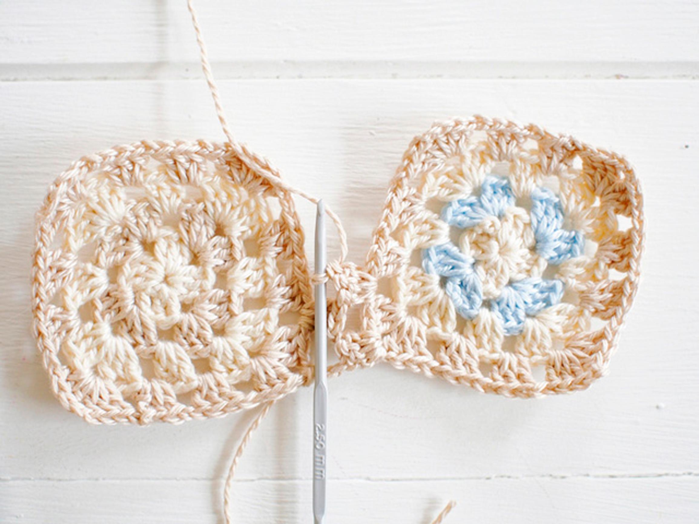 Yhdistä isoäidin ruudut virkkaamalla, kummallekin sivulle tarvitaan 3 neliön pätkä ja 5 neliön pätkä. Virkkaa ruudut yhteen: laita 2 ruutua oikeat puolet vastakkain, kiinnitä lanka ja virkkaa molempien ruutujen läpi: 3 kjs (= 1. p), virkkaa sitten *2 kjs, 3 p allaolevaan 2 kjs-kaareen*, toista. Työssä on siis 4 kpl 3 p:n ryhmiä ja yksi 1 p:n. Päätä langanpäät.