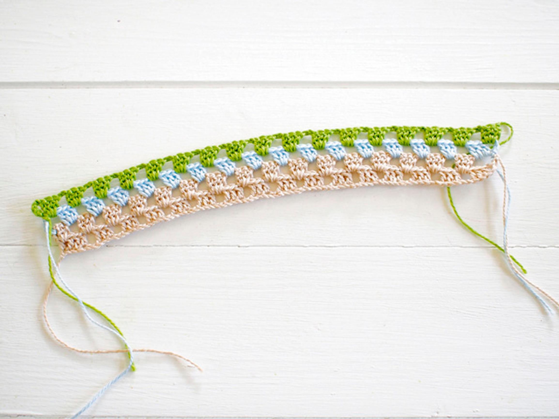 4. krs: Kiinnitä väri C edellisen krs:n viimeiseen s:aan, virkkaa kuten 3. krs, mutta virkkaa lopuksi (2 kjs 3 p) viimeiseen 2 kjs:aan, käännä työ. (17, 3 p:n ryhmää, 1 p lopussa). Katkaise lanka C.