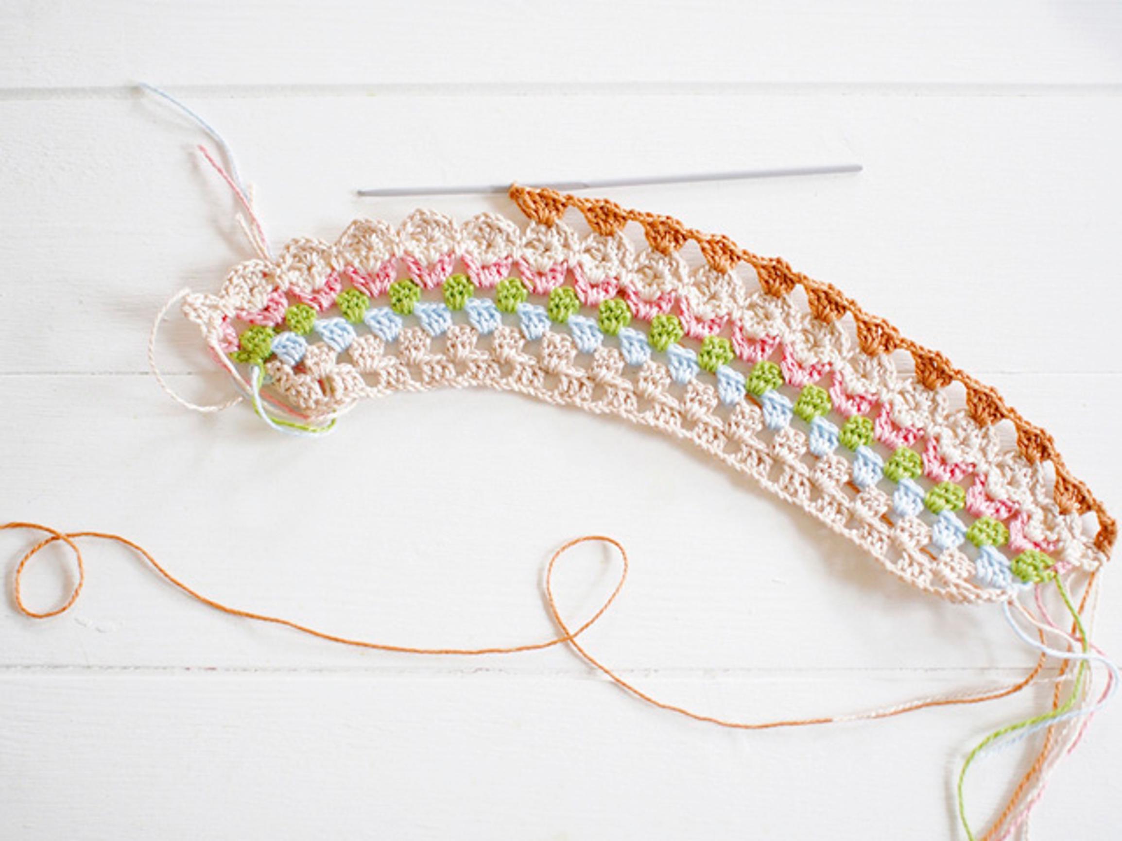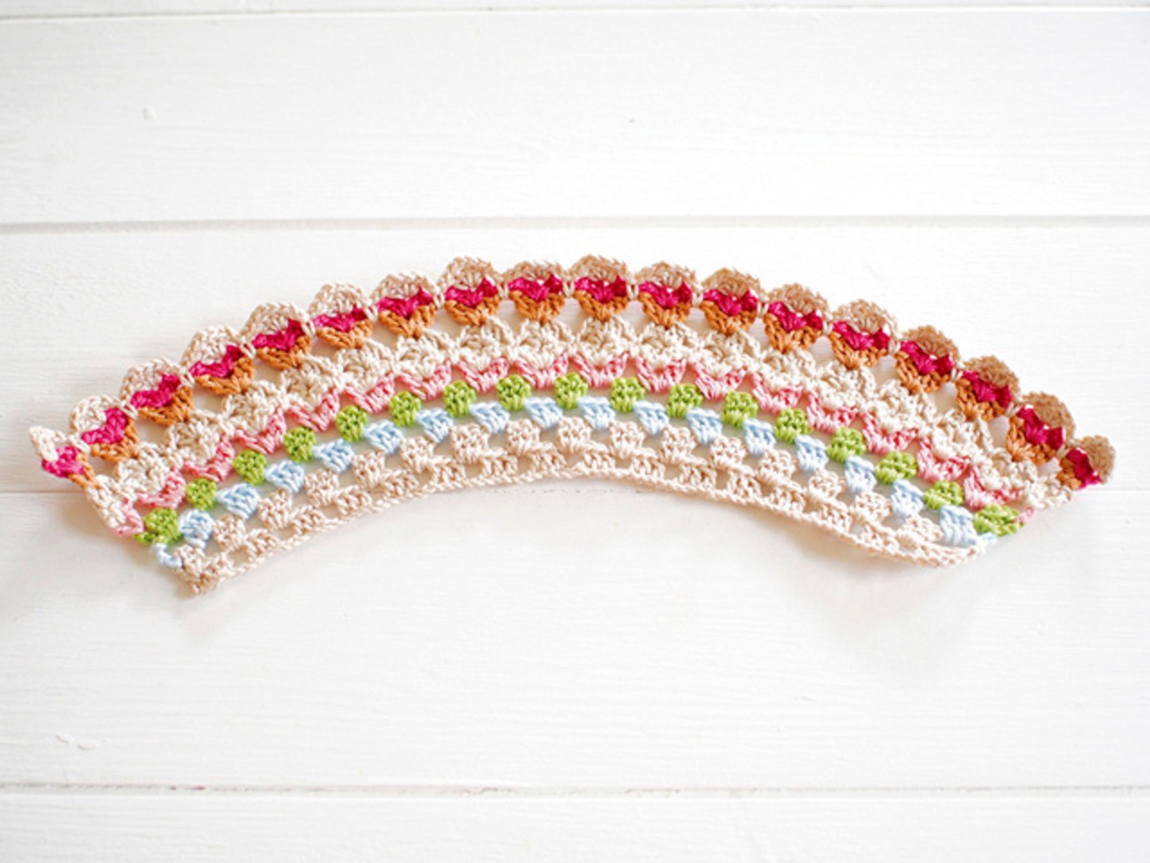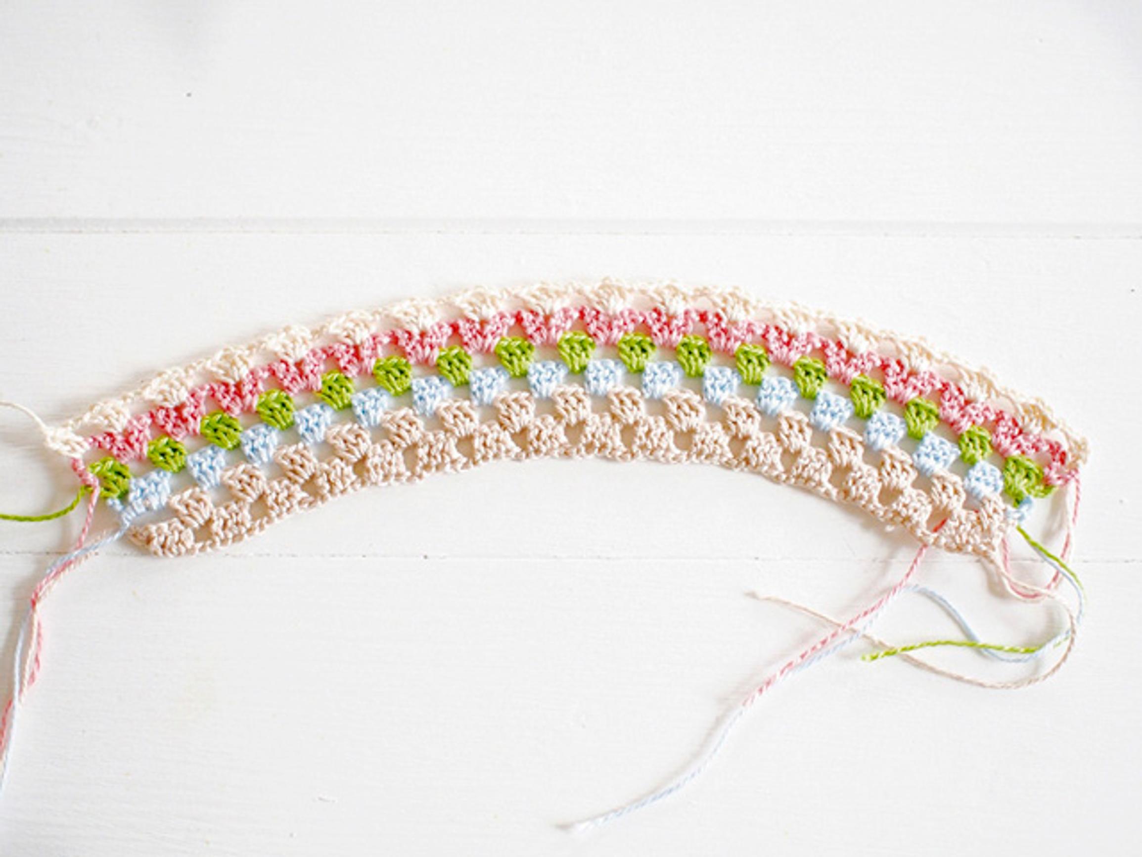 5. krs: Kiinnitä väri D edellisen krs:n viimeiseen s:aan, 5 kjs (= 1 p + 2 kjs), (2 p, 1 kjs, 2 p) ensimmäiseen 2 kjs:aan, (2 kjs, 2 p, 1 kjs, 2 p) jokaiseen 2 kjs:aan, virkkaa lopuksi (2 kjs, 2 p) viimeiseen kjs-kaareen, käännä työ. (16, 2 p:n ryhmää, 1 kjs, 2 p, toisessa reunassa on 2 p ja toisessa 1 p). Katkaise lanka D. Työ alkaa nyt kaartua viuhkamaisesti. 10.