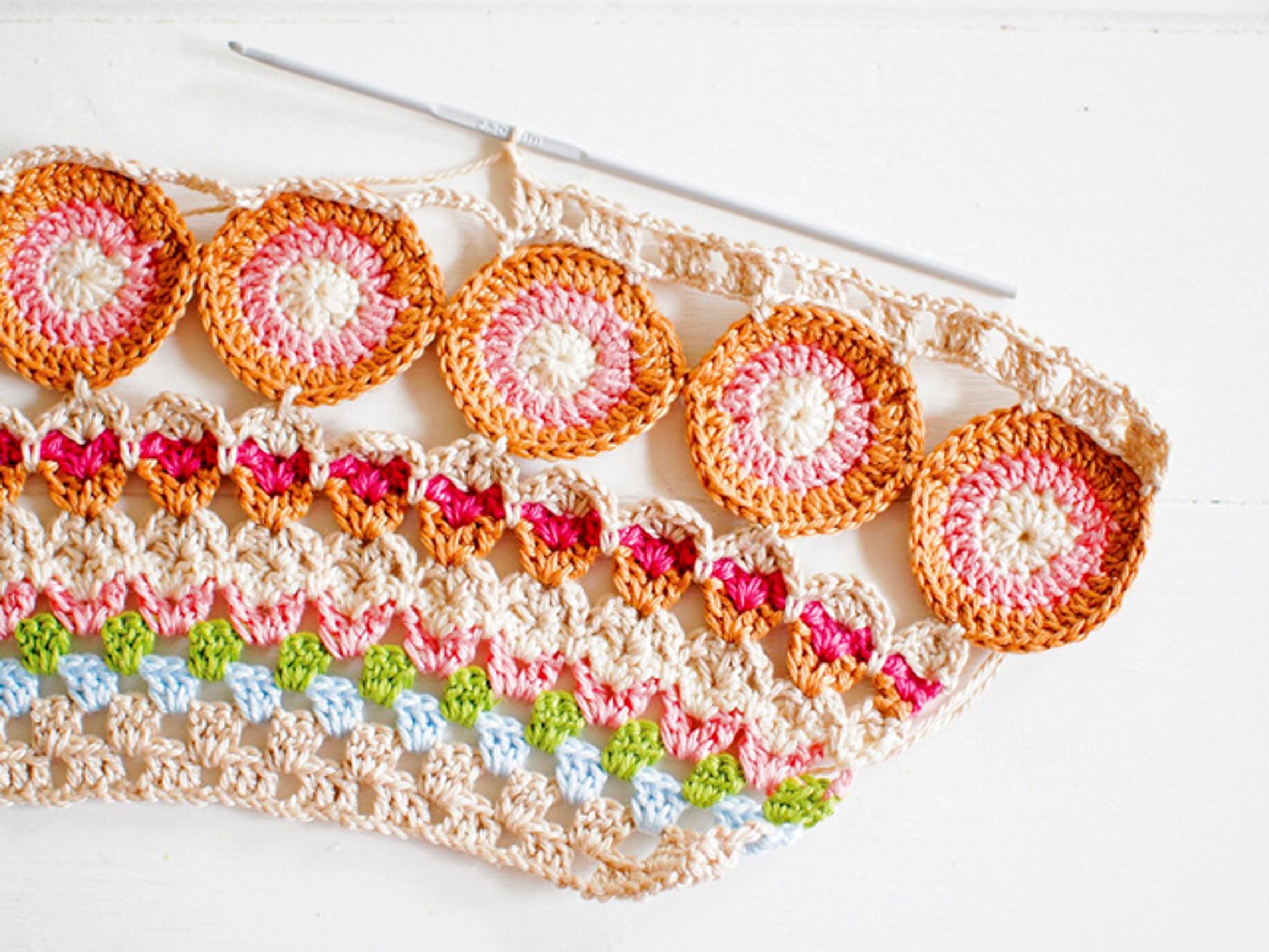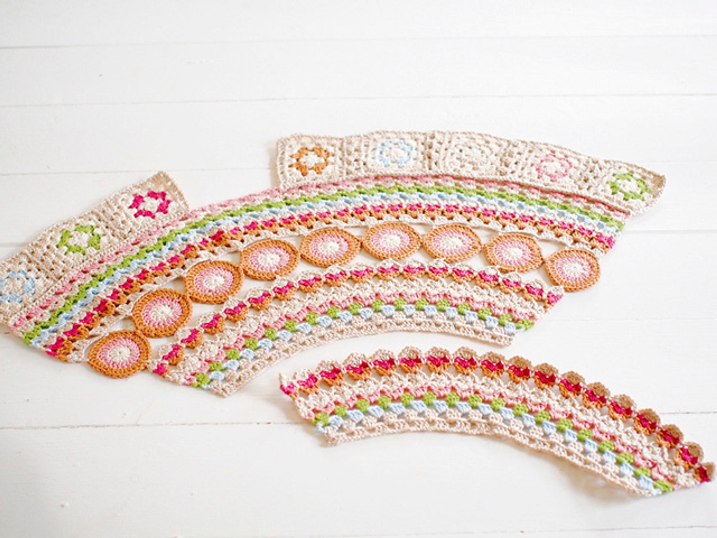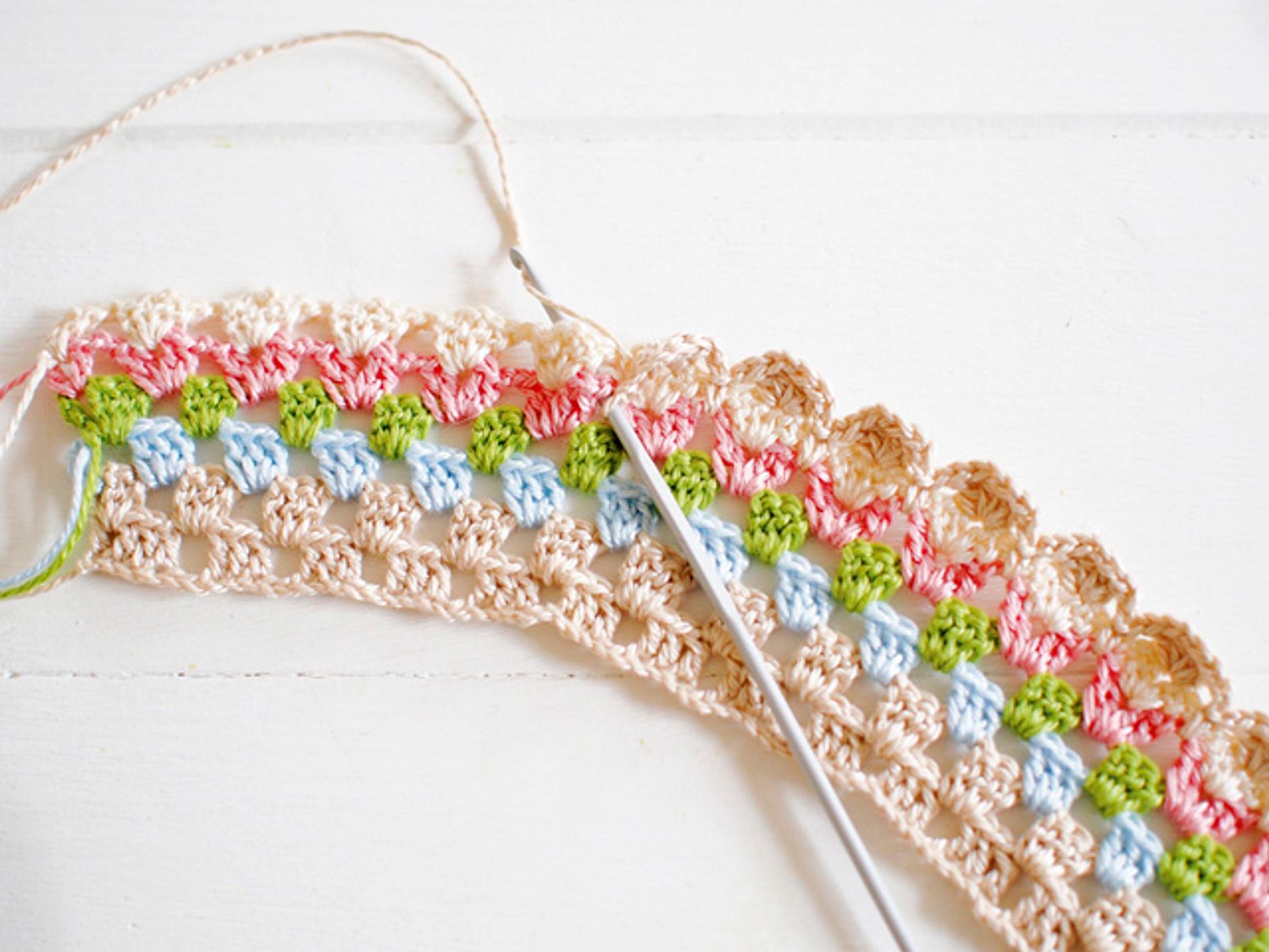 5. krs: Kiinnitä väri D edellisen krs:n viimeiseen s:aan, 5 kjs (= 1 p + 2 kjs), (2 p, 1 kjs, 2 p) ensimmäiseen 2 kjs:aan, (2 kjs, 2 p, 1 kjs, 2 p) jokaiseen 2 kjs:aan, virkkaa lopuksi (2 kjs, 2 p) viimeiseen kjs-kaareen, käännä työ. (16, 2 p:n ryhmää, 1 kjs, 2 p, toisessa reunassa on 2 p ja toisessa 1 p). Katkaise lanka D. Työ alkaa nyt kaartua viuhkamaisesti. 10.