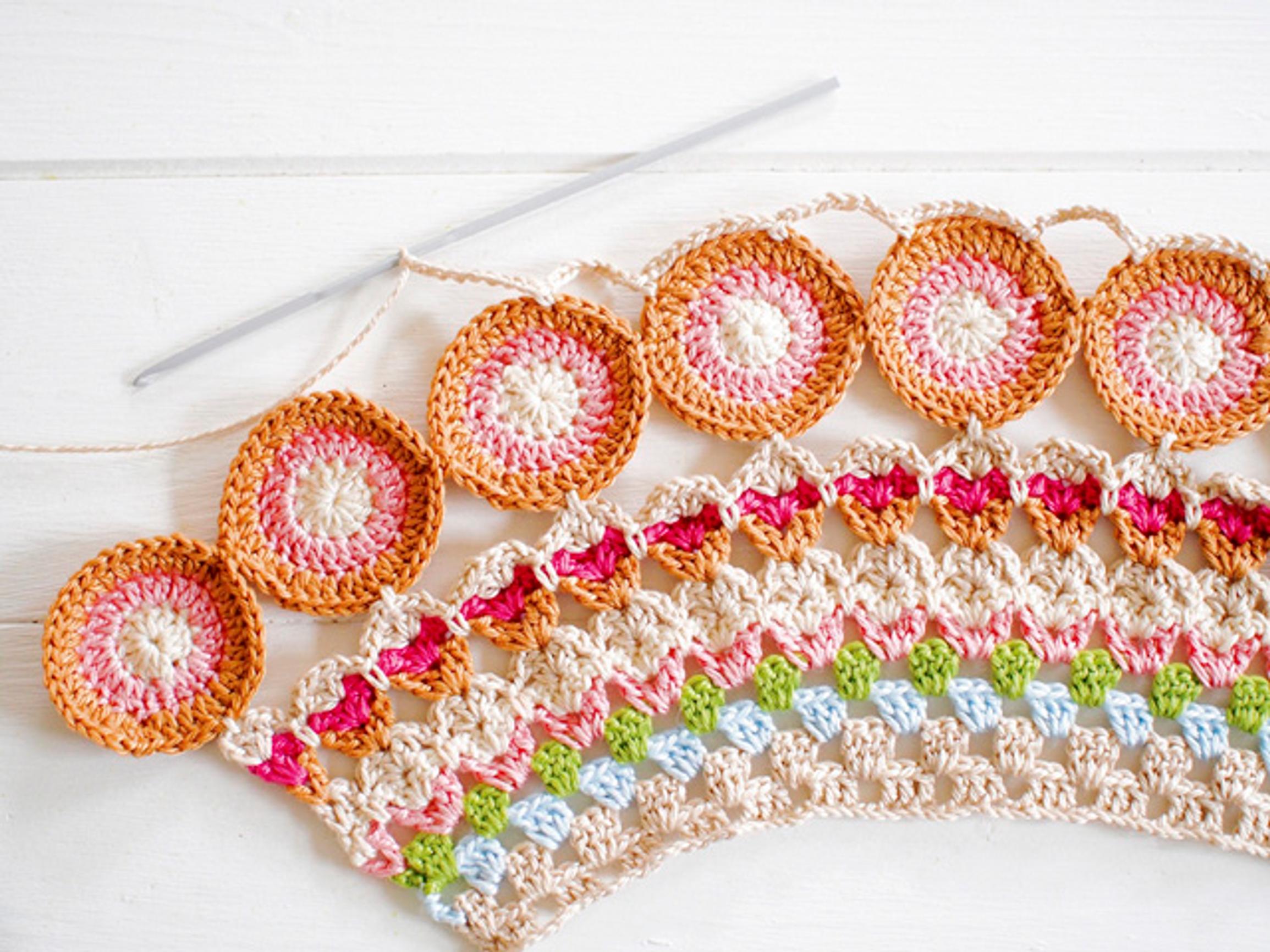 Virkkaa 18 pyörylää (9 kummallekin sivulle). Ensimmäinen pyörylä: valitse väri ja tee aloitussilmukka.