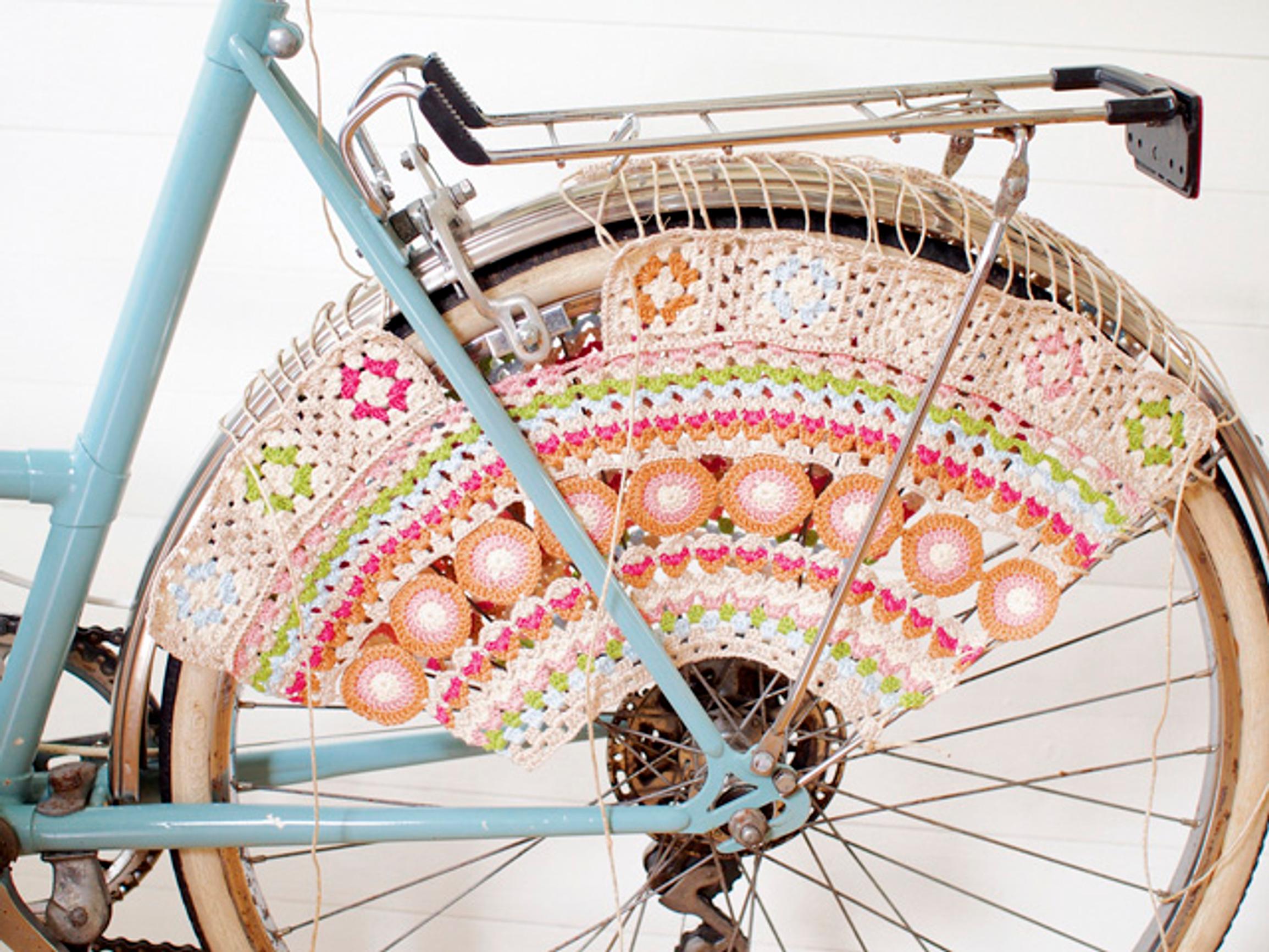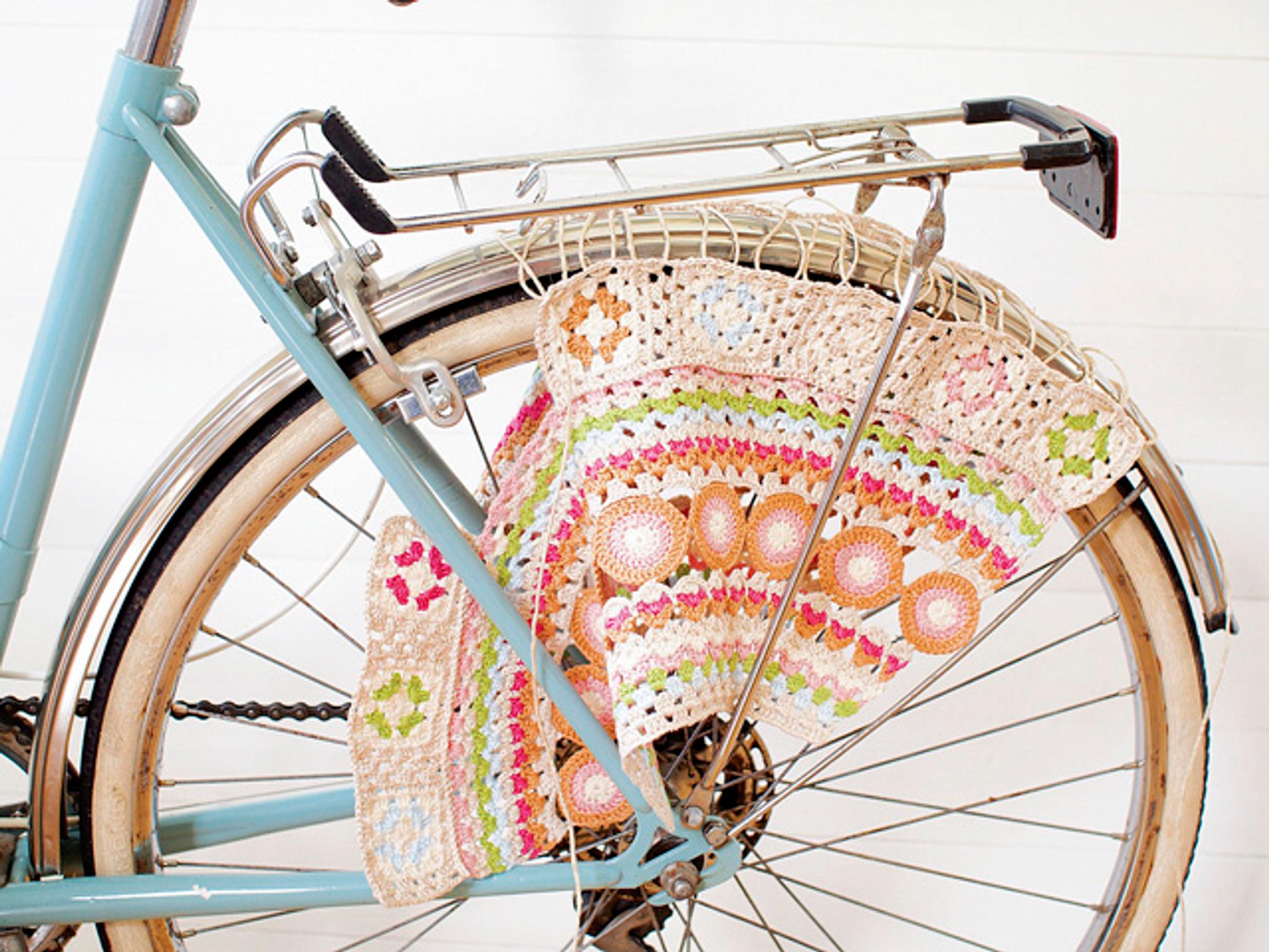 Virkattu polkupyörän pinnasuojus estää hameenhelmoja tarttumasta pinnojen väliin. Pue pyörä sievään huppuun kesän retkiä varten.