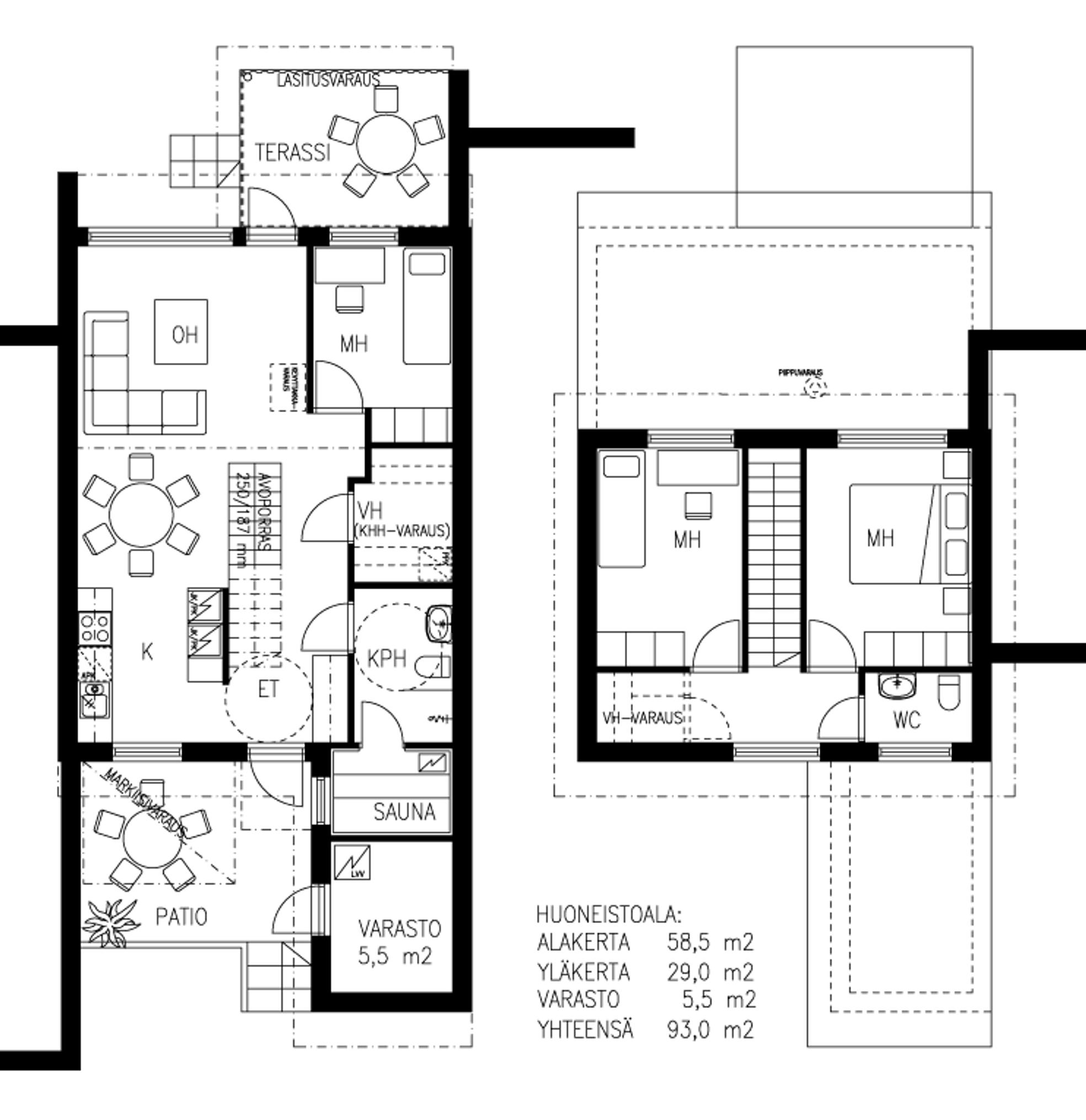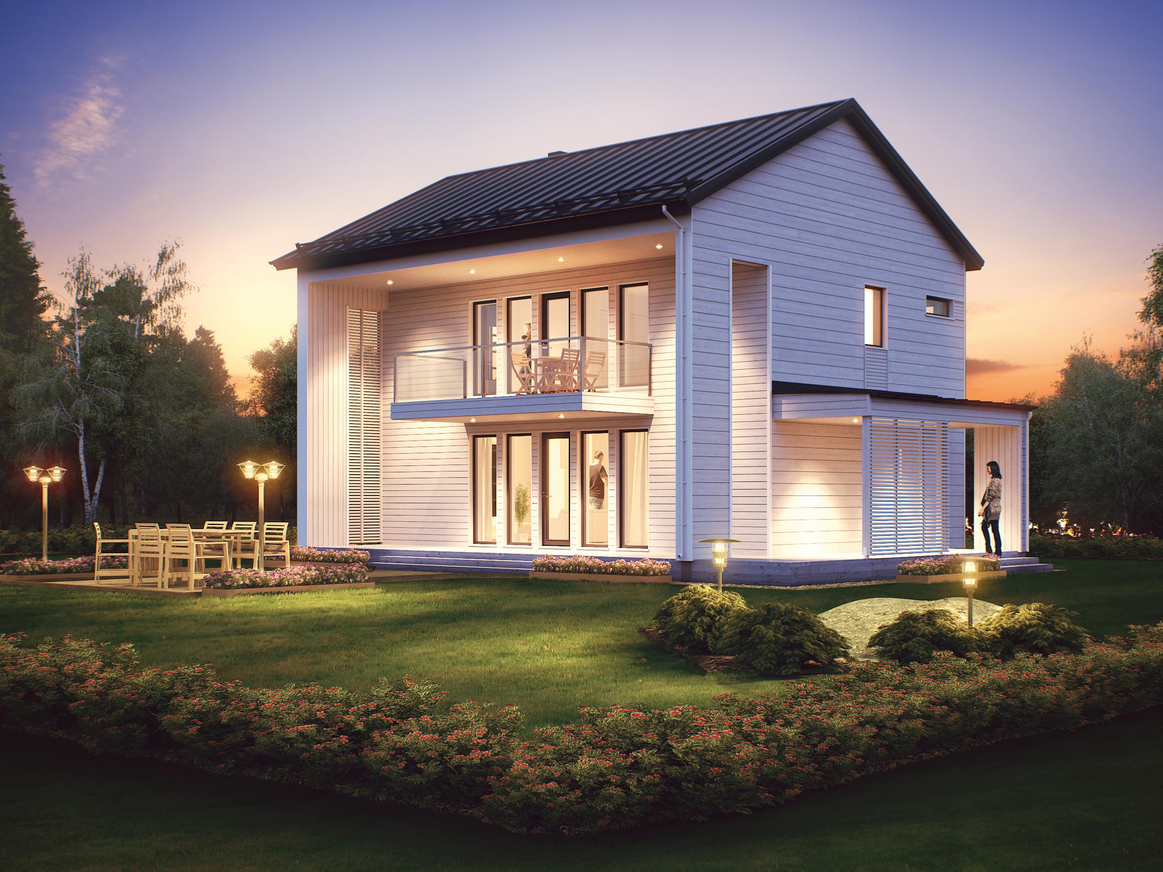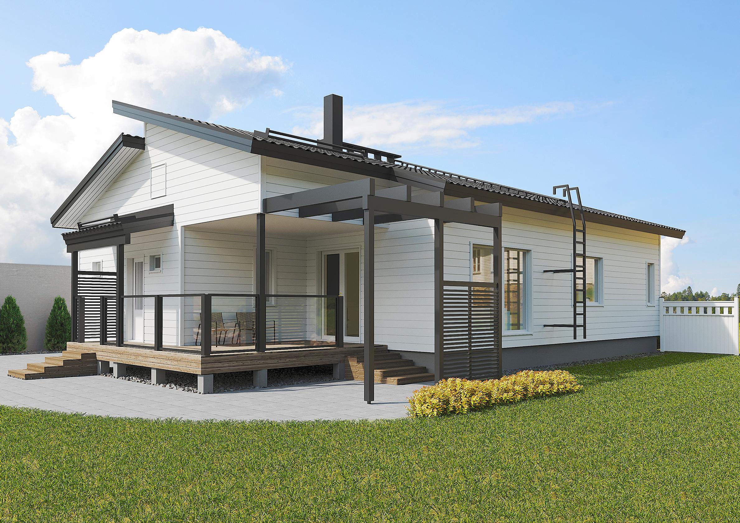 Erityistä: Pääsisäänkäynti on sijoitettu talon päätyyn, mikä mahdollistaa talon sijoittamisen pienellekin tontille. Suunnittelussa on pyritty huomioimaan hukkaneliöiden minimointi.