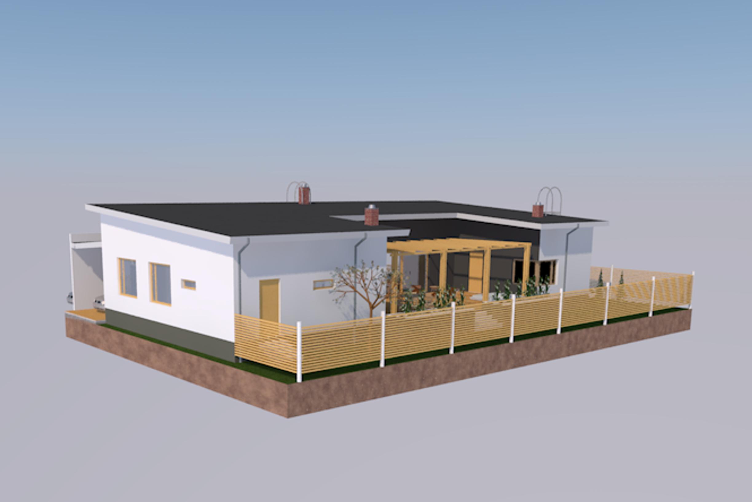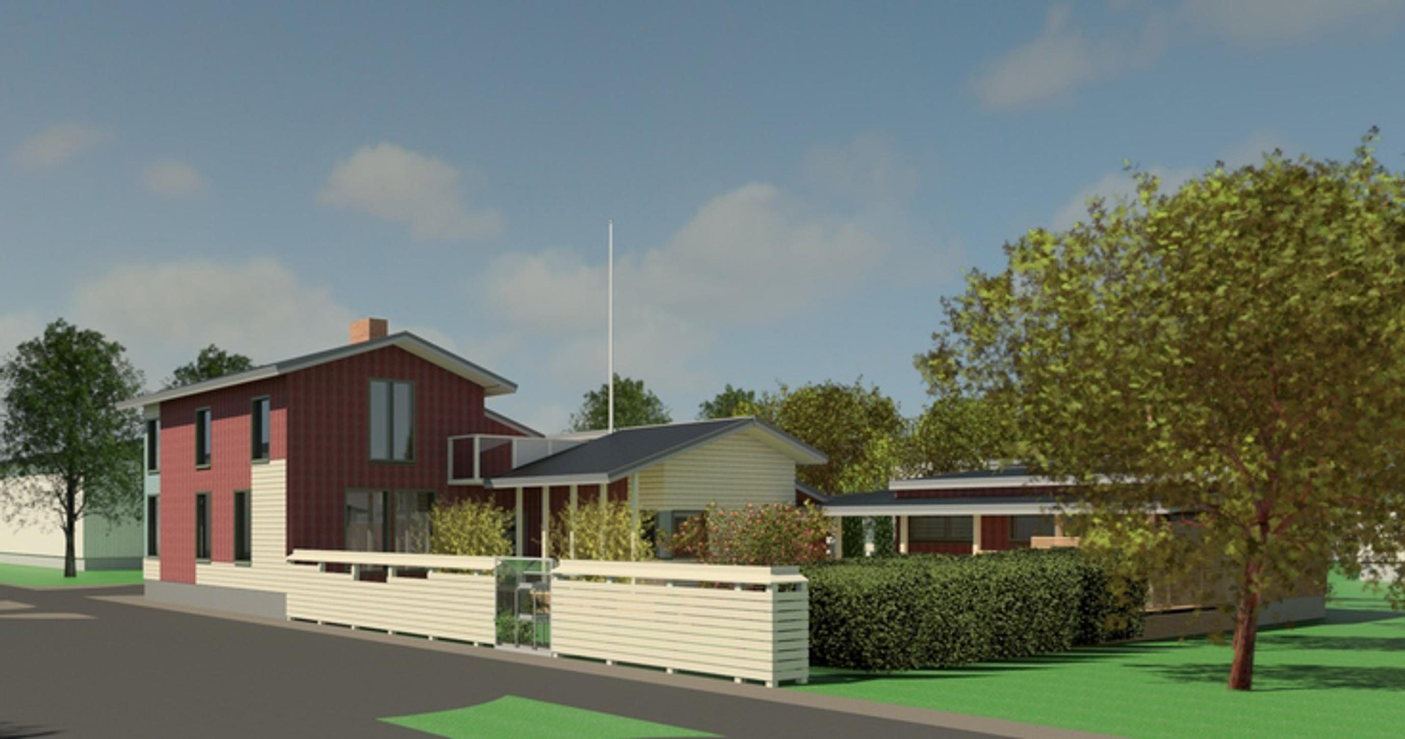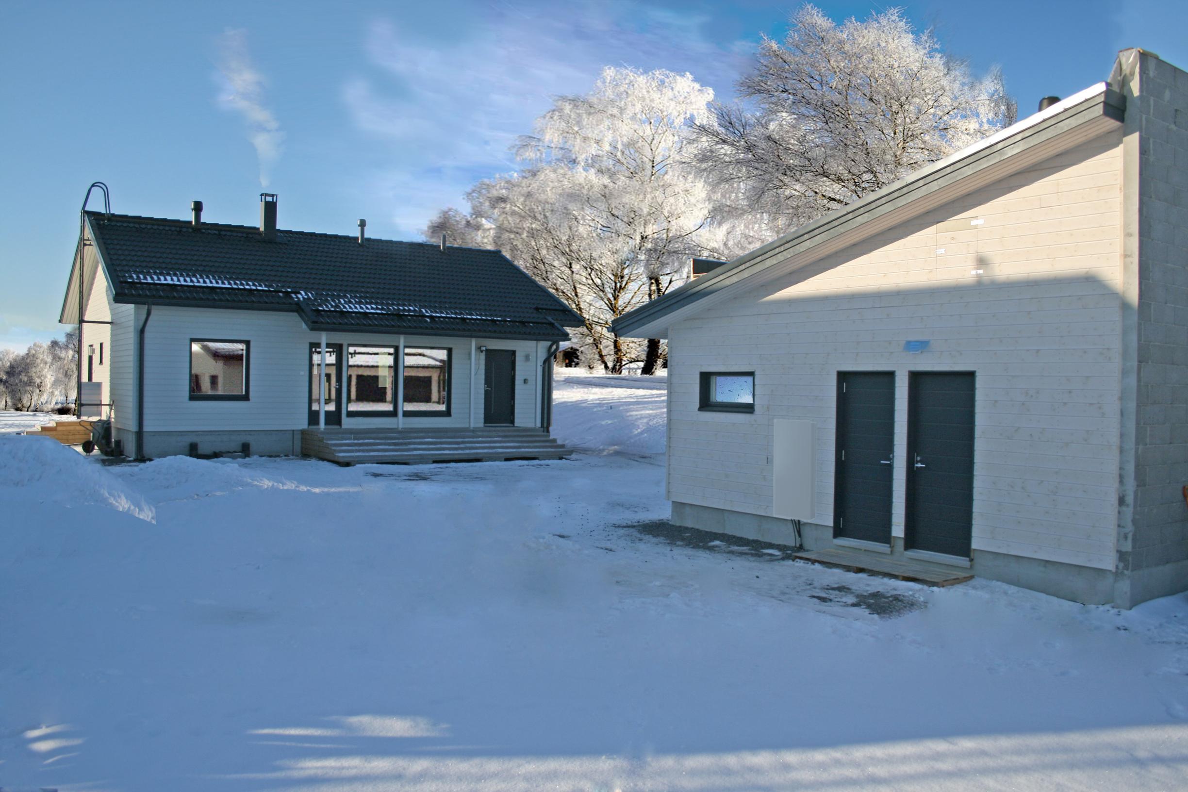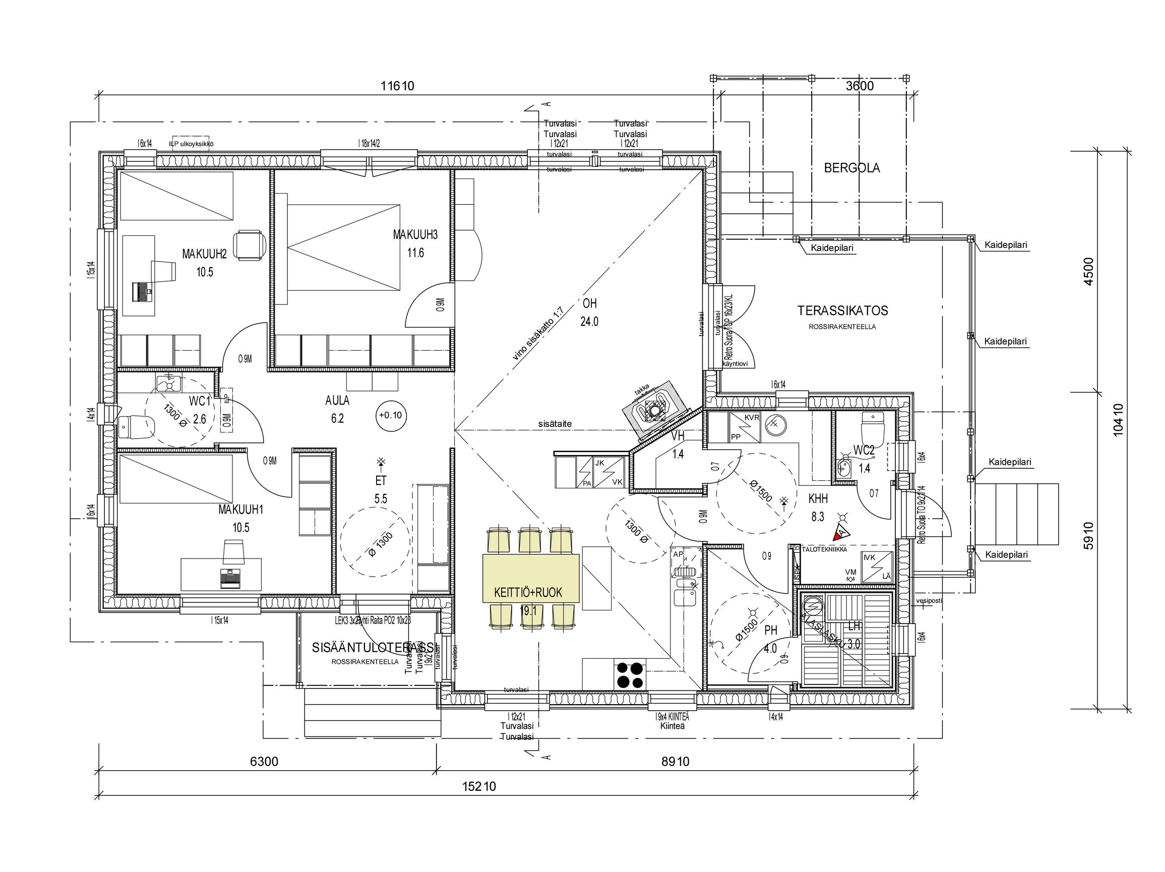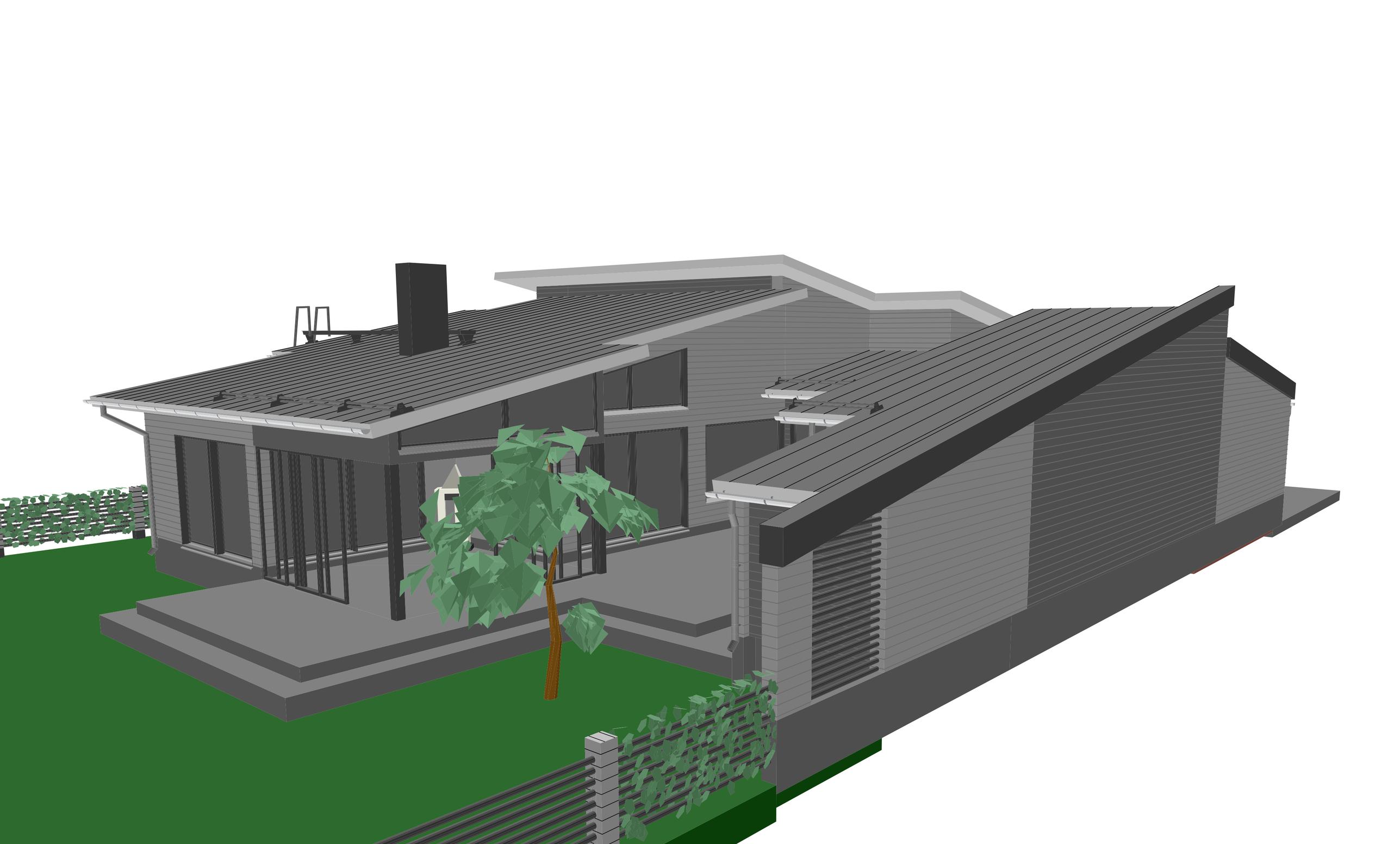 Erityistä: Eläkeläispariskunnalle suunniteltu koti. Kokonaisuuteen kuuluu myös tilava kahden auton talli autoharrastukselle ja nikkaroinnille.