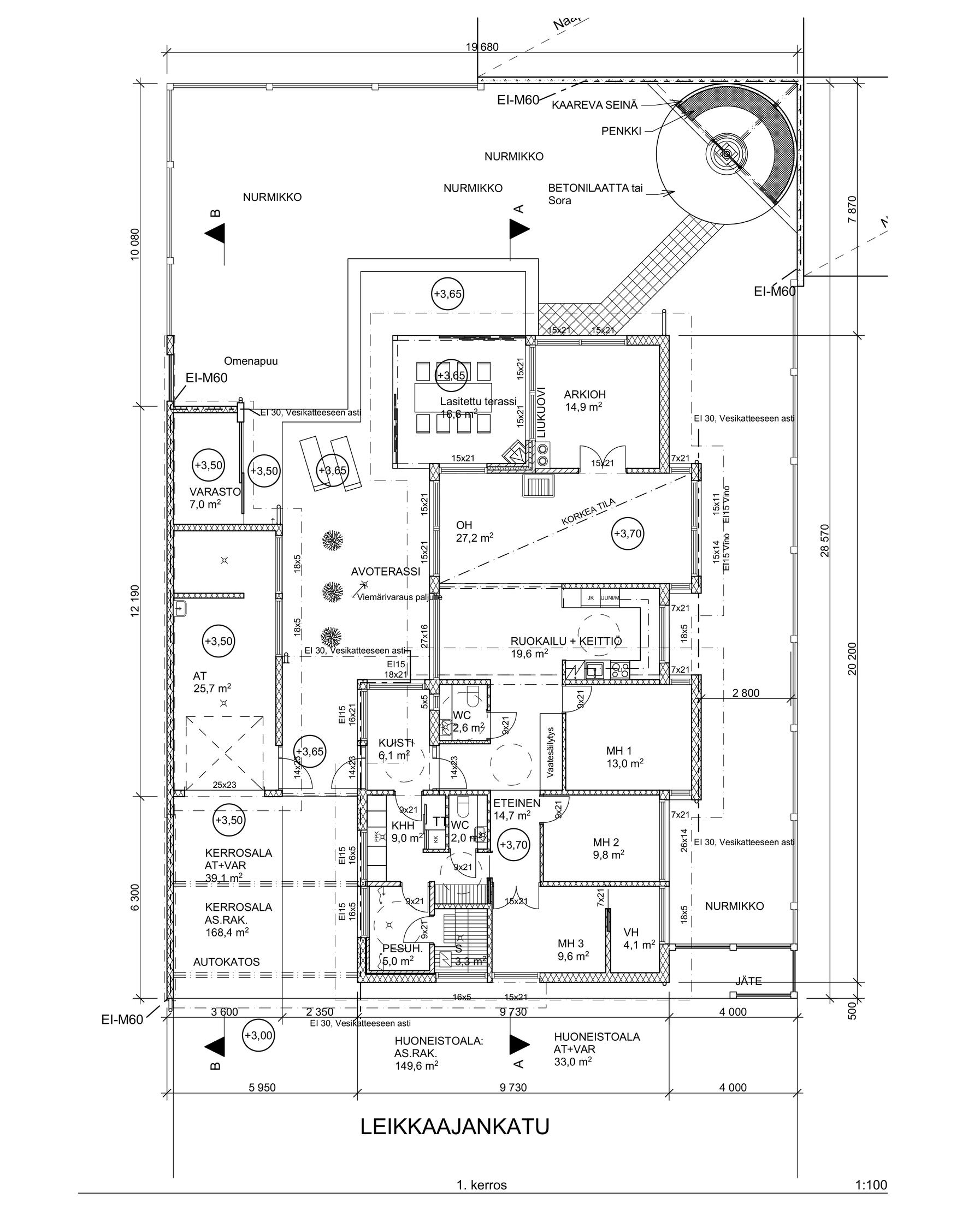 Huonejako, kerrosala/huoneistoala: 3–4 h, 93 m² x 7