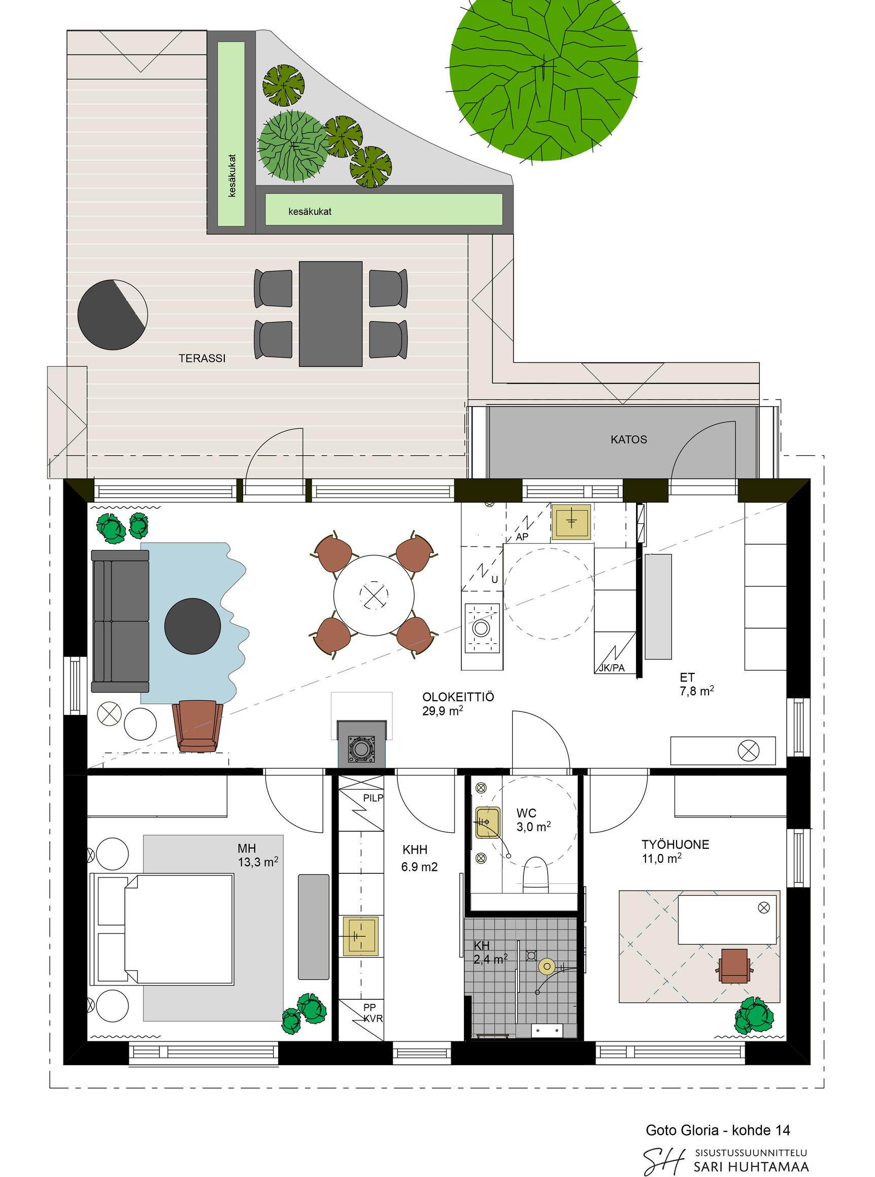 Erityistä: Kohde on kaupunkimummila, ”amerikkalainen bungalow balilaisella twistillä ja ripauksella Alvar Aaltoa”. Esteetön koti on suunniteltu palvelemaan myös ikääntyvän asukkaan tarpeita.
