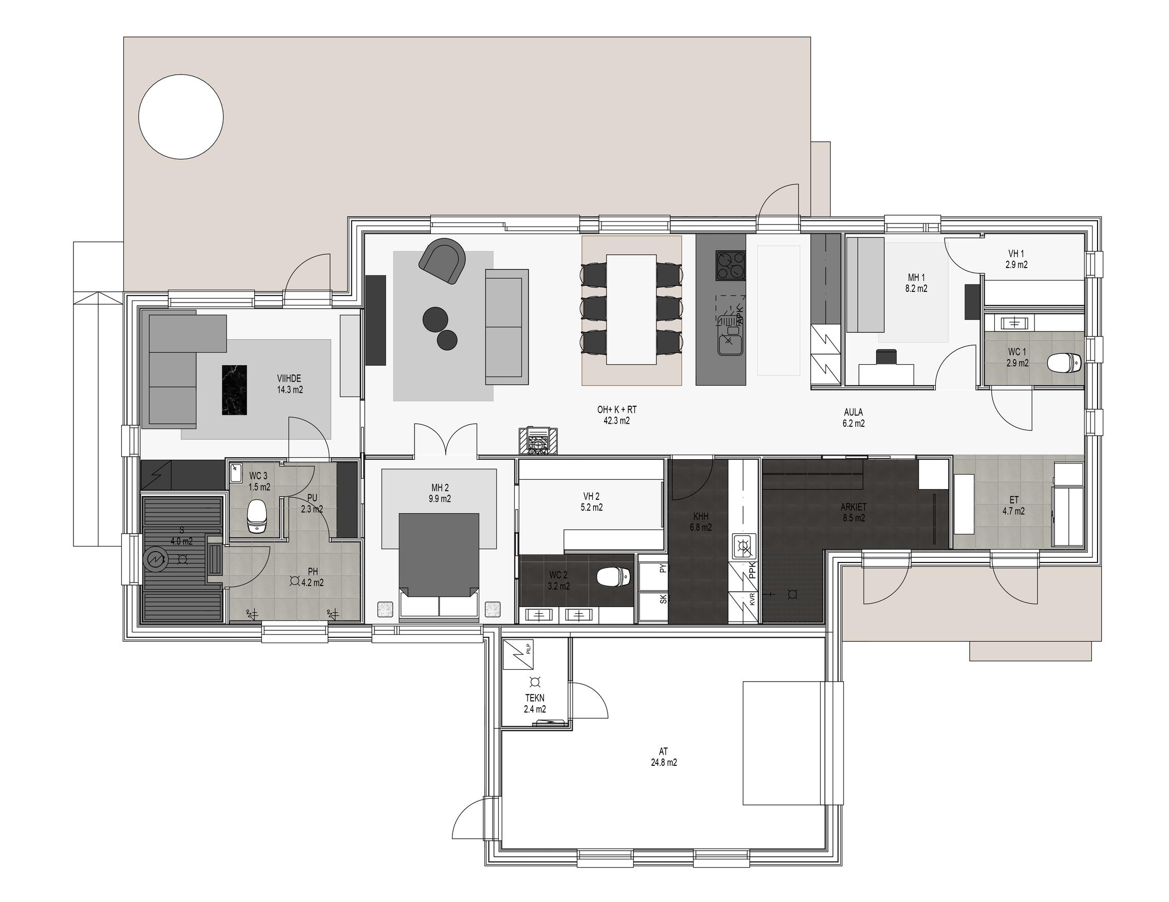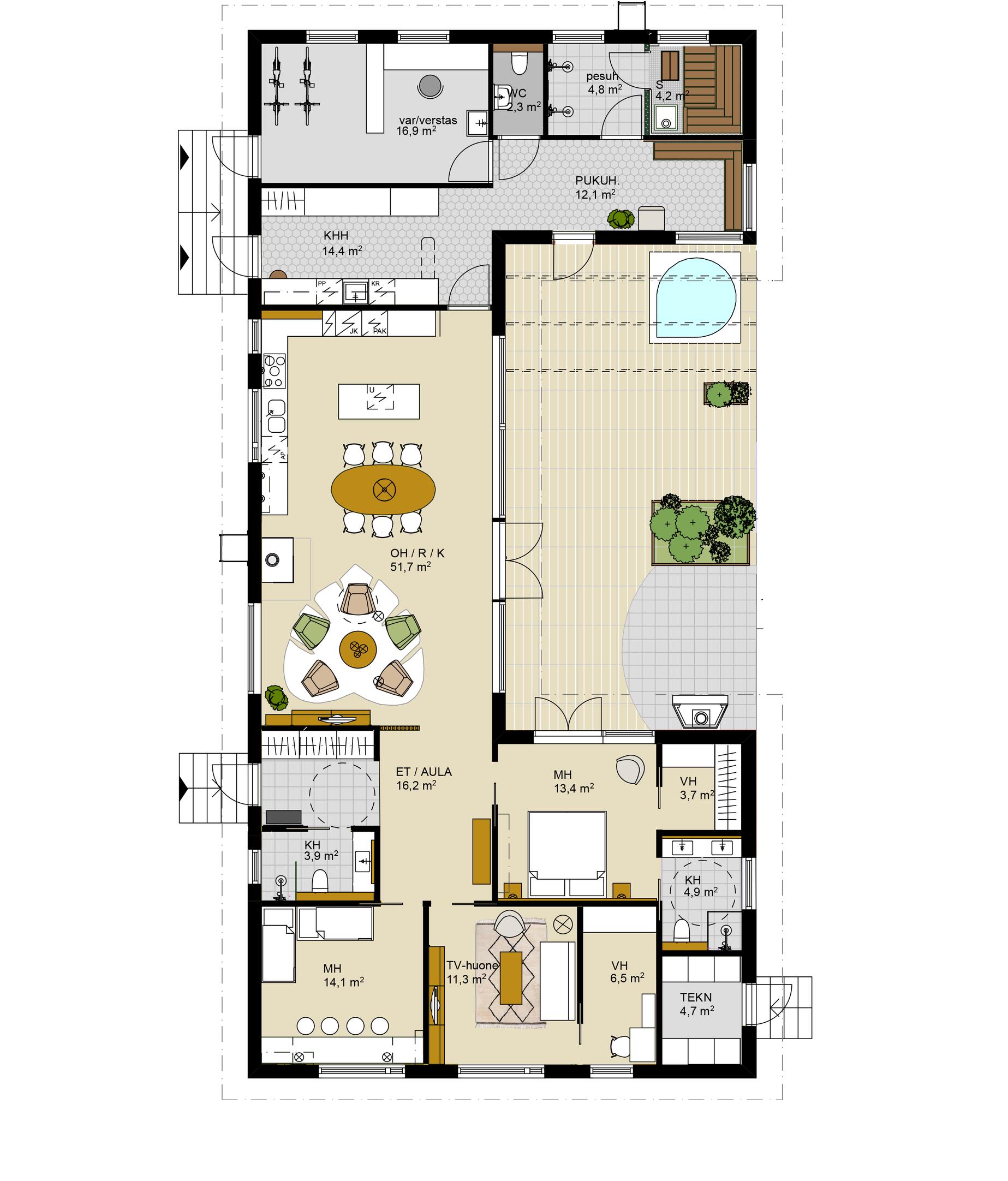 Erityistä: Oleskelutila avautuu suojaisaan atriumpihaan. Korkeat tilat ja ikkunat päästävät sisään runsaasti luonnonvaloa.
