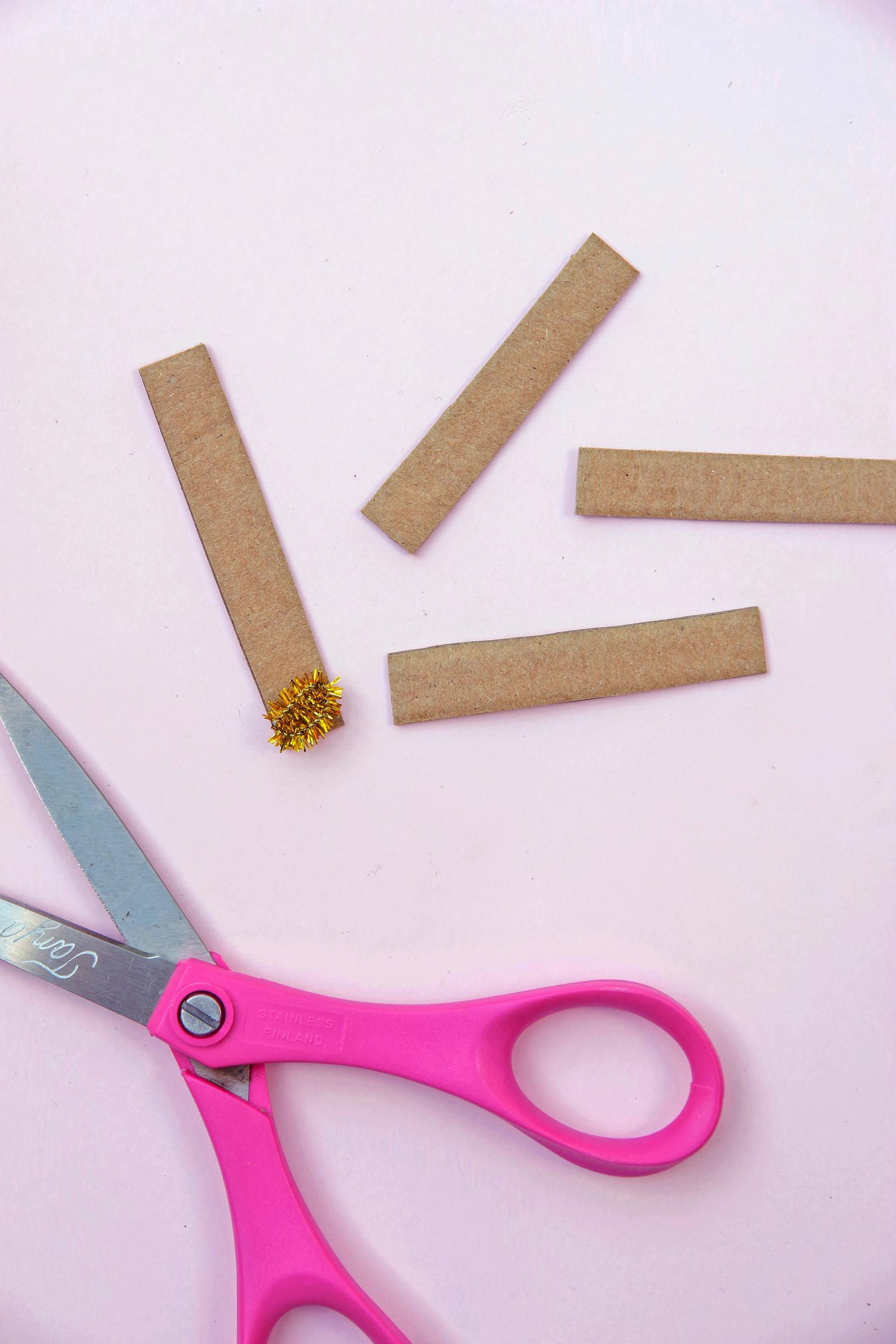 5. Leikkaa pahvista noin 1 × 4 cm kokoiset suikaleet jaloiksi. Kiinnitä jalat kuumaliimalla. Leikkaa piippurassista pieniä paloja ja liimaa ne kavioiksi.