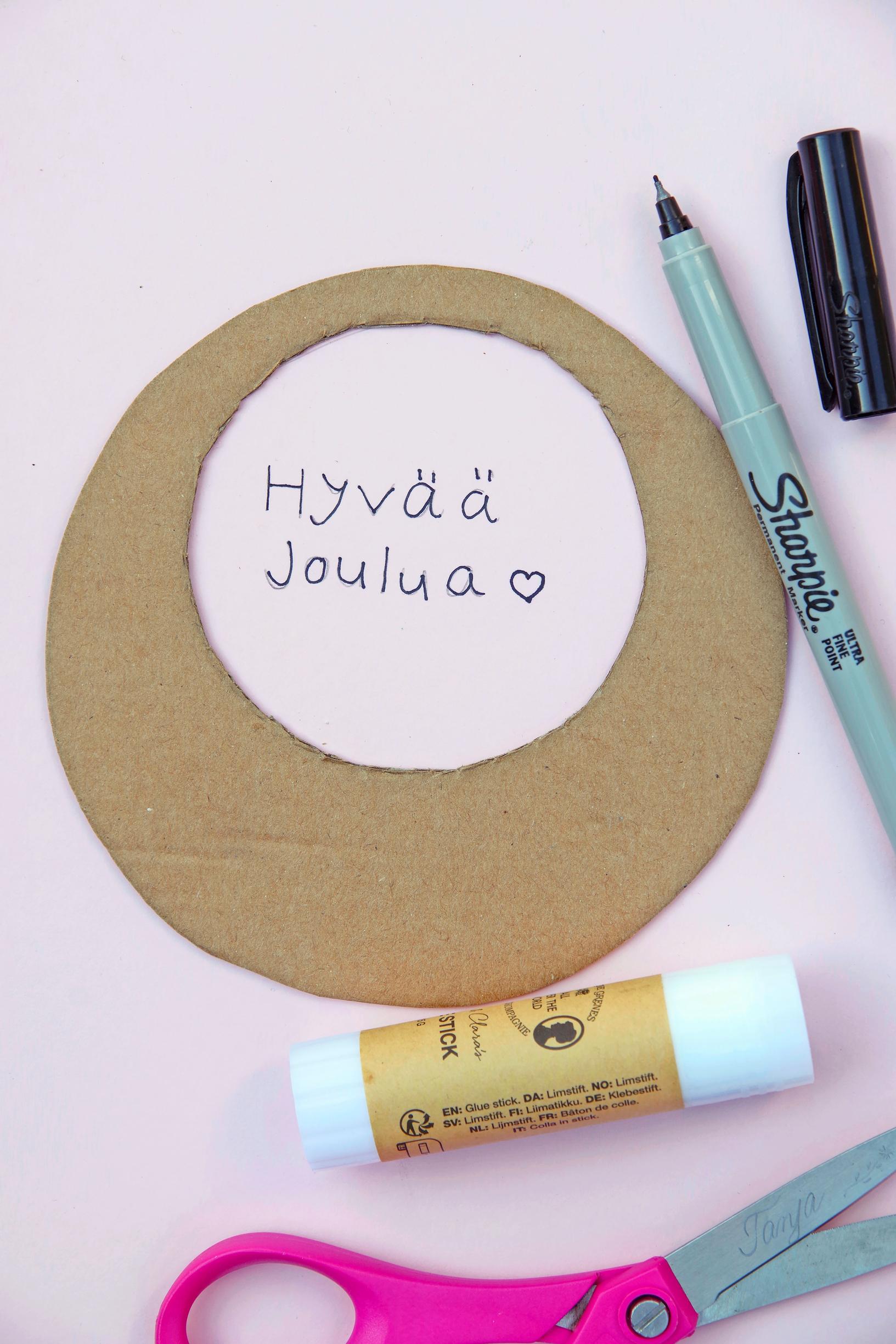 6. Leikkaa värillisestä kartongista kortin tausta. Liimaa se ison ympyrän taakse. Kirjoita pienemmän ympyrän sisälle jouluterveisesi ja napsauta poron pää sen päälle.