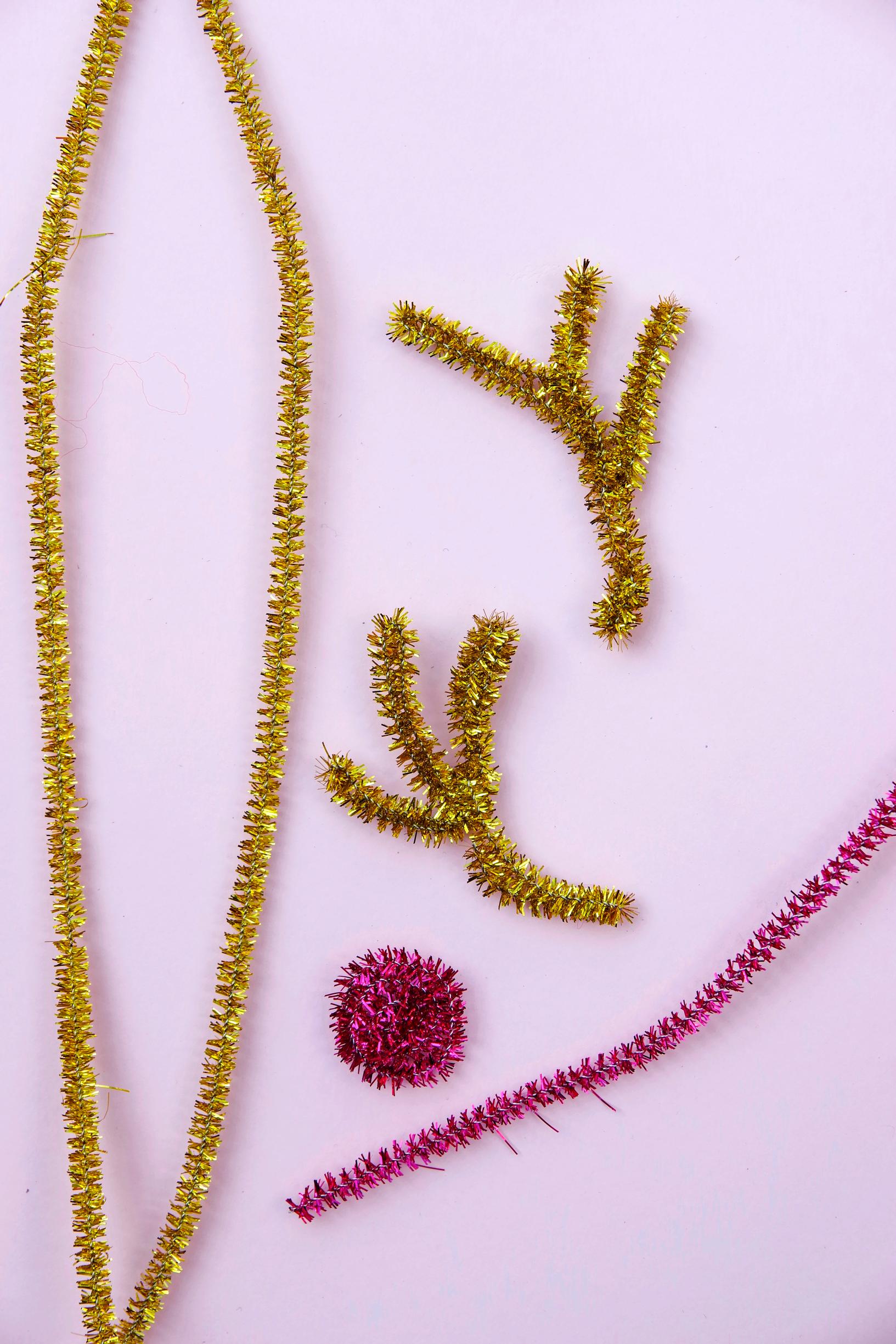 3. Taivuta piippurasseista porolle sarvet. Kokeile eri muotoja ja tee monihaaraiset sarvet tai yksinkertaiset Y:t. Leikkaa punaisesta tai pinkistä piippurassista noin 8 cm:n pala ja kierrä siitä porolle pyöreä nenä. Kiinnitä sarvet ja nenä pään etupuolelle kuumaliimalla.