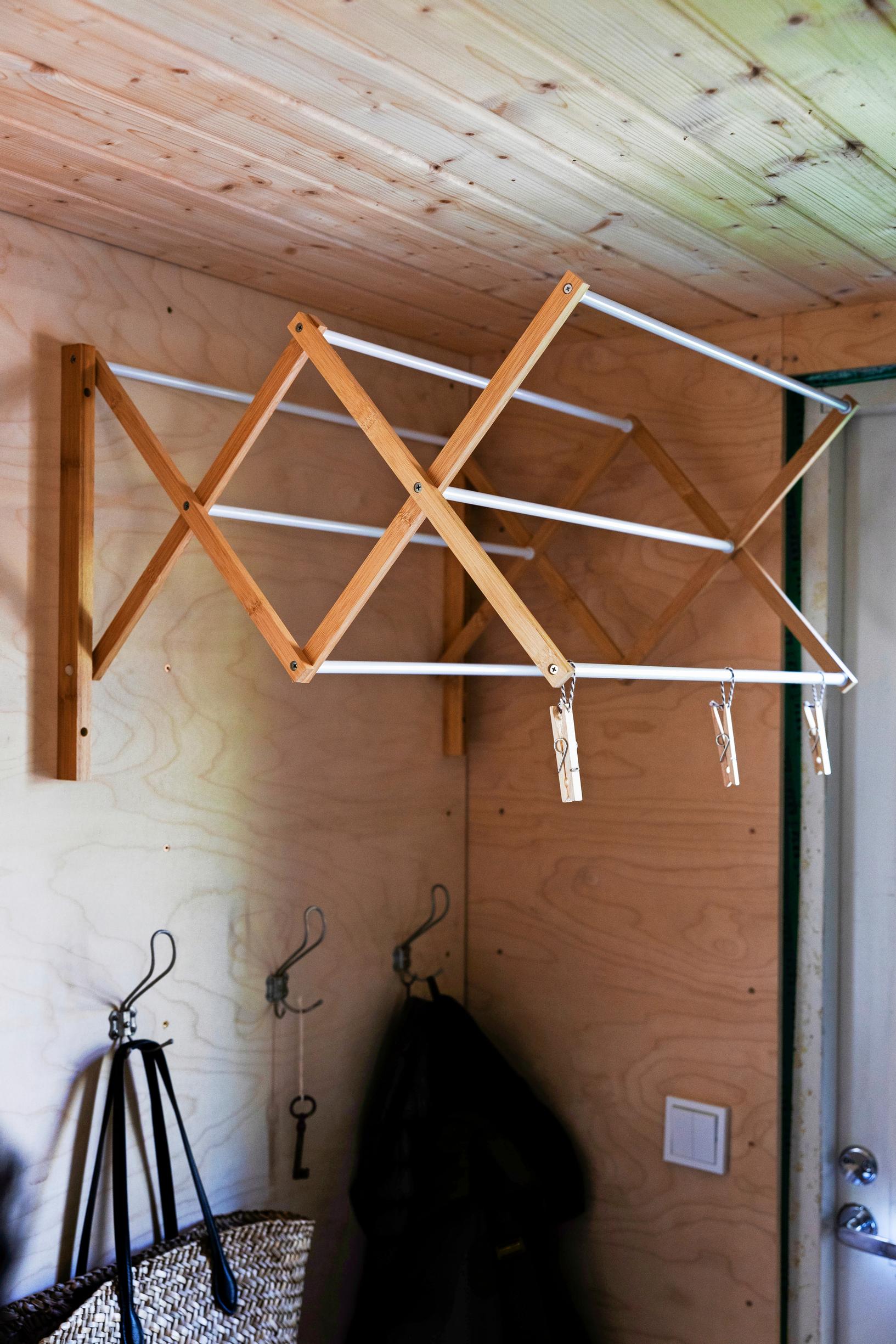 Vajaan 30 neliön kesämökissä ei ollut lainkaan säilytystilaa. Mökkiremontti toi keittiöön kaapistot, mutta uusille komeroille ei jäänyt tilaa. Vaatteita ja vuodevaatteita oli säilytetty vuosia nukkuma-aitassa.