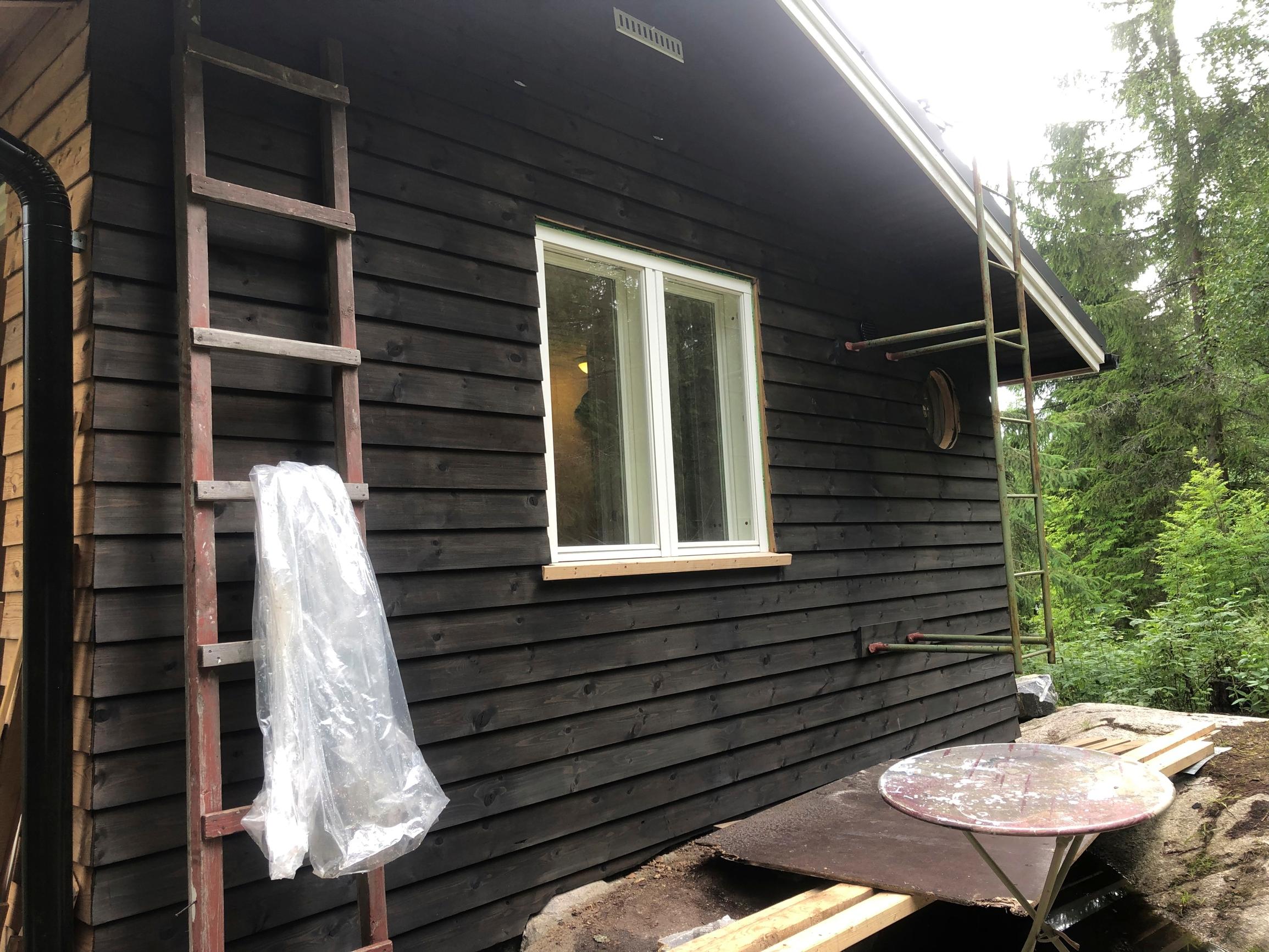 Rakennusvaiheessa tekeillä oleva porstua erotettiin mökistä vanhalla ulko-ovella, jotta kylmä ei päässyt työmaalta sisään. Nyt vanha ovi on vaihdettu lasioveen.