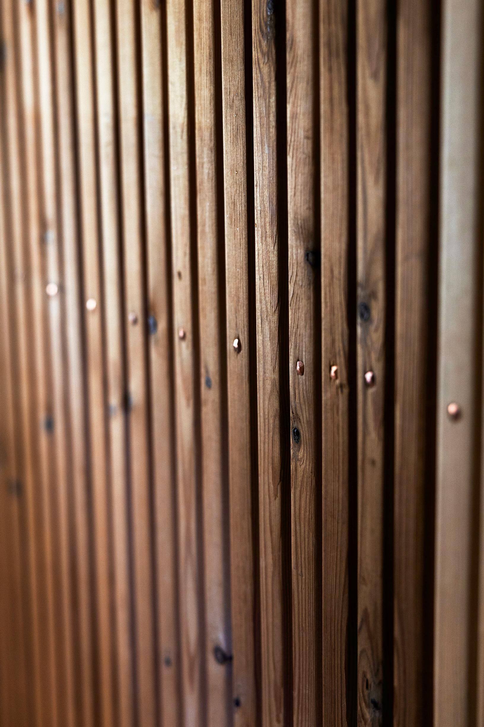 WC:n seiniltä saivat paikan vanhan pukuhuoneen patinoituneet seinäpaneelit, jotka Arto oli säästänyt aiemmassa remontissa. Ne eivät riittäneet koko tilaan, joten päätyseinä ja muut seinät ovat vaaleaa vaneria.
