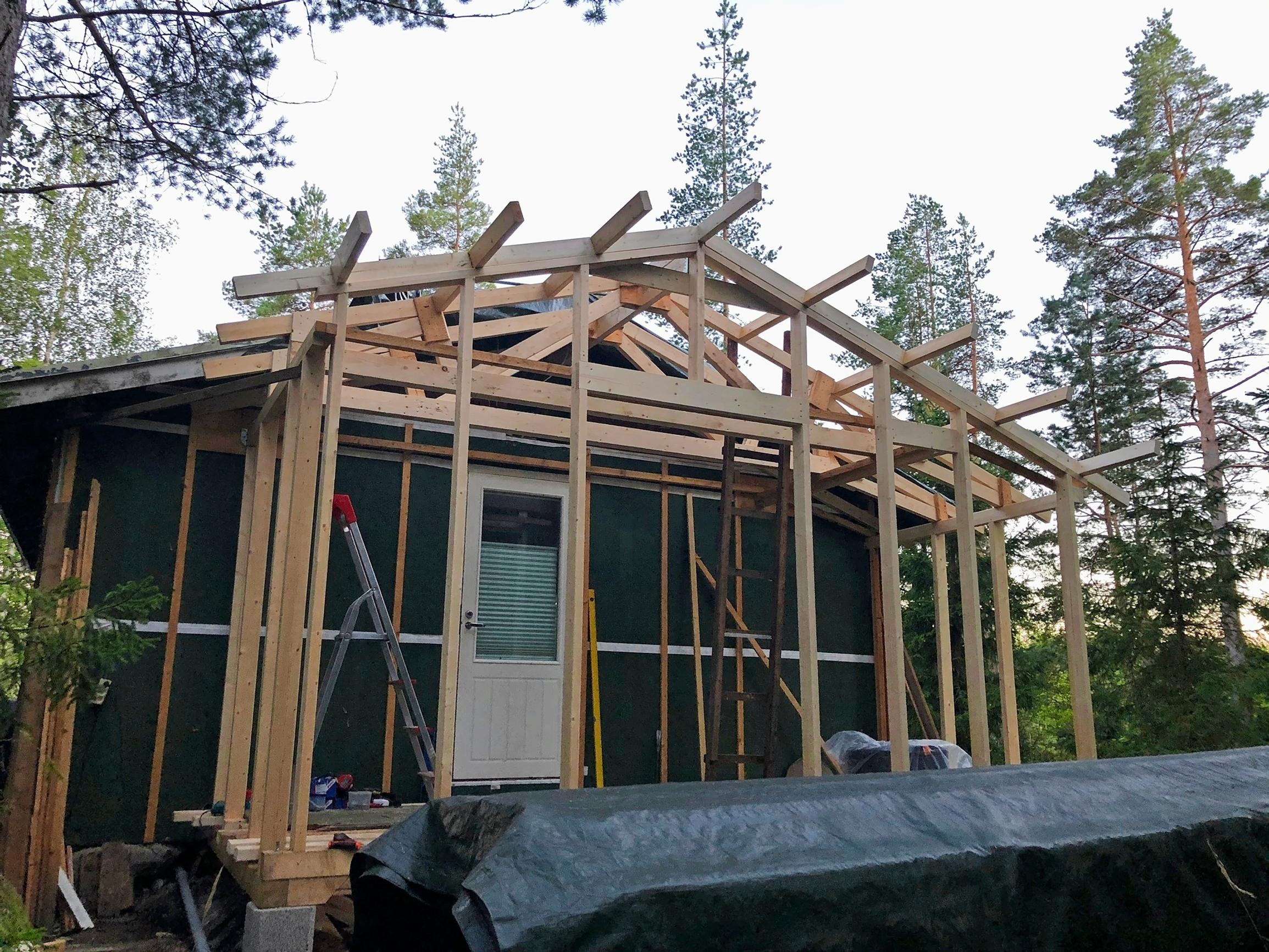 Arto rakensi porstuaa huopakaton alla, jotta rakenteet säilyivät kuivina. Huopakatto jäi lopulta uuden peltikaton alle, sillä mökkeilijät halusivat vaihtaa kaikki katot peltisiksi.