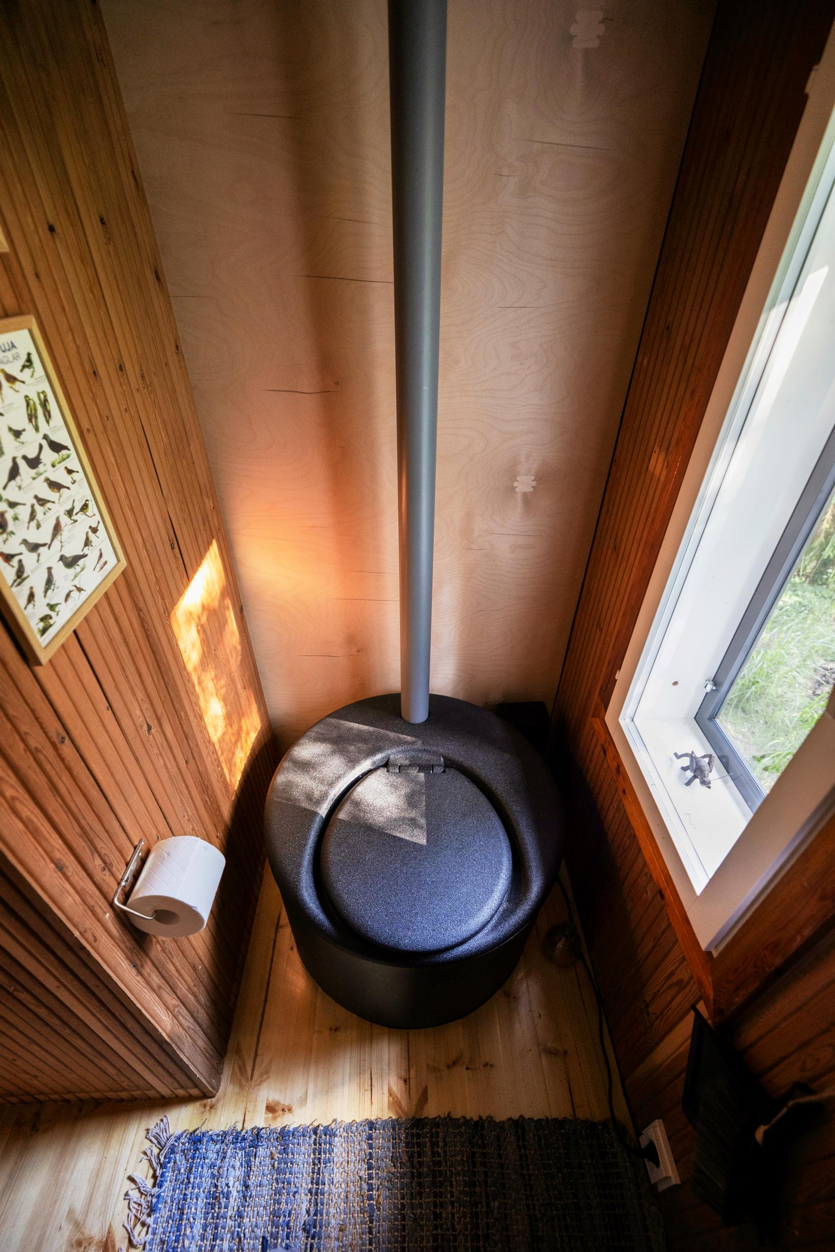 Mökki pysyy siistinä, sillä kengät jäävät porstuaan, jonka toinen puoli toimii eteisenä. Kompostoivaan vessaan pari voi kätevästi laittaa biojätteet.