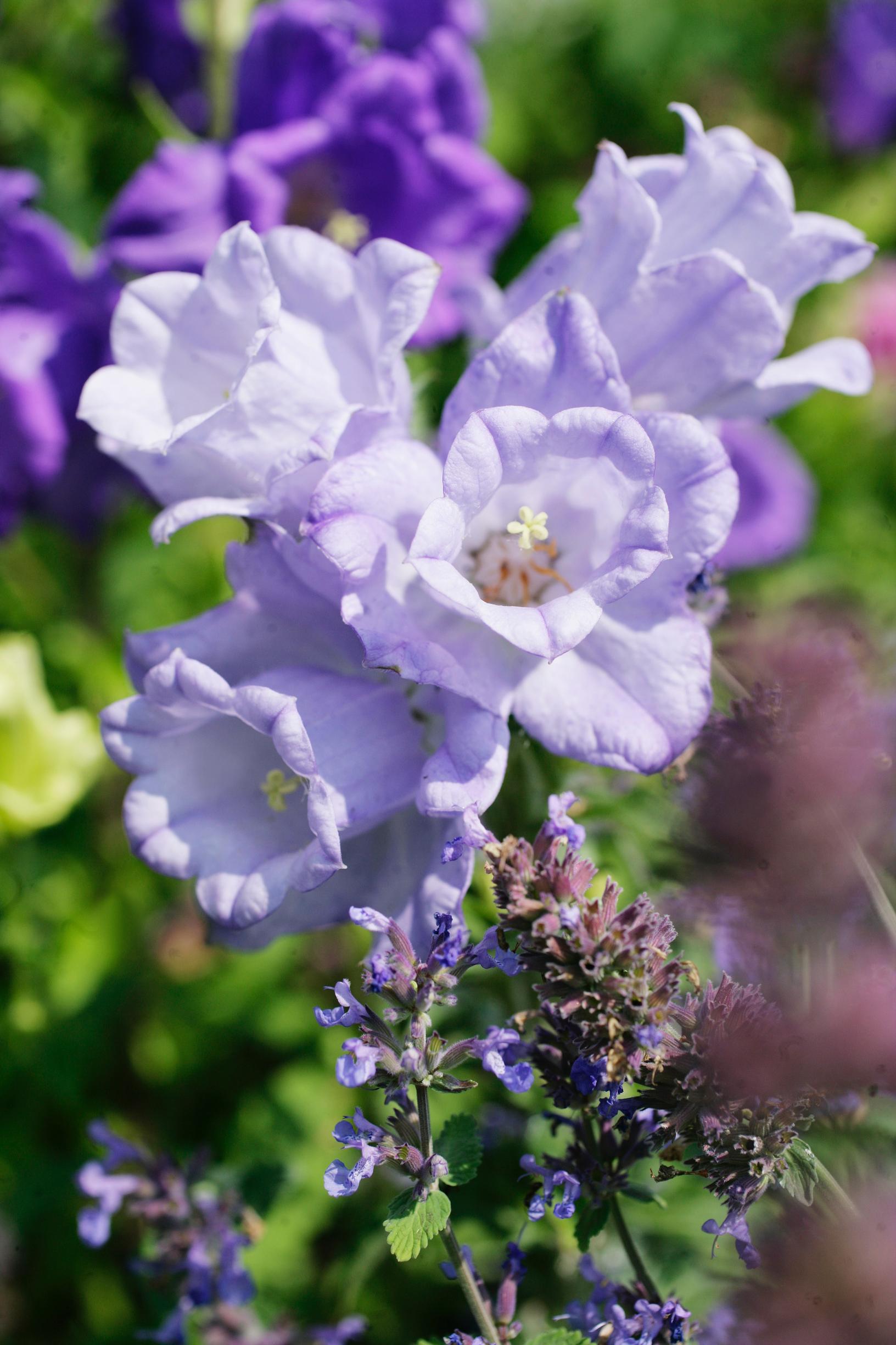 Sinisiä ja violetteja kukkia: kurkkuyrtti , maariankello, neidonkieli, ruiskukka, tuoksuherne ’Noel Sutton’ .
