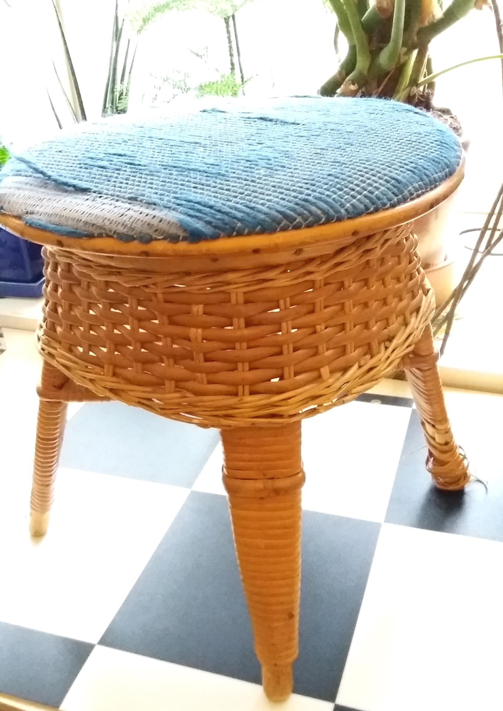 Uutta ilmettä kirppislöydölle! Vanha rottinkijakkara tuunattiin maalilla ja uudella päällisellä. Laakapistoilla tavallisesta printtikankaasta saa näyttävän verhoilukankaan.