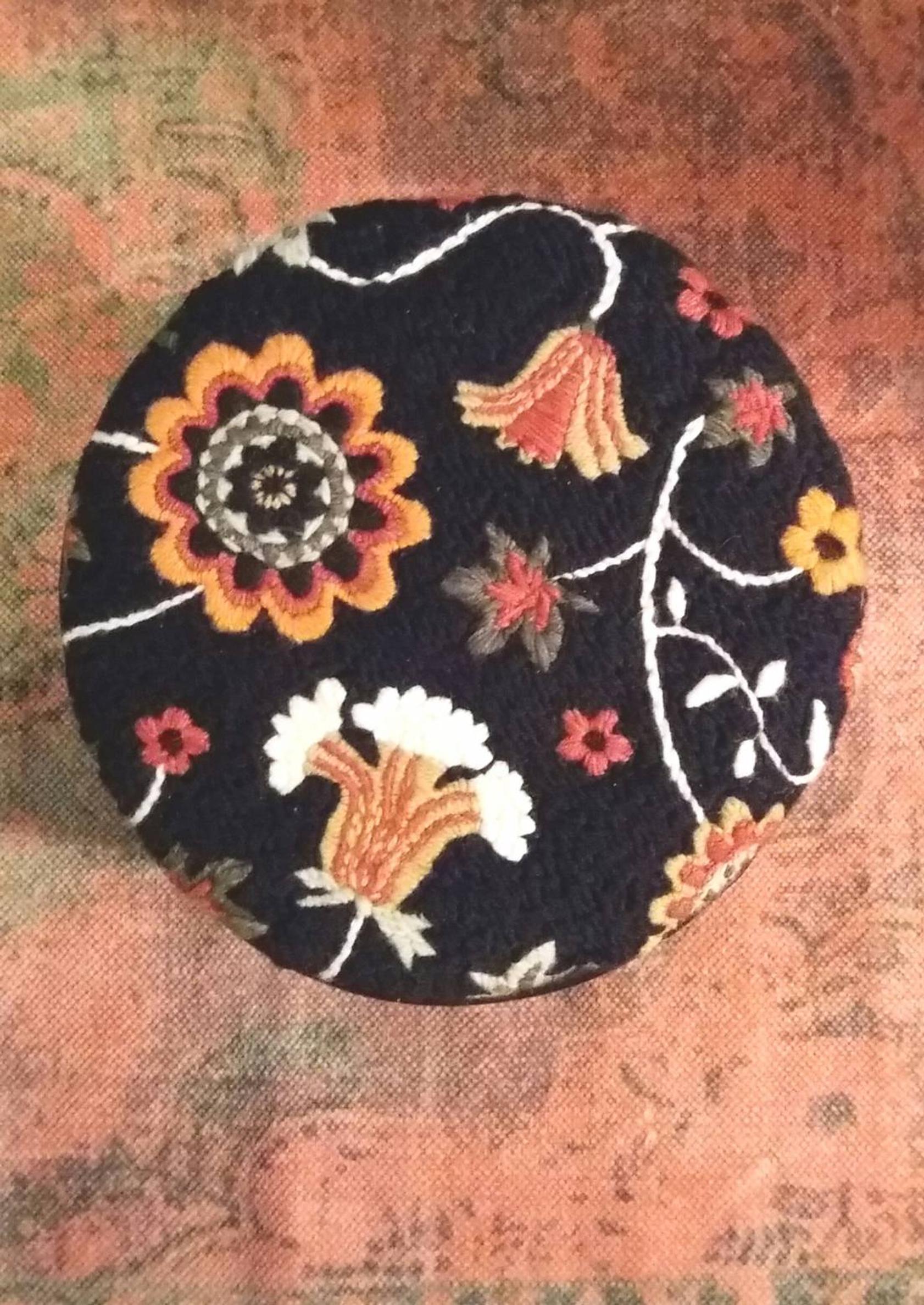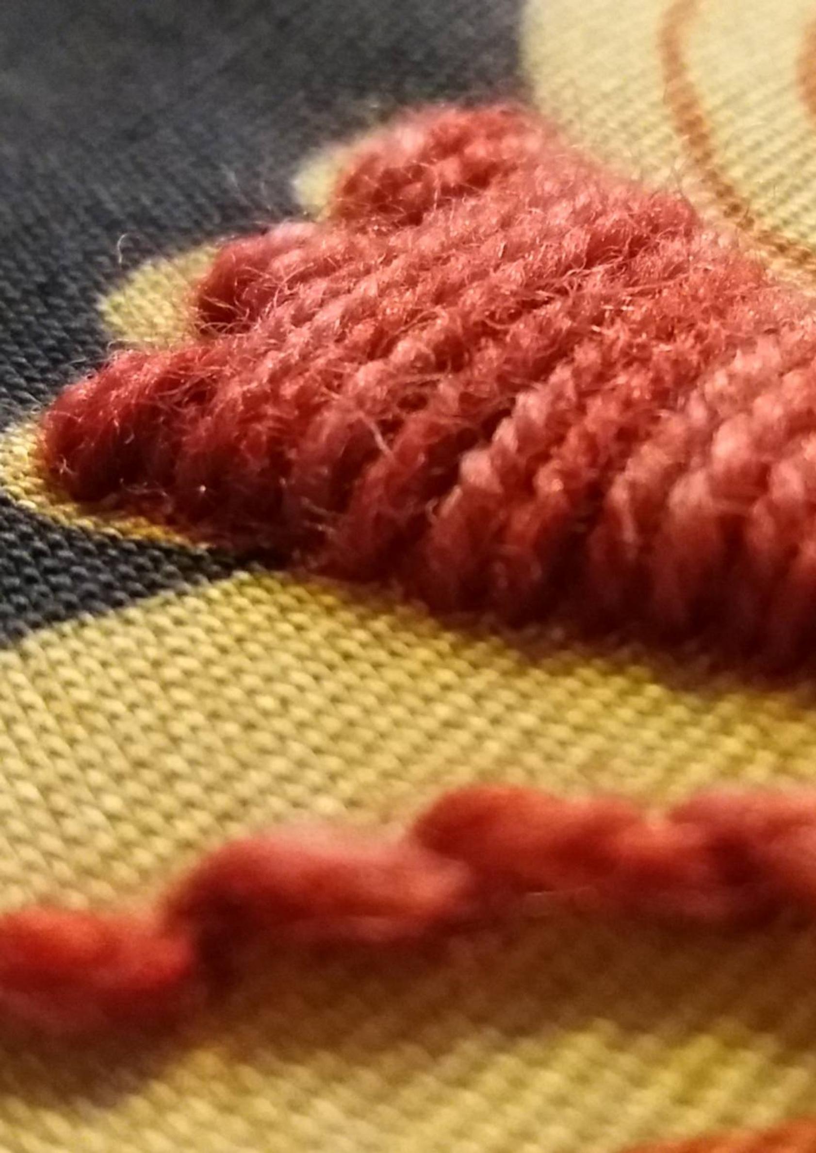 - Mittaa kankaan tarve, koko ja muoto. Kiristä se kirjontakehykseen ja peitä kankaan kuviot yksi kerrallaan suunnilleen samanvärisellä langalla laakapistoin. Tee pistoista korkeintaan reilun sentin mittaisia, jotta ne eivät käytössä veny ja katkea. Aloita ja lopeta vierekkäiset pistot aina hieman eri kohdasta. Jos pistojen päät tulevat liian lähekkäin saattaa kohtaan muodostua reikä, jolloin pistot löystyvät ja irtoavat. Päättele lankojen päät nurjalle kuviolankojen joukkoon.