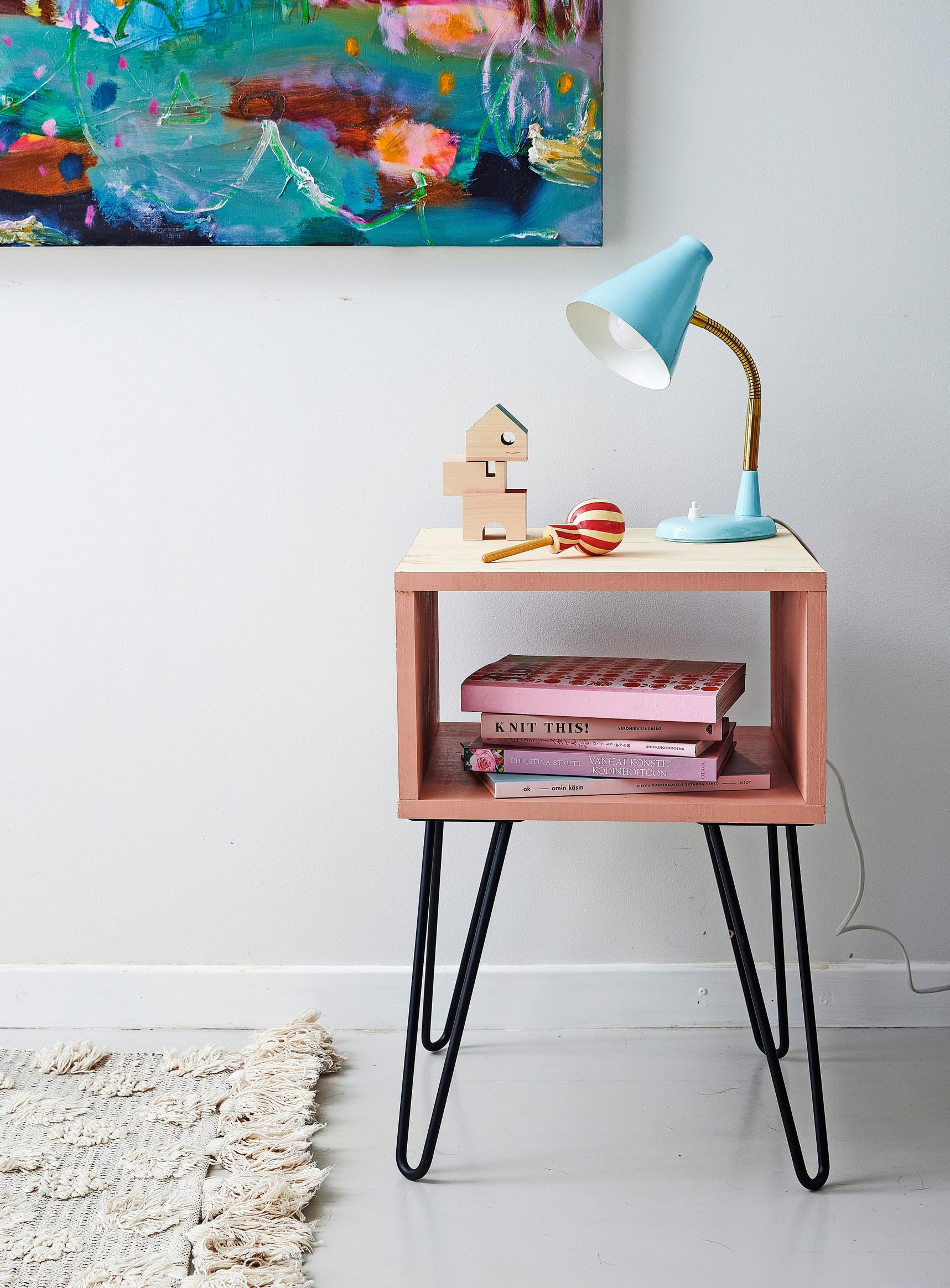 Monipuolinen pikkupöytä valmistuu helposti mäntypuulevystä tai vanerista ja pinnijaloista. Käytä yöpöytänä tai pienenä laskutasona vaikka eteisessä tai olohuoneessa. Apupöytä sopii kaikkialle, mihin sitä kaipaat.
