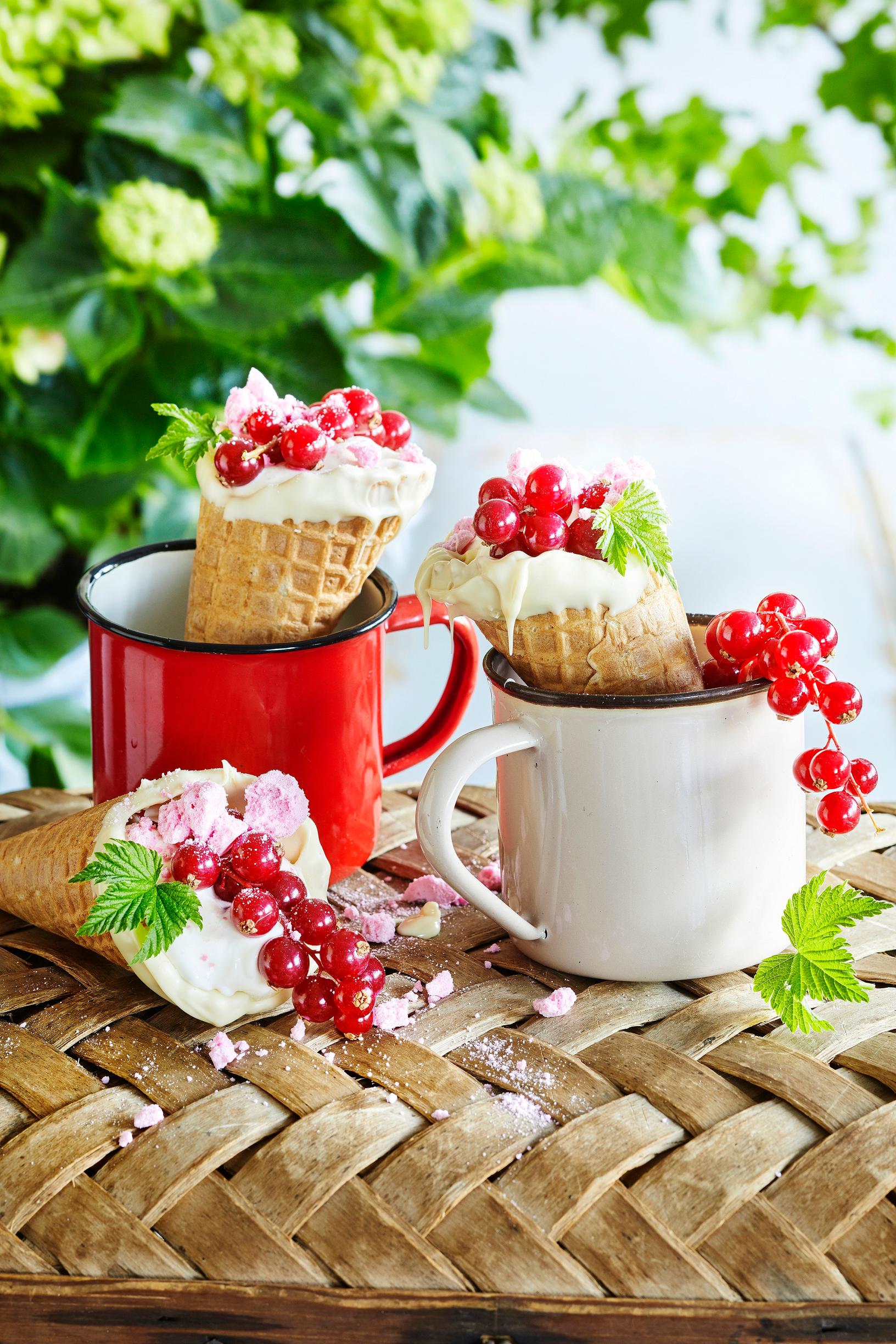 Jäätelöä? Ei vaan punaherukkatötteröitä! Kirpakassa vaahtojälkiruoassa maistuvat marenki, valkosuklaa ja sitruunarahka ja se tarjoillaan hauskasti jäätelötötteröistä.