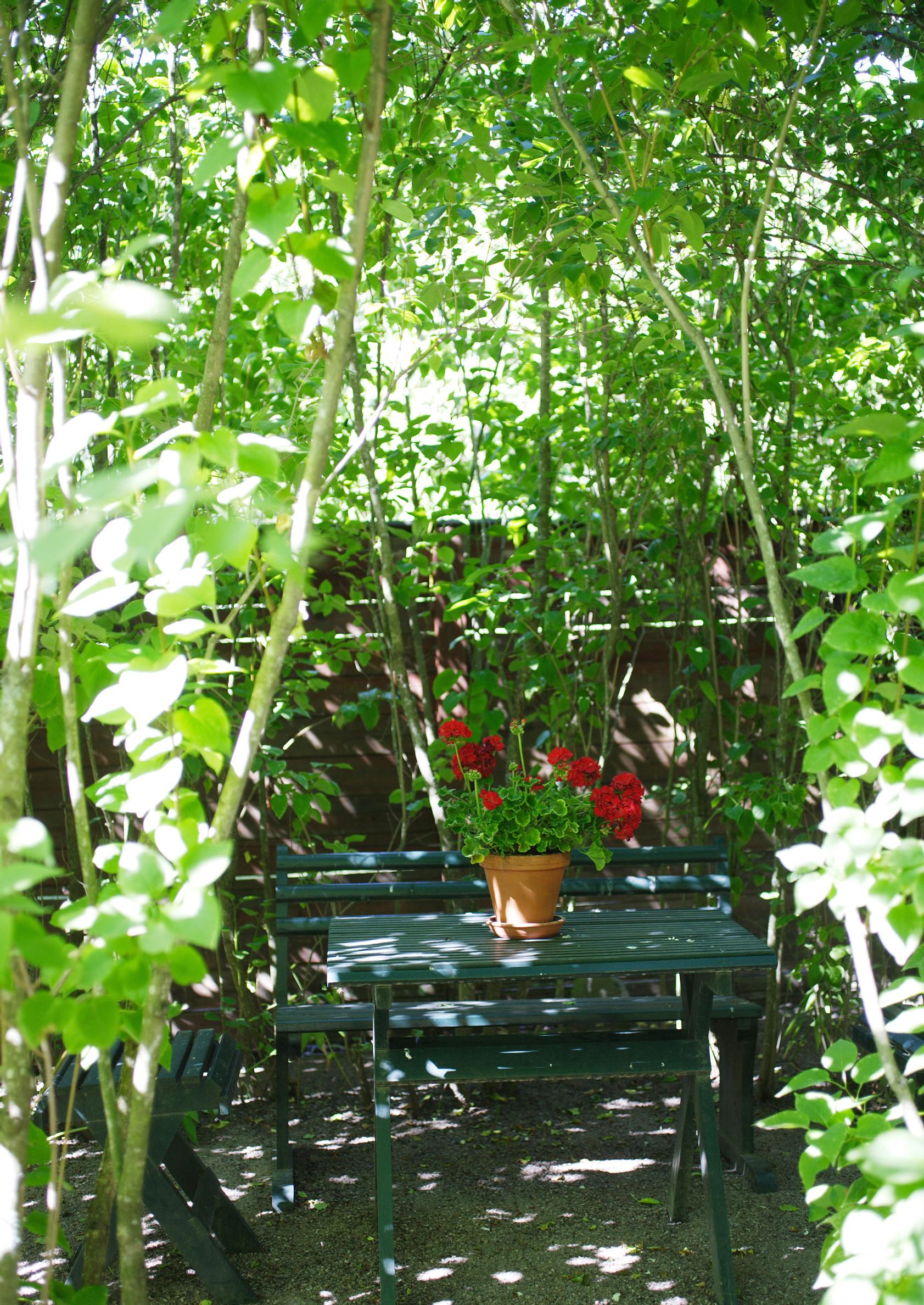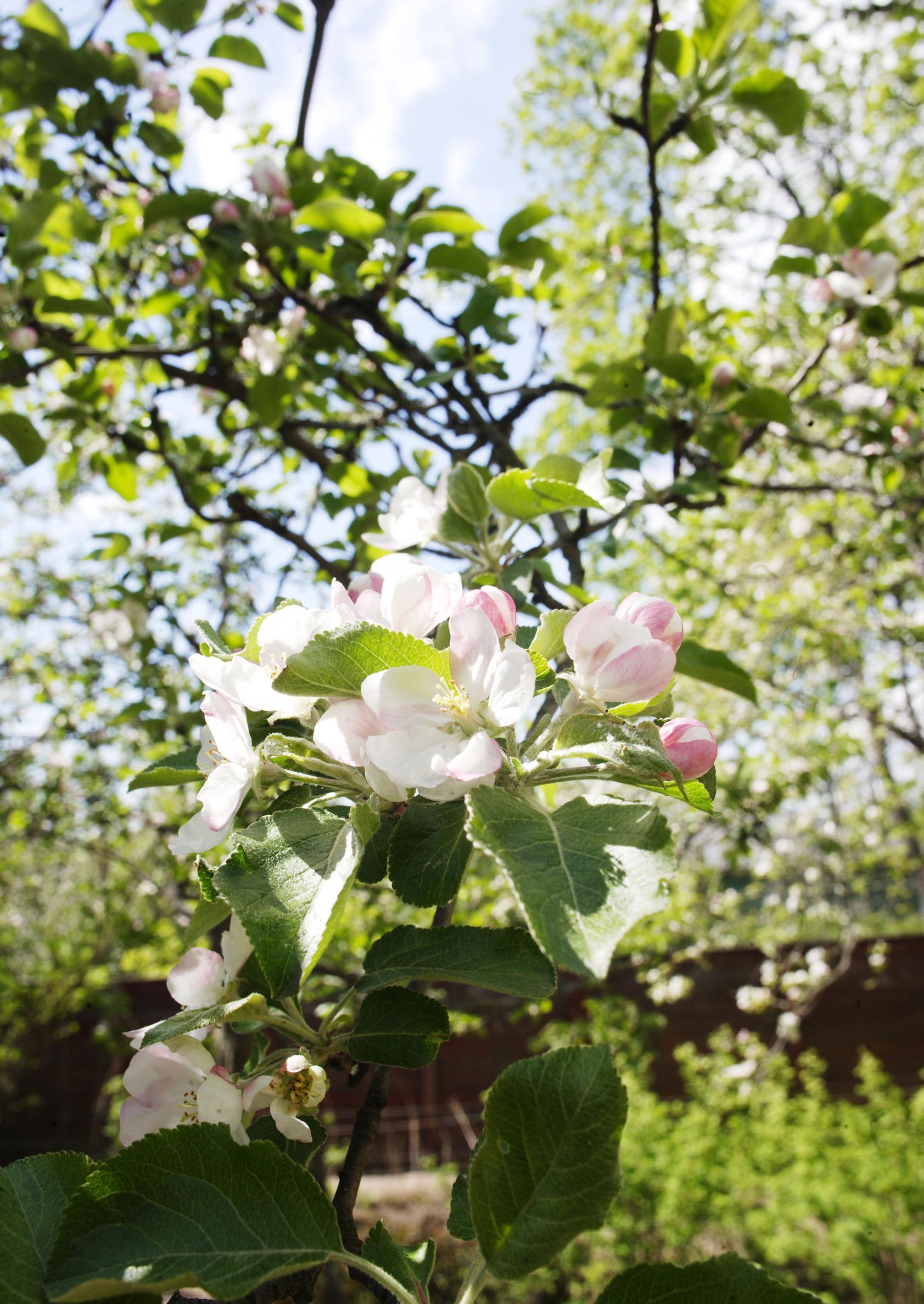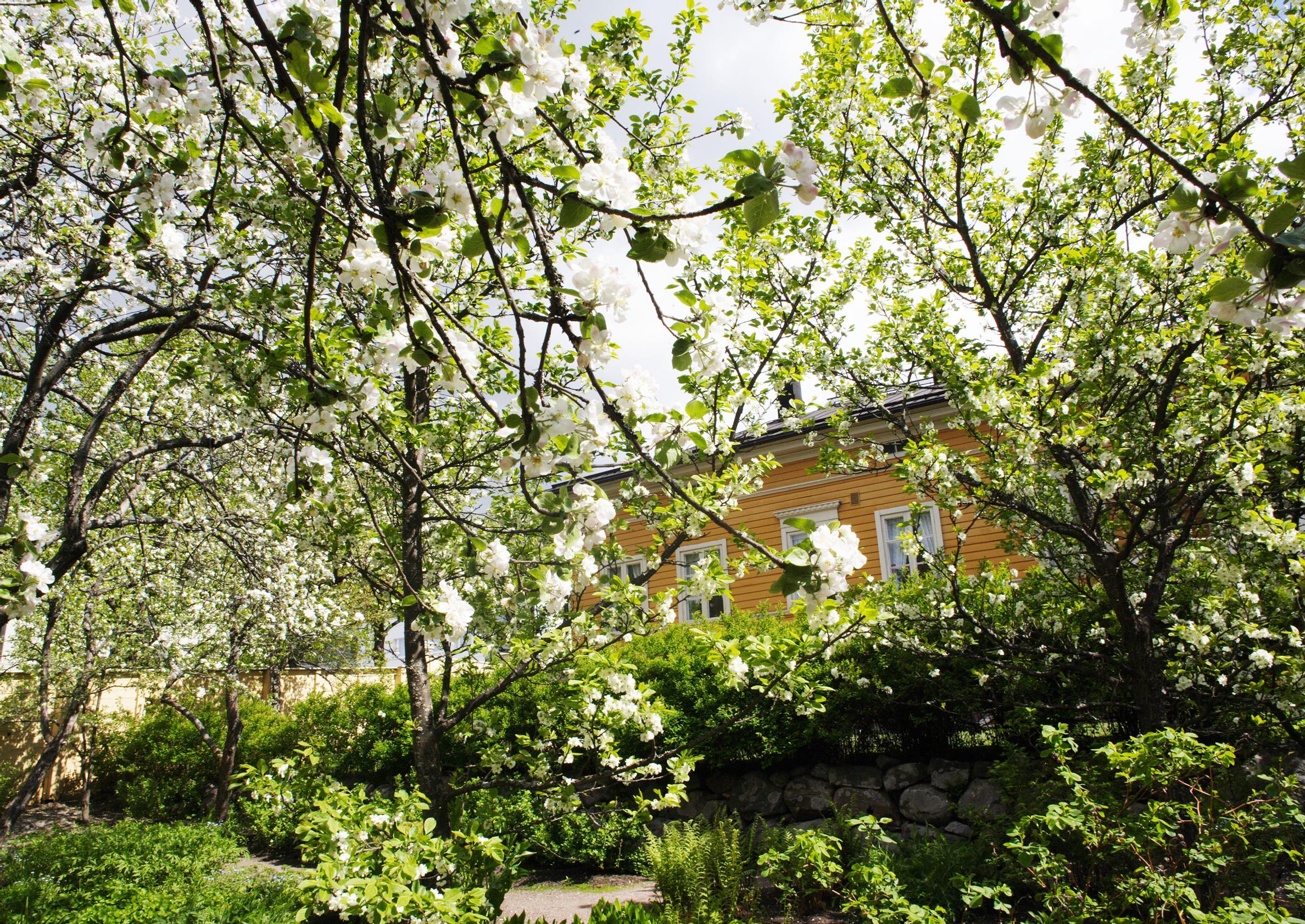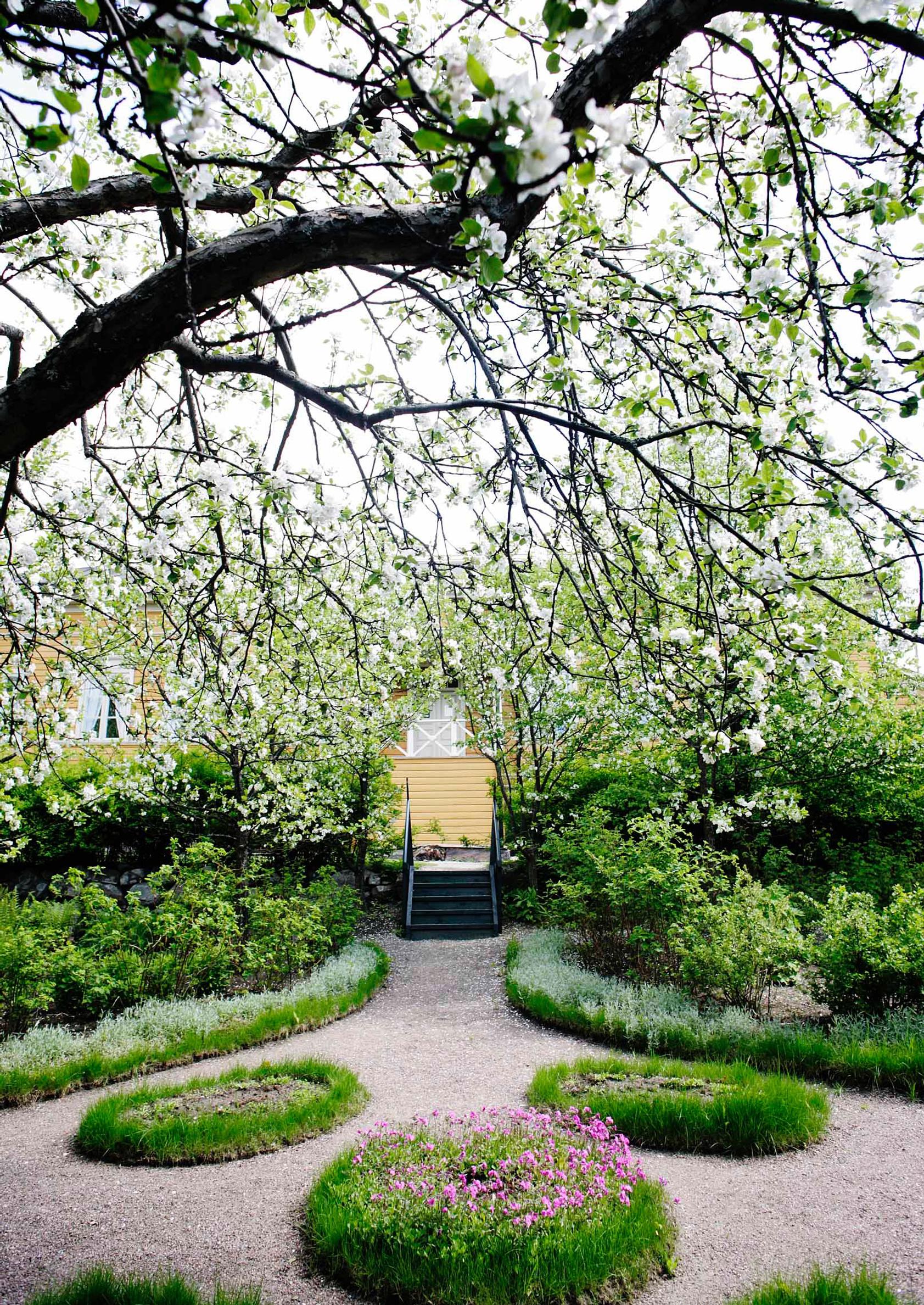 Toistakymmentä vanhaa omenapuuta kattaa käytävät oksistollaan. Ne luovat paikoin sankan, suorastaan viidakkomaisen tunnelman rehevien pensaiden kanssa. Voi vain kuvitella, miten Porvoon sudet, kuten Runebergien villejä veljeksiä nimitettiin, ovat aikanaan kurvailleet kaarteissa, piilotelleet puskien takana ja yllättäneet toisiaan sakean syreenimajan pimennosta. Aikuistuttuaankin Runebergin poikien piti aina päästä äitinsä puutarhaan.