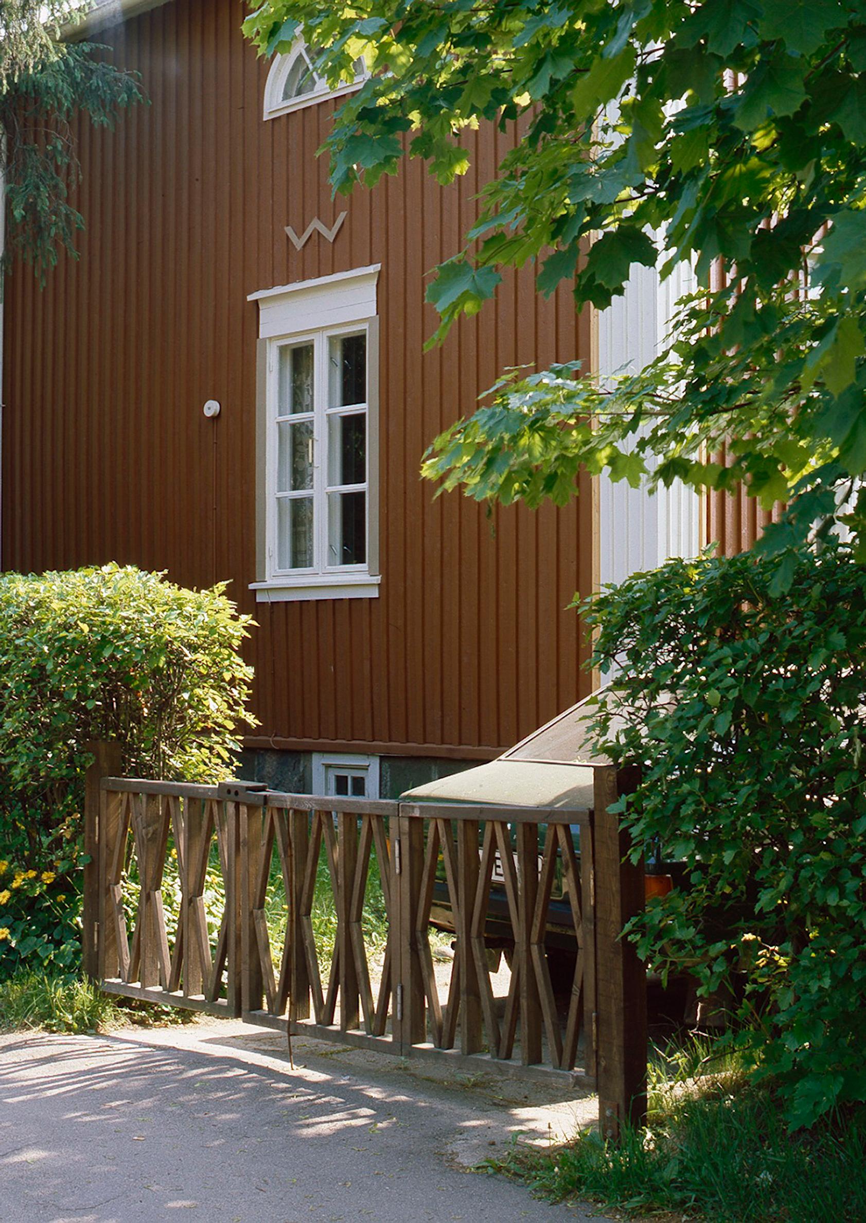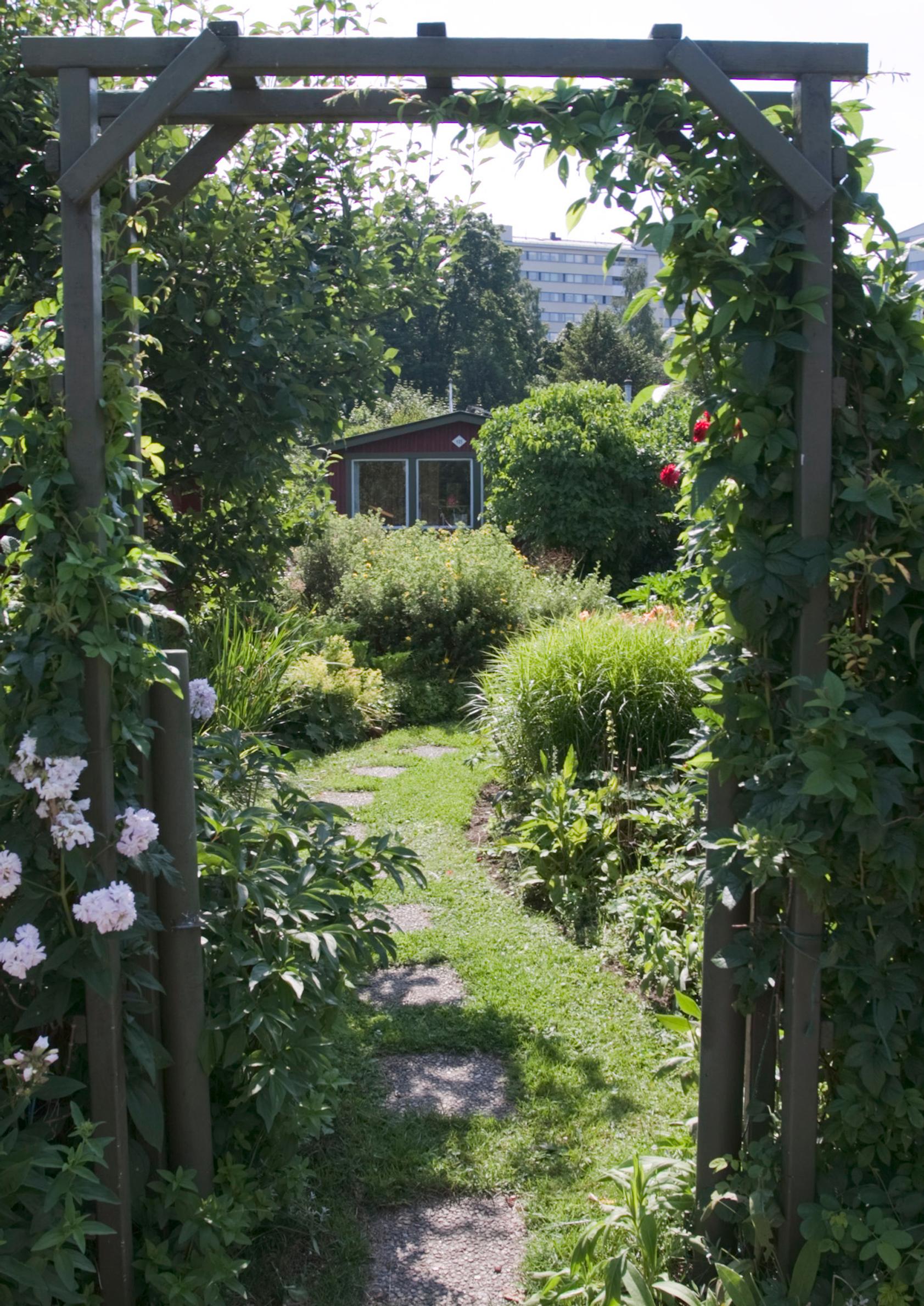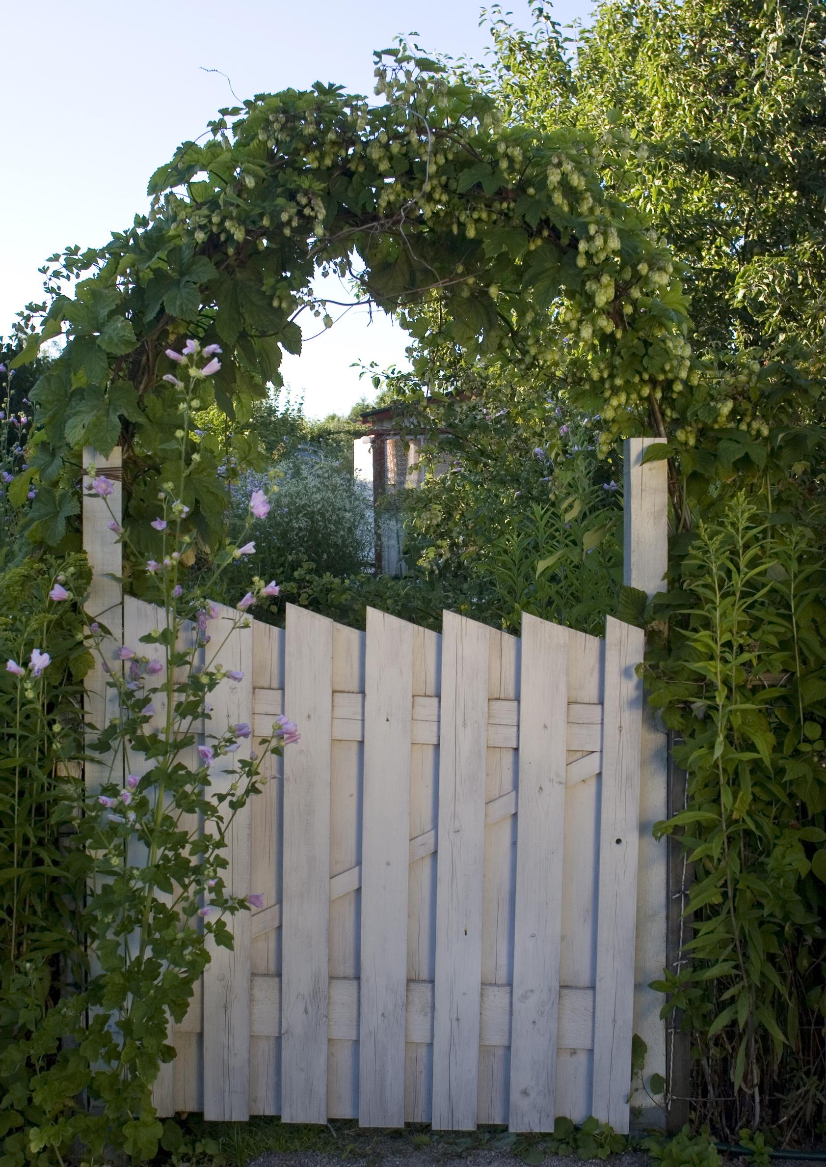 Pystylaudoitettu portti on saanut ylleen köynnöskaaren, johon ruohovartinen humalaköynnös kietoutuu. Pystylaudat sahataan yläpäästä vinoiksi, jotta sadevesi valuu pois eikä jää lahottamaan puuta.