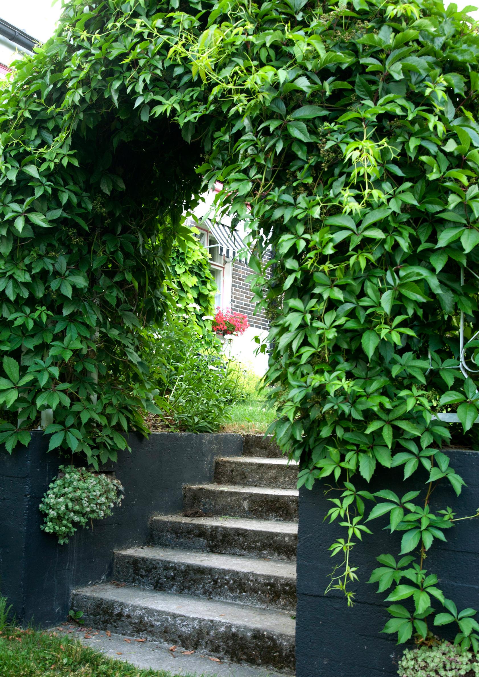 Komea köynnösportti merkitsee näyttävästi siirtymän ylä- ja alapihan välillä. Monivuotinen villiviini painaa vuosi vuodelta enemmän, joten köynnöskaari kannattaa kiinnittää maahan tukevasti.