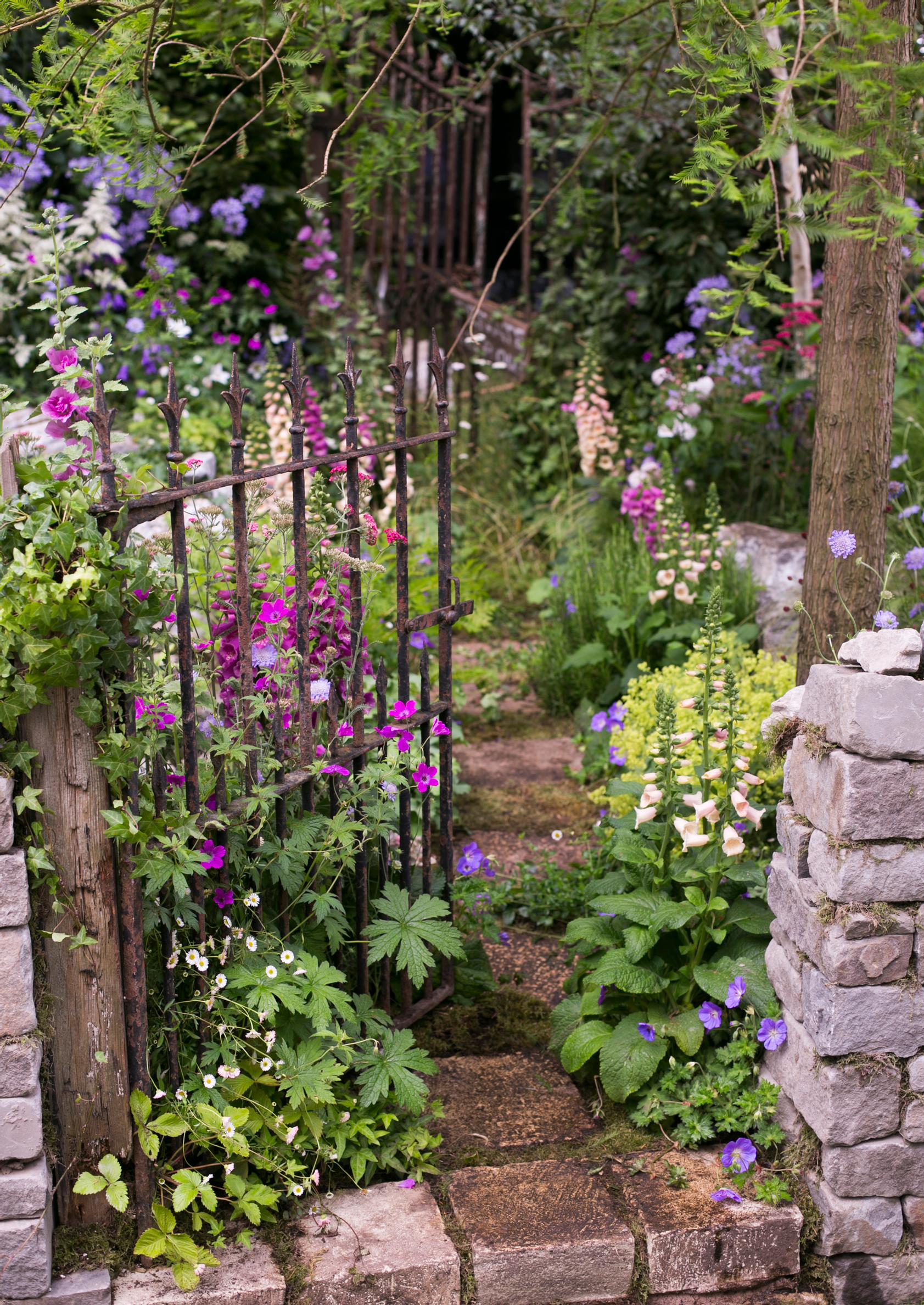 Käsin valmistettu takorautaportti on sepän taidonnäyte ja säilyy sellaisenaan miltei ikuisesti. Saranat on kiinnitetty puutolppaan. Matala kiviaita kruunaa puolivillin puutarhan ilmeen.