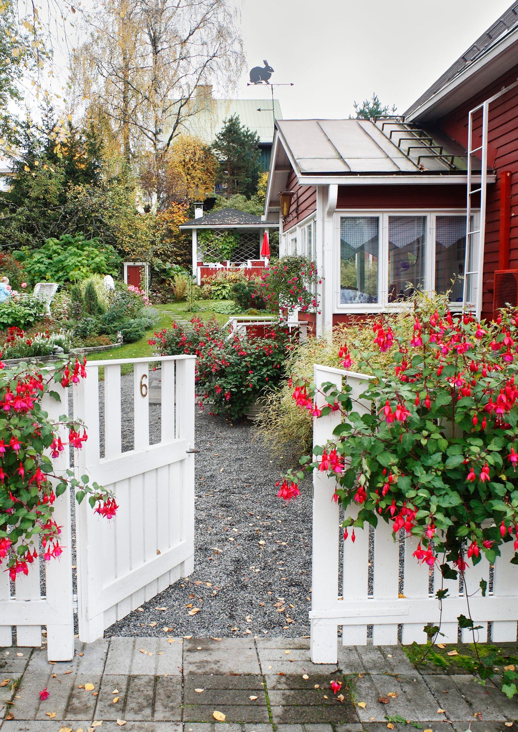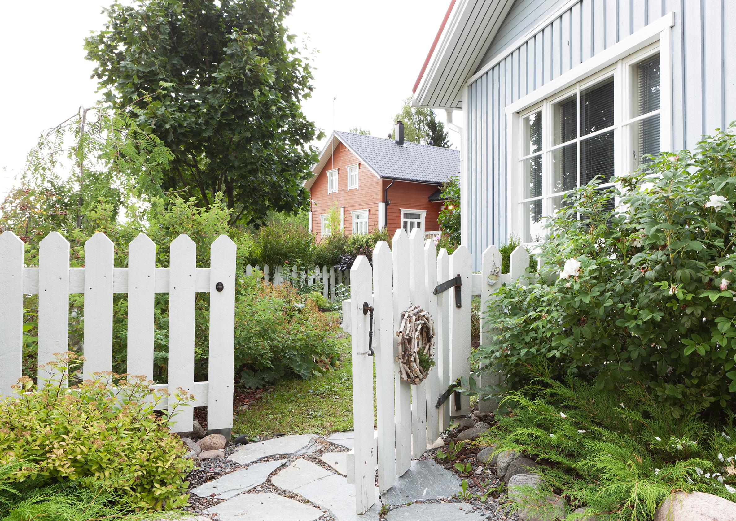 Matala aita ja portti toistavat talon ikkunanpuitteiden valkoista väriä, mikä yhtenäistää ilmettä ja tekee hallitun vaikutelman. Muhkeat kukkalaatikot portin molemmin puolin toivottavat tervetulleeksi.
