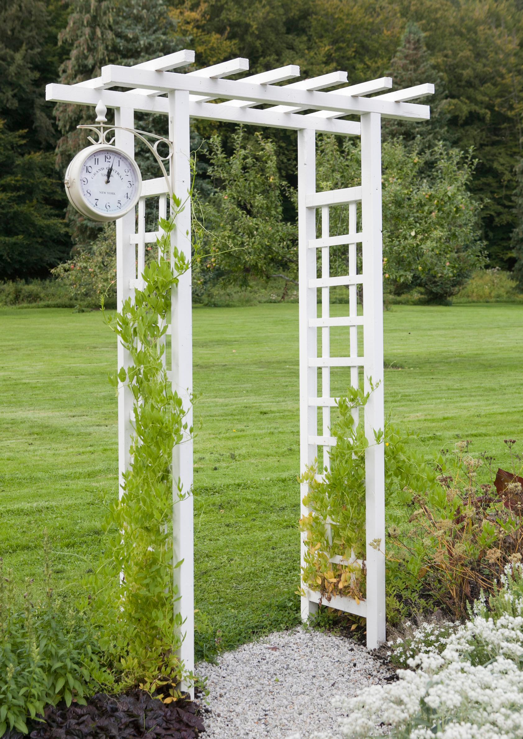 Tässä kevyt pergolaportti, joka toimii kulkuväylänä nurmikentän ja sorapolkuisen muotopuutarhan välillä. Pystyritilöiden verhoiluksi voi istuttaa yksi- tai monivuotisia köynnöksiä.