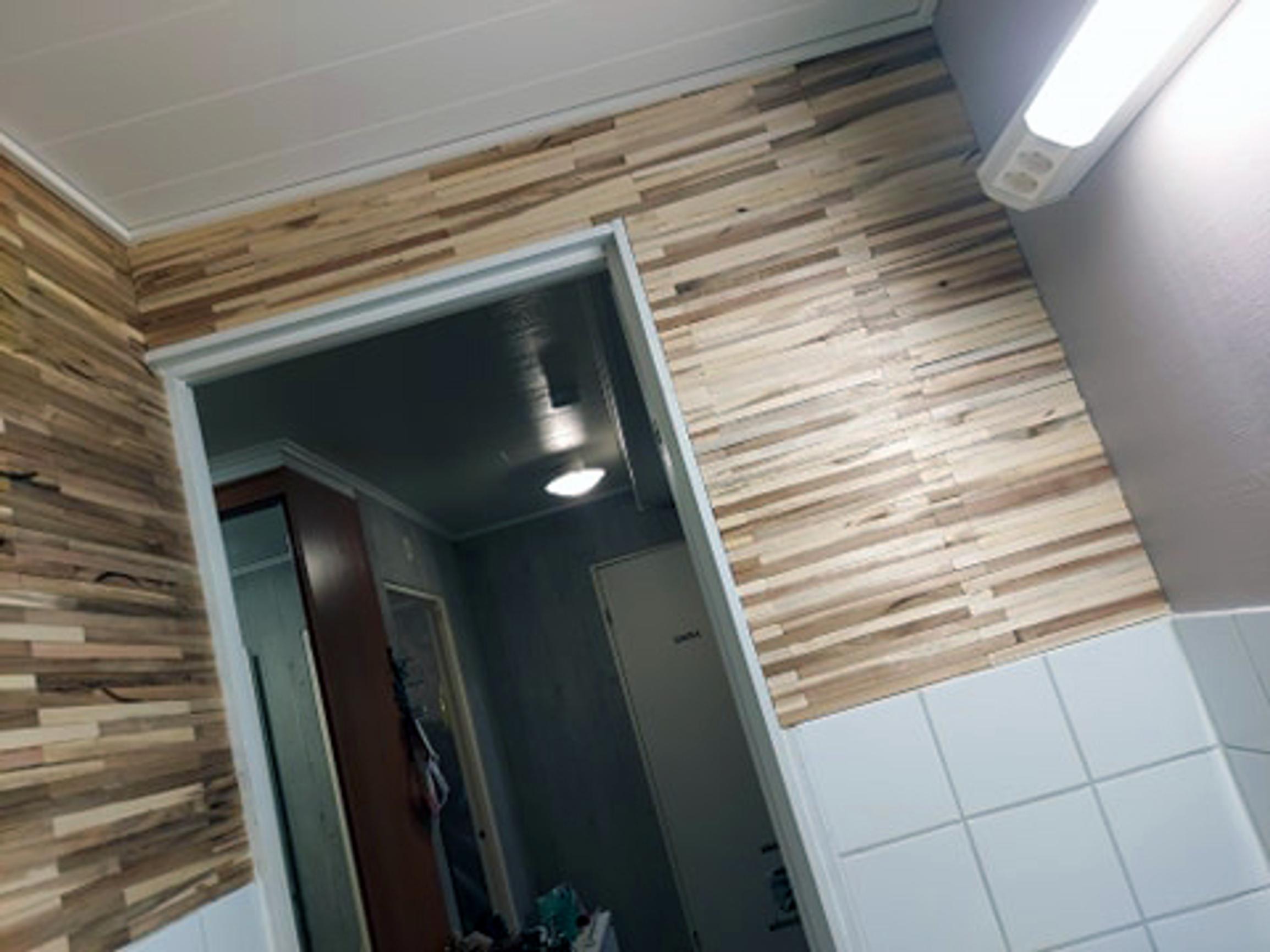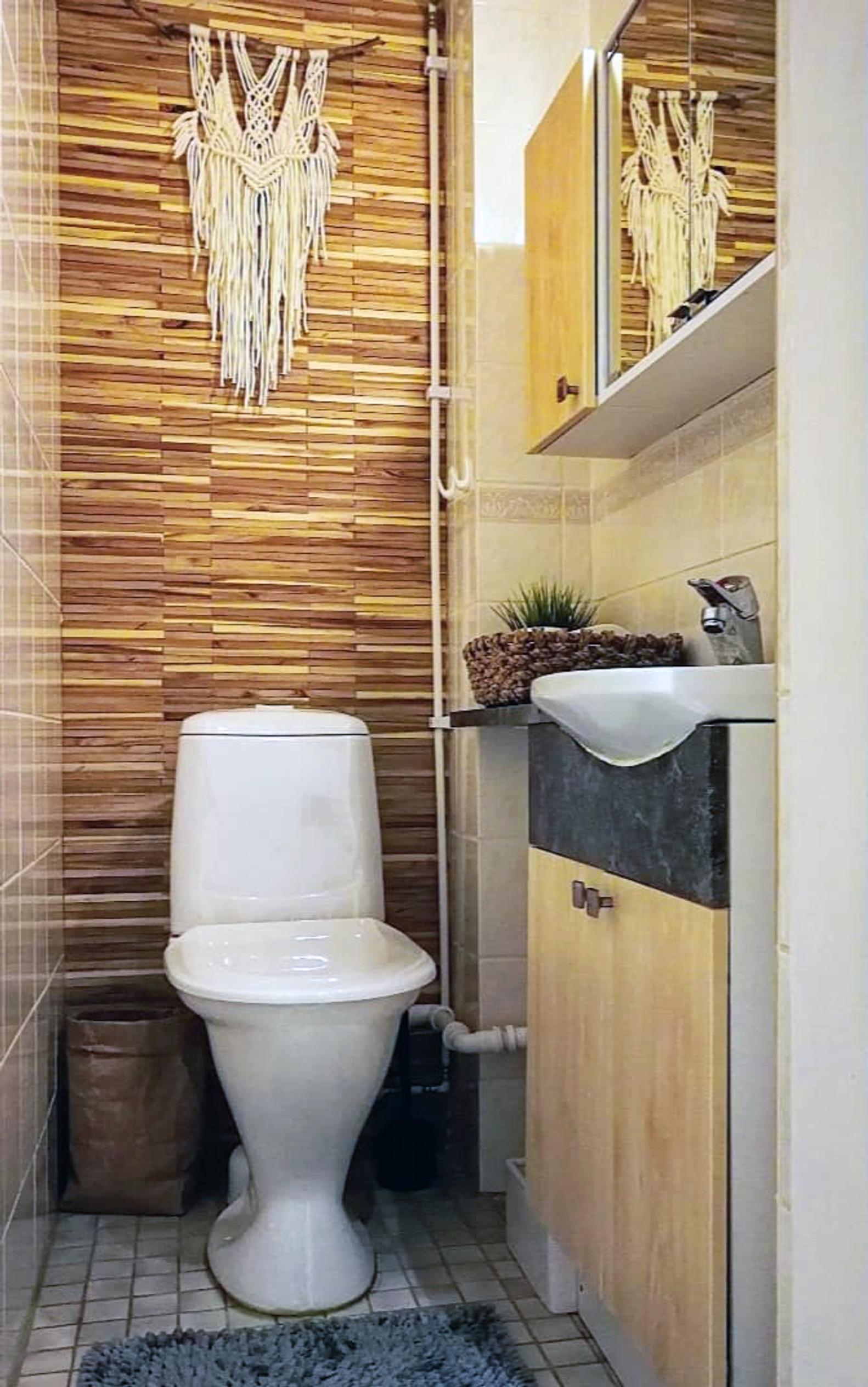 "Wc:n seinän alaosassa on aiemmin kaakelit ja yläosassa lasikuitutapetti, jonka päälle tikut tulivat. Kiinnitin ne No more nails -liimalla suoraan tapettiin. Haastetta toi lähinnä tikkujen epätasainen koko ja se, että osa niistä oli taipunut käyttökelvottomiksi. Lisäksi vanhan talomme seinät eivät ole aivan suorat, joten nurkissa oli haastetta. Vaikeaa tämä ei kuitenkaan ollut, projekti valmistui viikonlopussa.