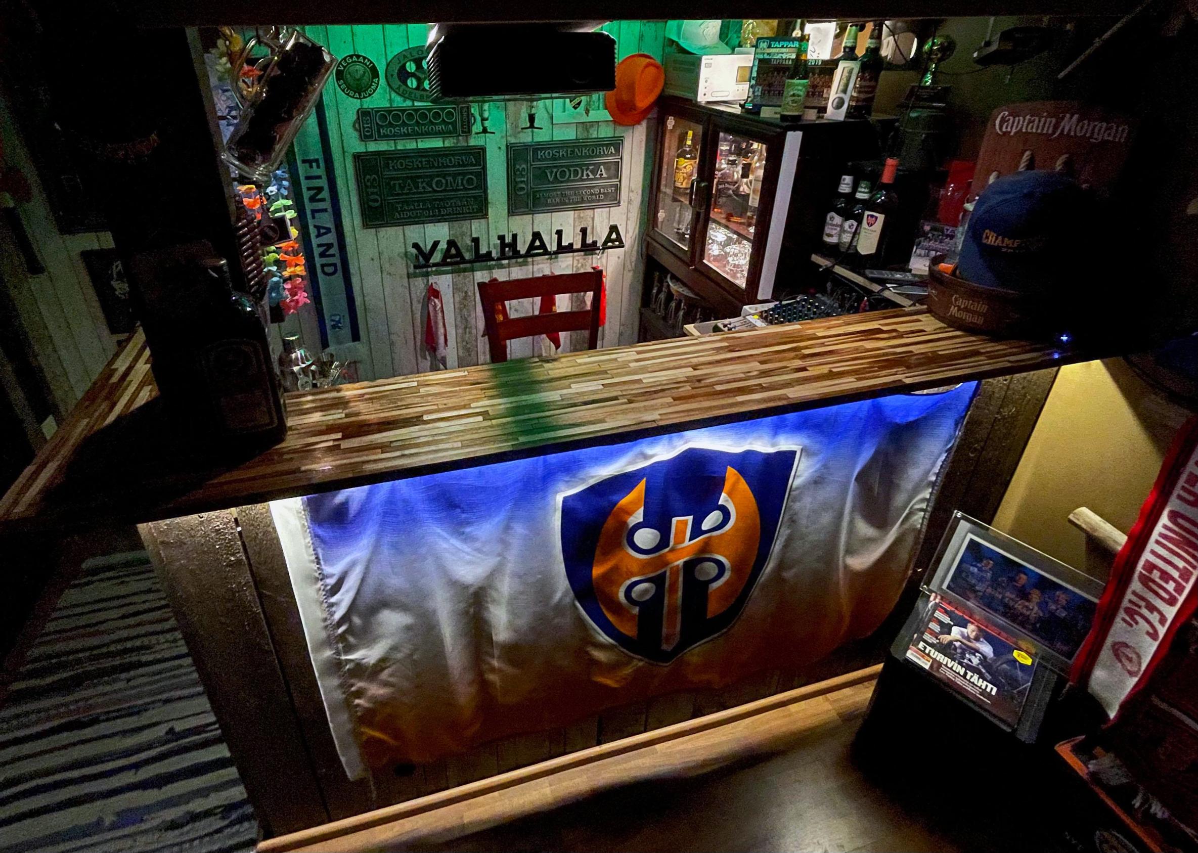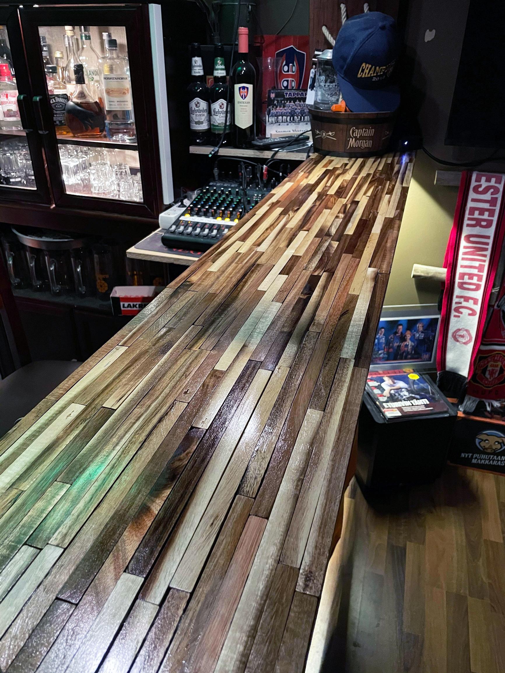 "Olen miettinyt baaritiskin päällystämistä jollain tyylikkäällä materiaalilla jo pidempään. Facebookin DIY-ryhmästä bongasin, että noilla tikuilla on päällystetty vaikka ja mitä. Vanha tiski oli maalattua vesivaneria. Liimasin tikut puhdistettuun maalipintaan tavallisella puuliimalla. Liiman kuivuttua hioin tikkupinnan nauhahiomakoneella. Lopuksi laitoin kolme kerrosta venelakkaa.