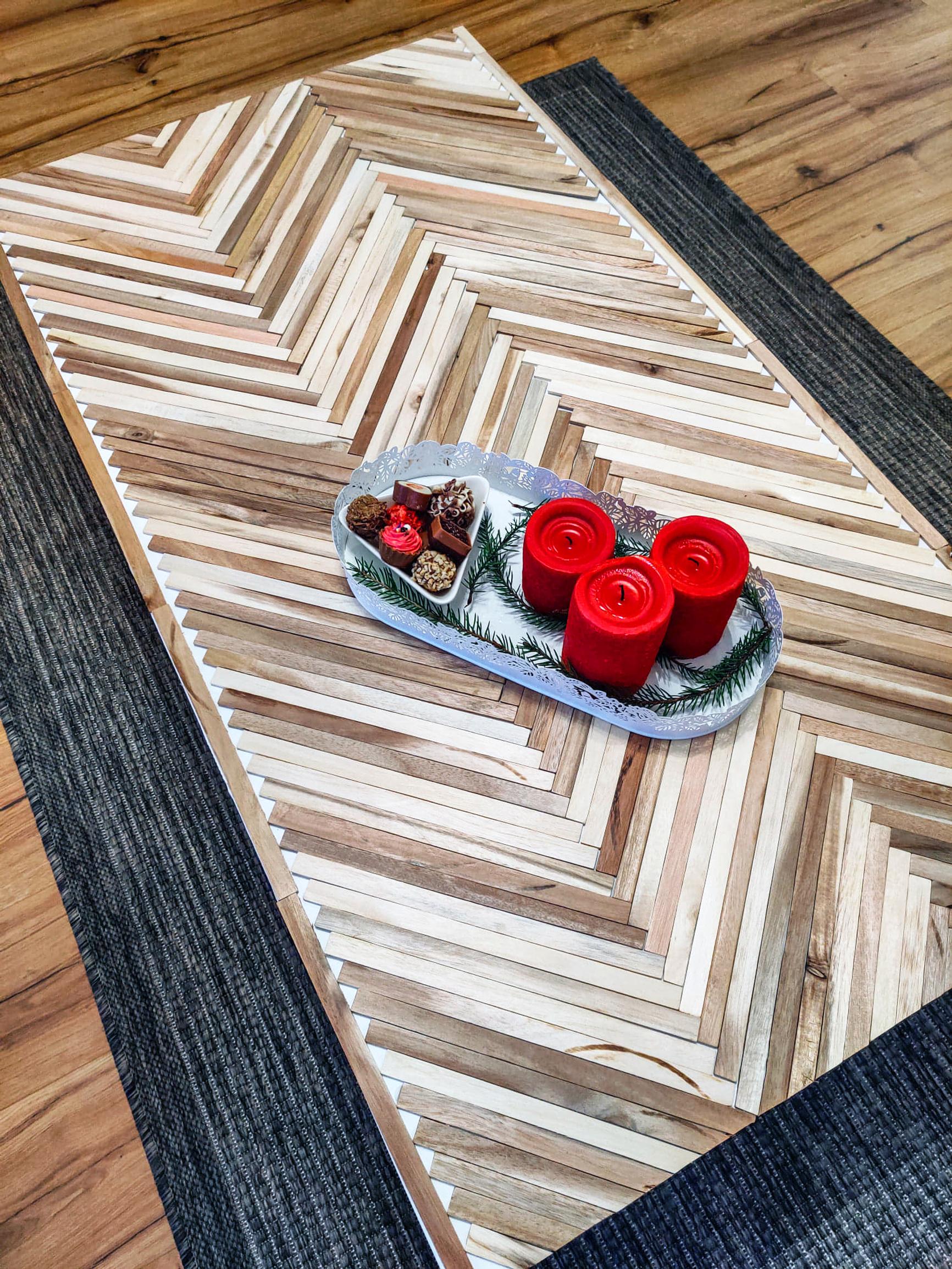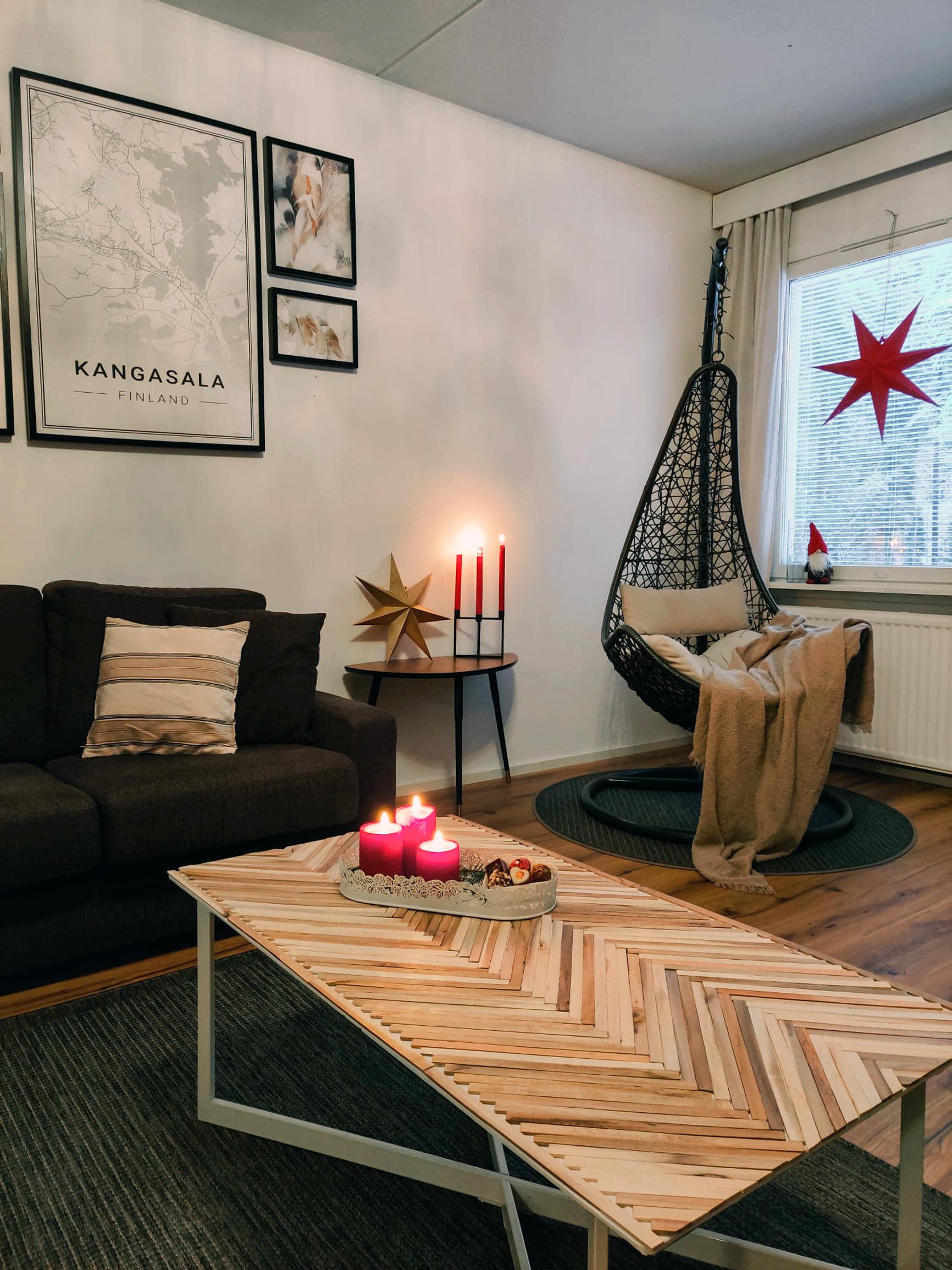"Vanha sohvapöytämme ei sopinut enää sisustukseen. Päätin etsiä ideoita, mitä sille voisi tehdä. Näin Instagramissa kuvan, kuinka joku oli päällystänyt kaapin ovet pienillä tikuilla. Siitä se idea sitten lähti.