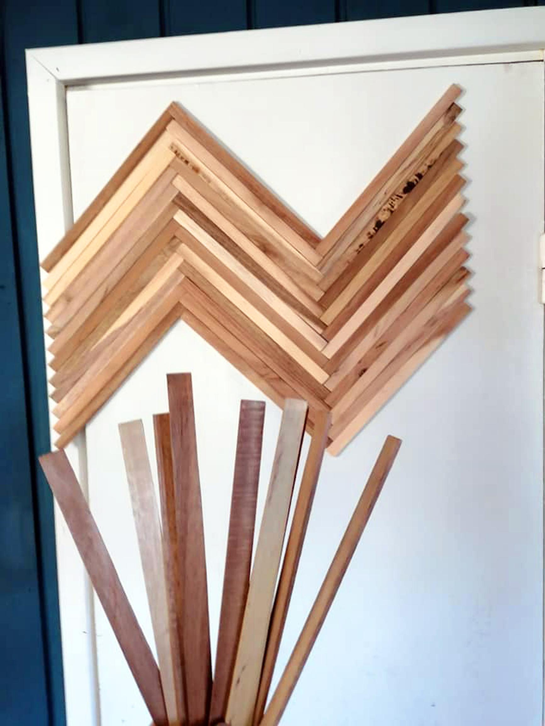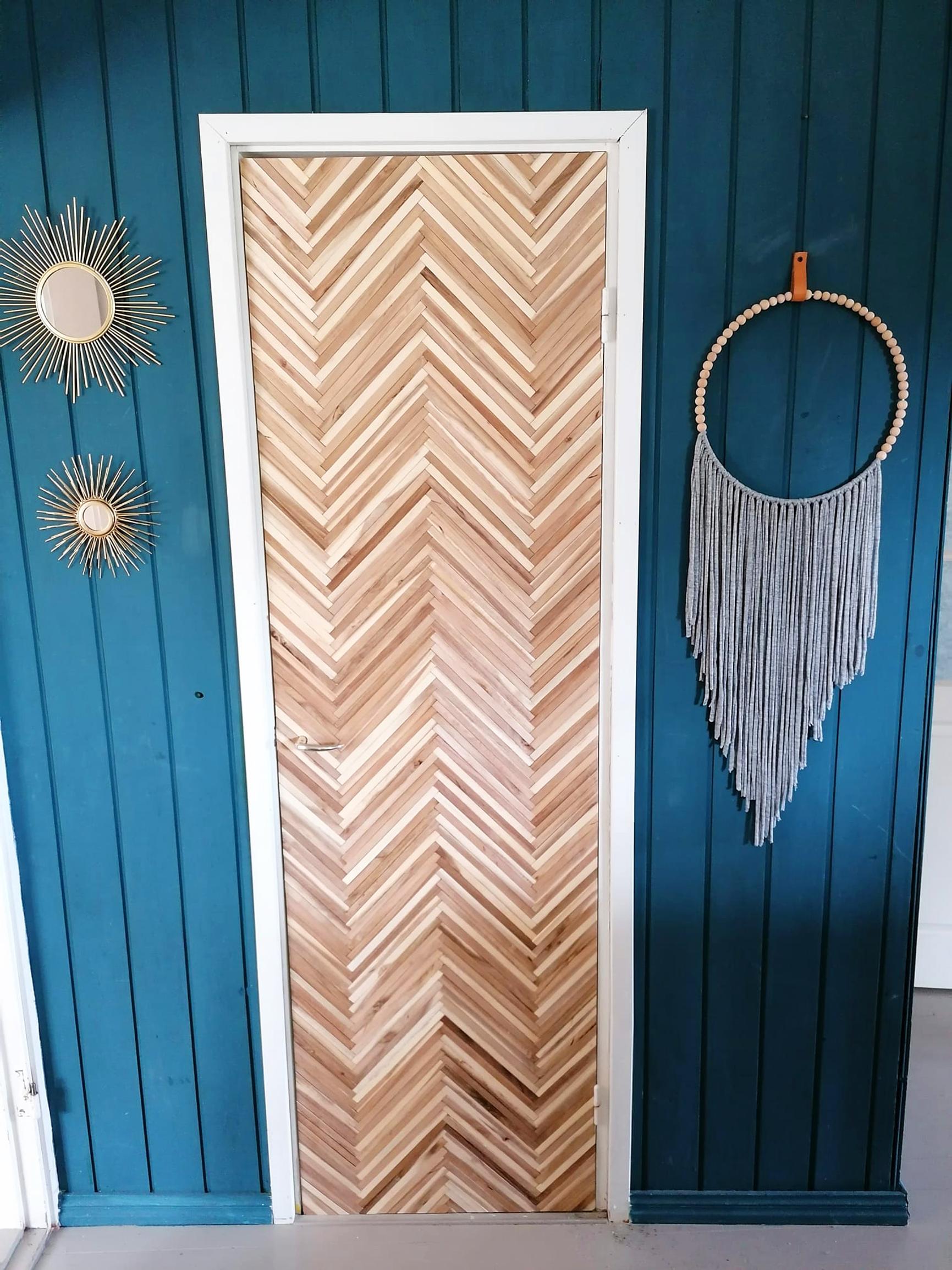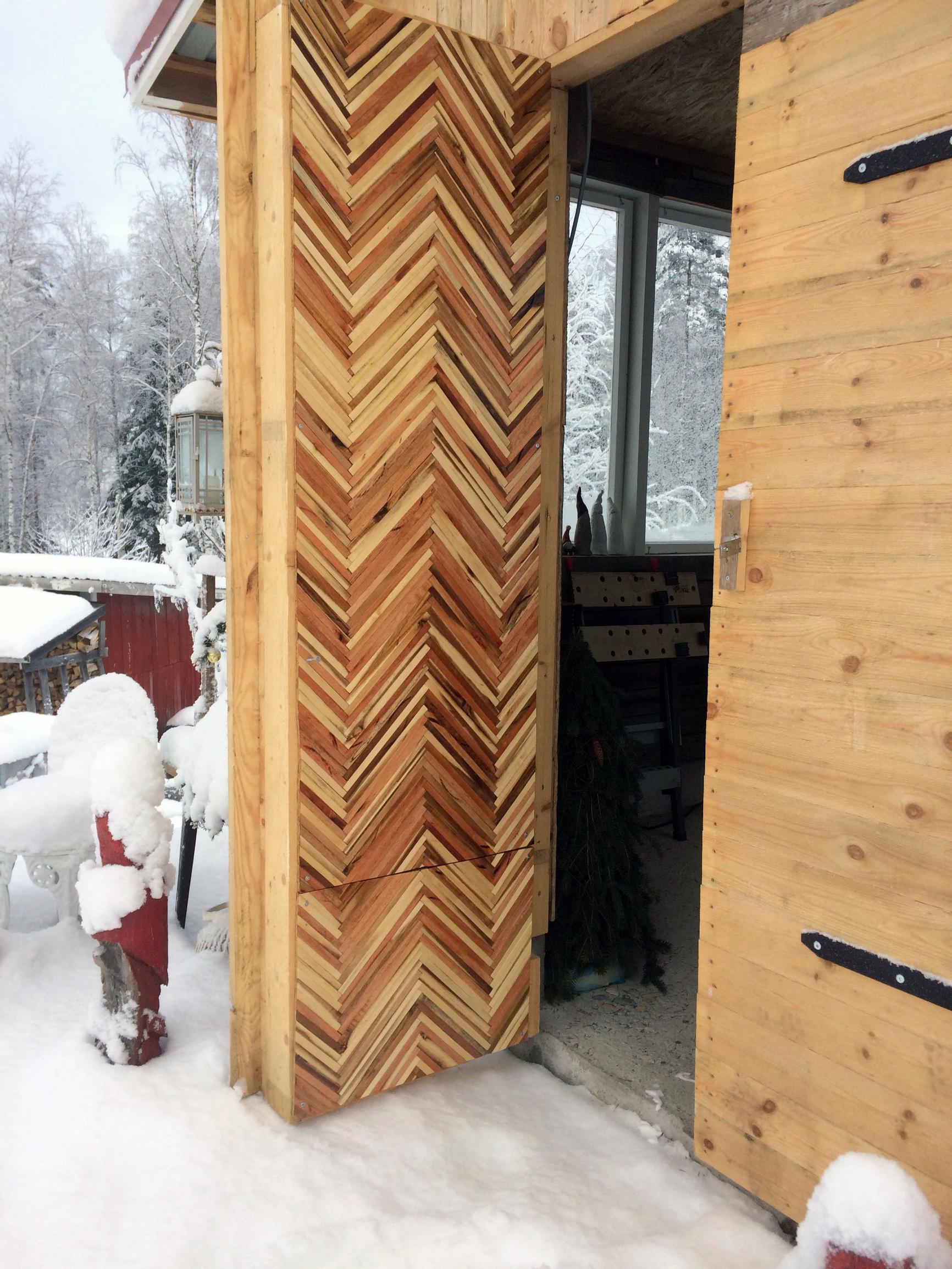 "Huomasin netissä, että puutikuilla on päällystetty kaikenlaista. Sain idean, että niillä voisi koristaa kesäkeittiömme pariovet. Tikut on liimattu erillisille OBS-levyille. Pyyhin levyt kostealla sienellä, hioin kevyesti ja pyyhin nihkeällä pöly pois. Jotta kalanruotokuvion linjat pysyisivät suorassa, piirsin levyyn apuviivat.