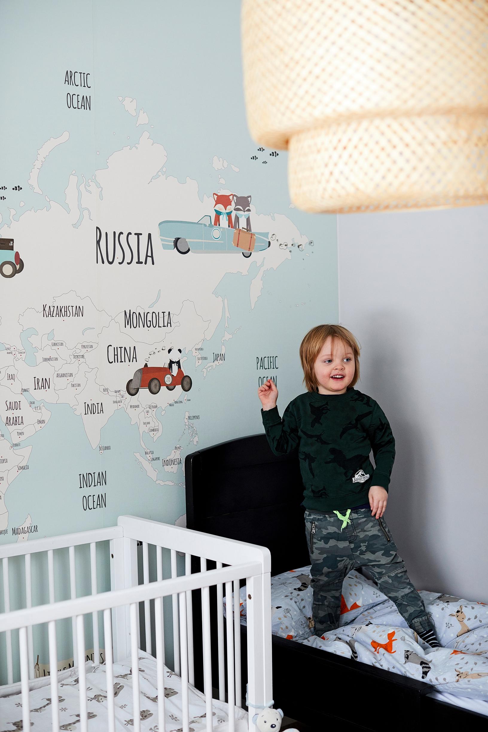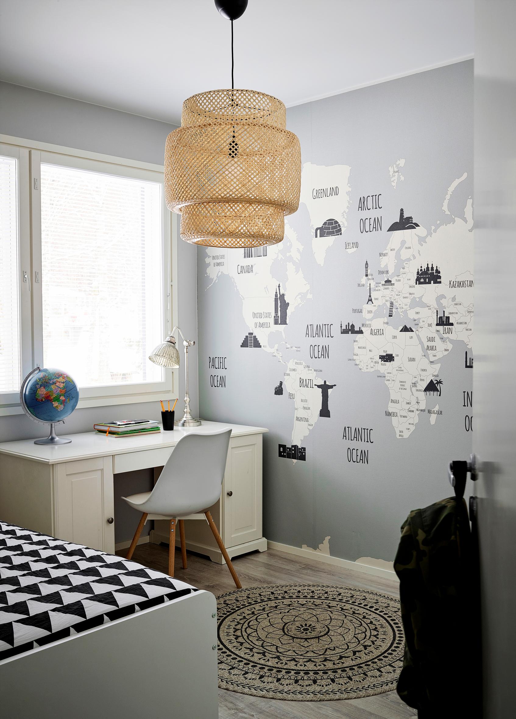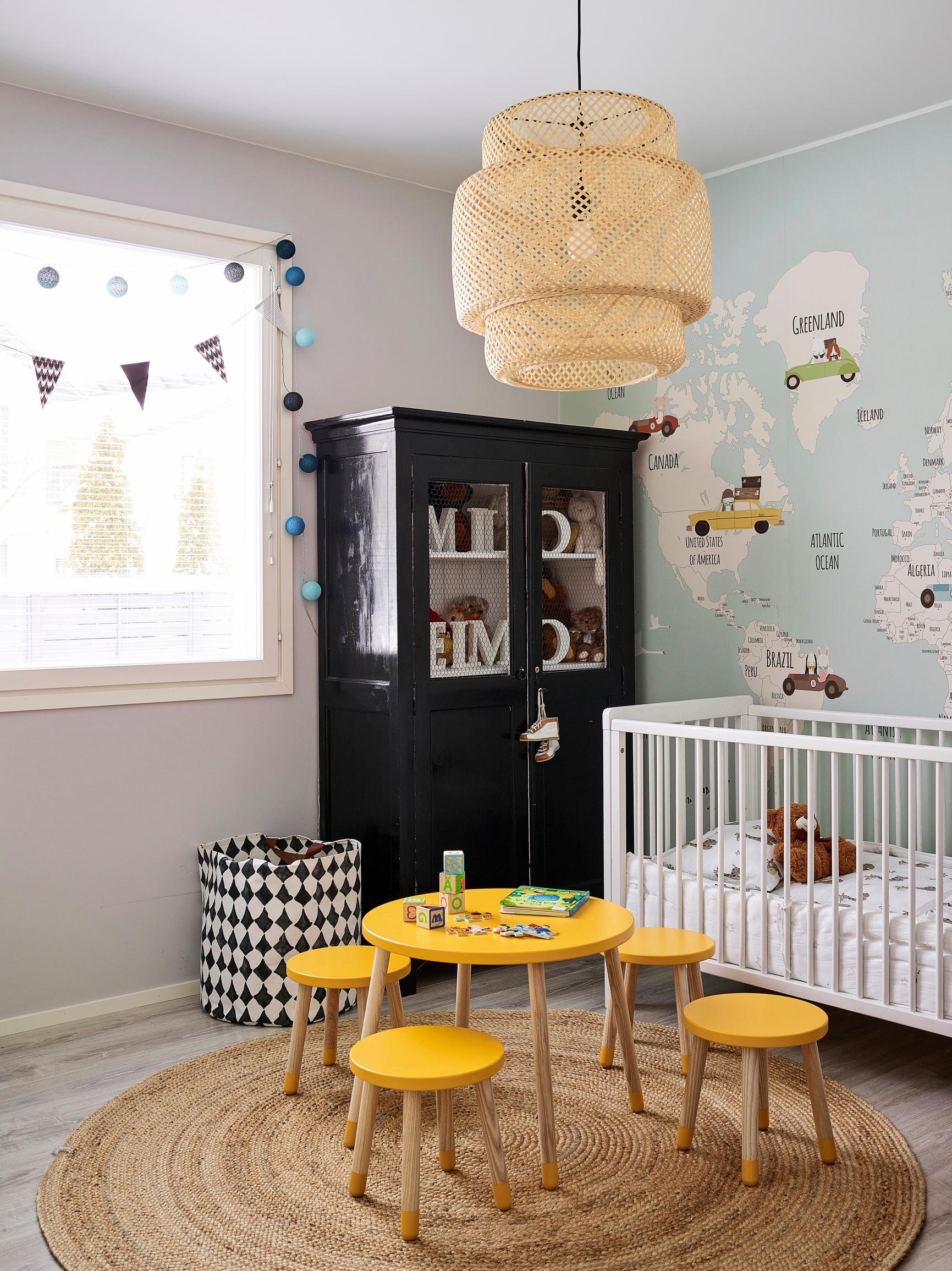 Edellinen kotimme oli hyvin valkoinen, mutta tänne halusin enemmän sävyjä. Väriskaala on lämpimämpi ja rohkeampi. Kaikissa seinäpinnoissa on joko sävy tai tapetti, ja koko sisustuksen ideana on se, että olen halunnut välttää valkoista. Valitsin seiniin harmaan ja ruskean sävyjä ja sisustukseen lisäksi mustaa. Aiemmissa kodeissa olen tehnyt huomattavasti varovaisempia ratkaisuja. Täällä työhuoneen ja lastenhuoneen tapetit ovat erityisen rohkeita. Vaihdetaan sitten, jos kyllästytään.