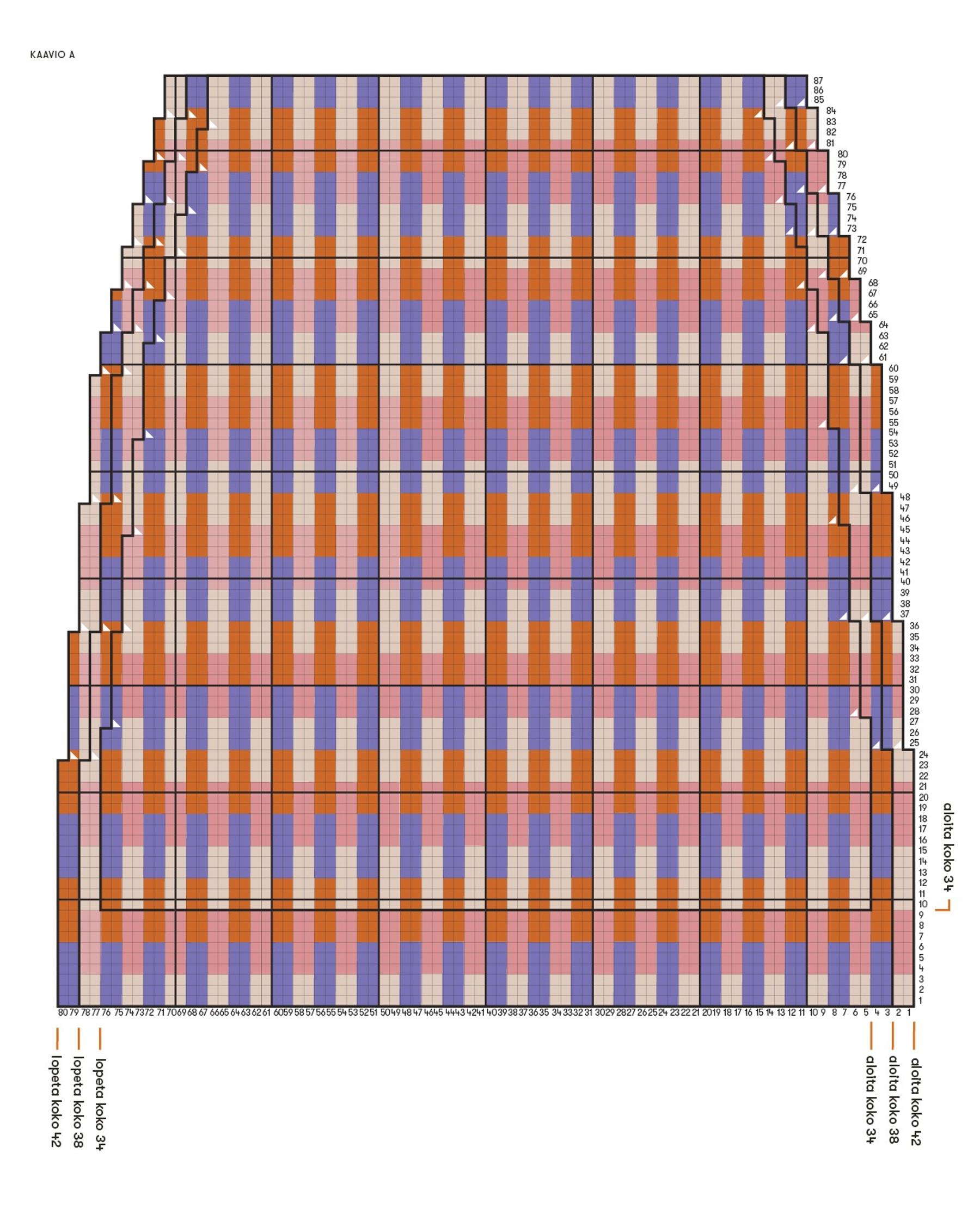 Aloita sitten kirjoneule kaavion A 10. (1., 1.) krs:lta aloittaen 5. (3., 1.) silmukasta. Neulo s:t 5–76 (3–78, 1–80). Neulo kaavion krs:t 10–87 (1–87, 1–87) ja tee samalla kavennukset kaavioon merkityissä kohdissa. Kavennukset ovat tarkoituksella eri krs:lla, jotta ne tulevat peräkkäin pohkeen kohdalle. Kaavion lopussa on 52 (56, 60) s. Tasaa s:t puikoille niin, että krs:n vaihtumiskohta säilyy samassa kohdassa, mutta joka puikolla on 13 (14, 15) s.