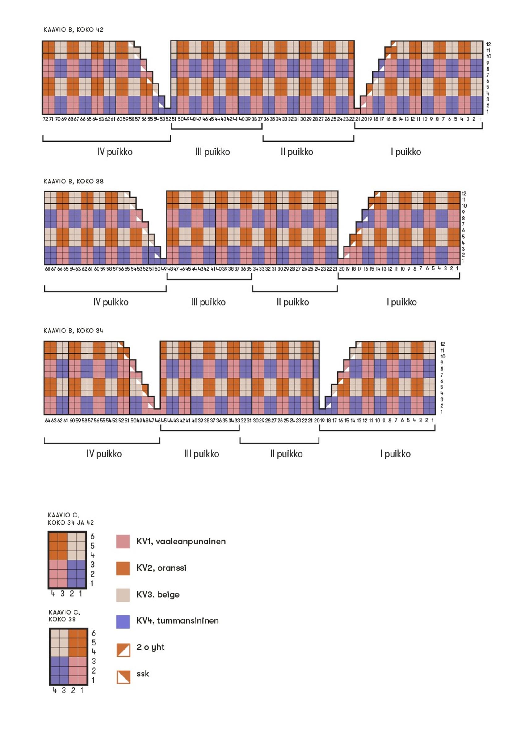 Jatka kirjoneuletta C-kaaviosta. Mallikerta toistuu krs:lla 13 (14, 15) krt. Toista kaavion kirjoneuletta, kunnes pohjan pituus on 17 (20, 22) cm tai pikkuvarvas peittyy ja olet viimeksi neulonut 3. tai 6. krs:n. Neulo vielä 1 krs KV1:llä ja kärki loppuun samalla värillä.